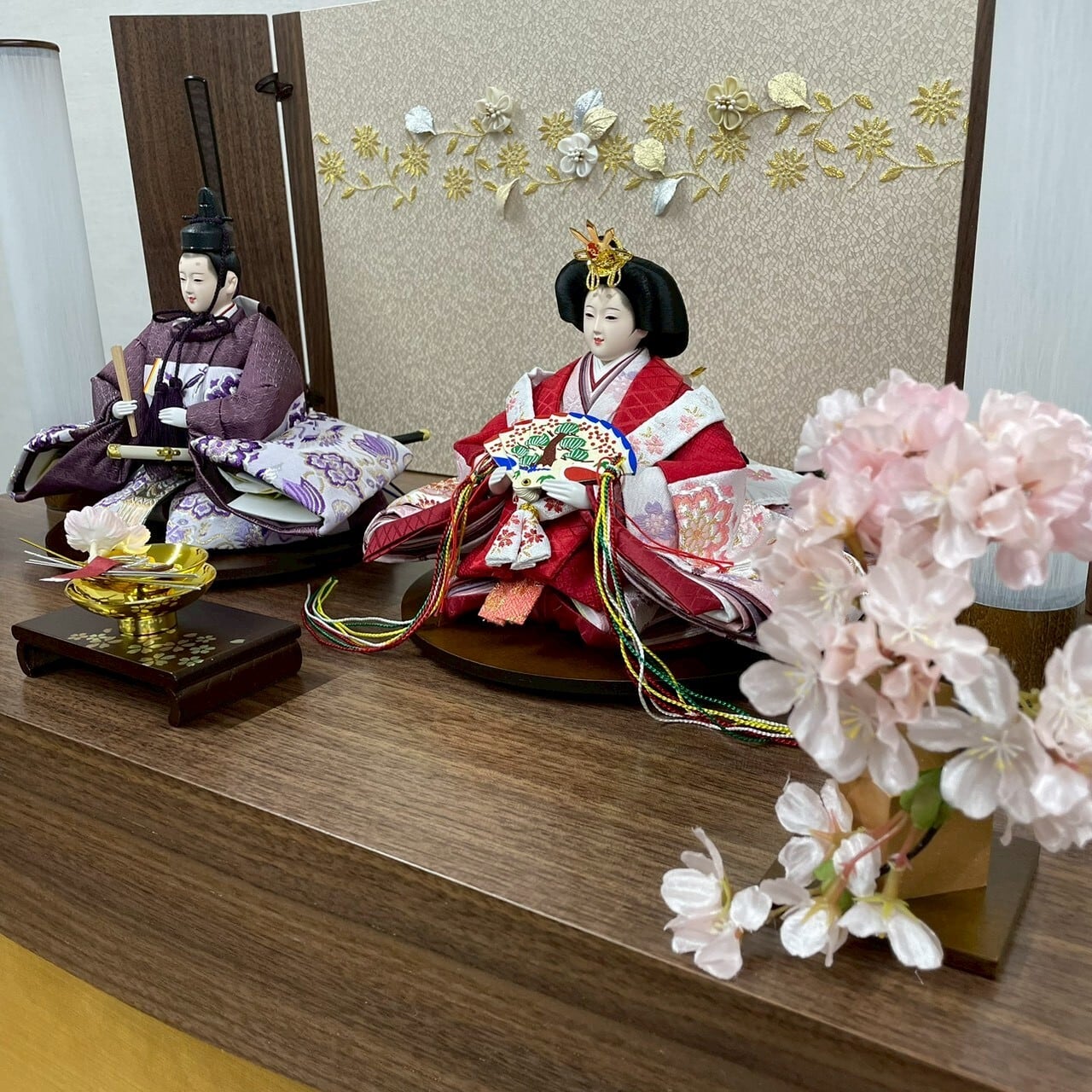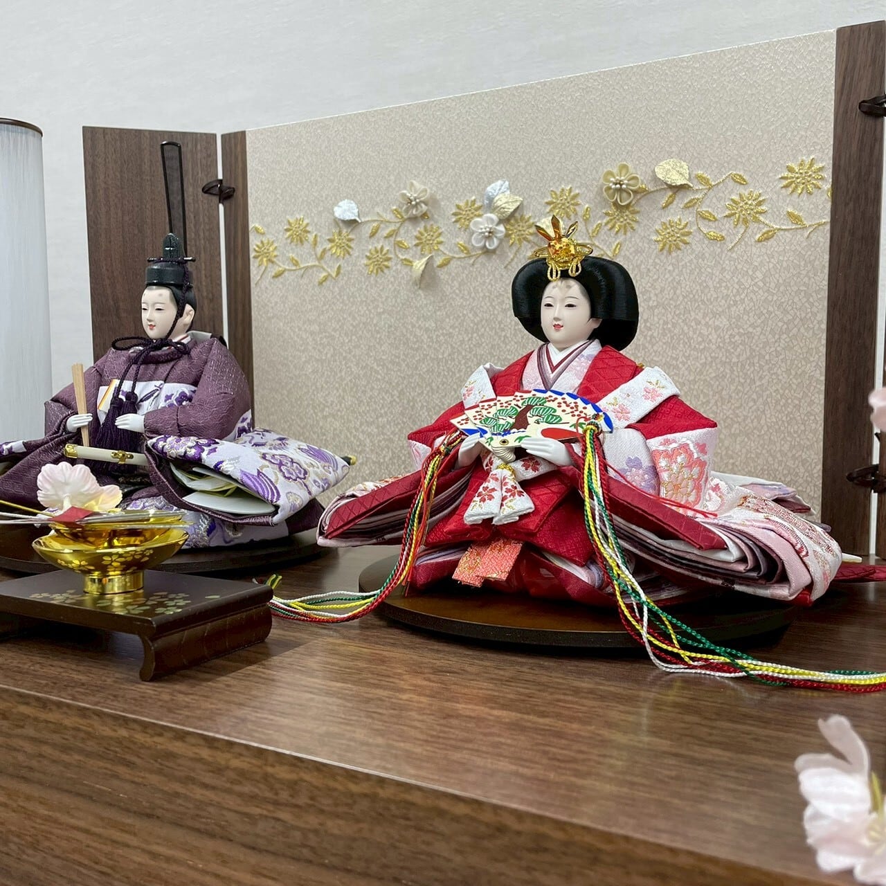 木目調の飾台に紫色と赤色のお雛様を合わせ、落ち着いた雰囲気と高級感を併せ持っています。