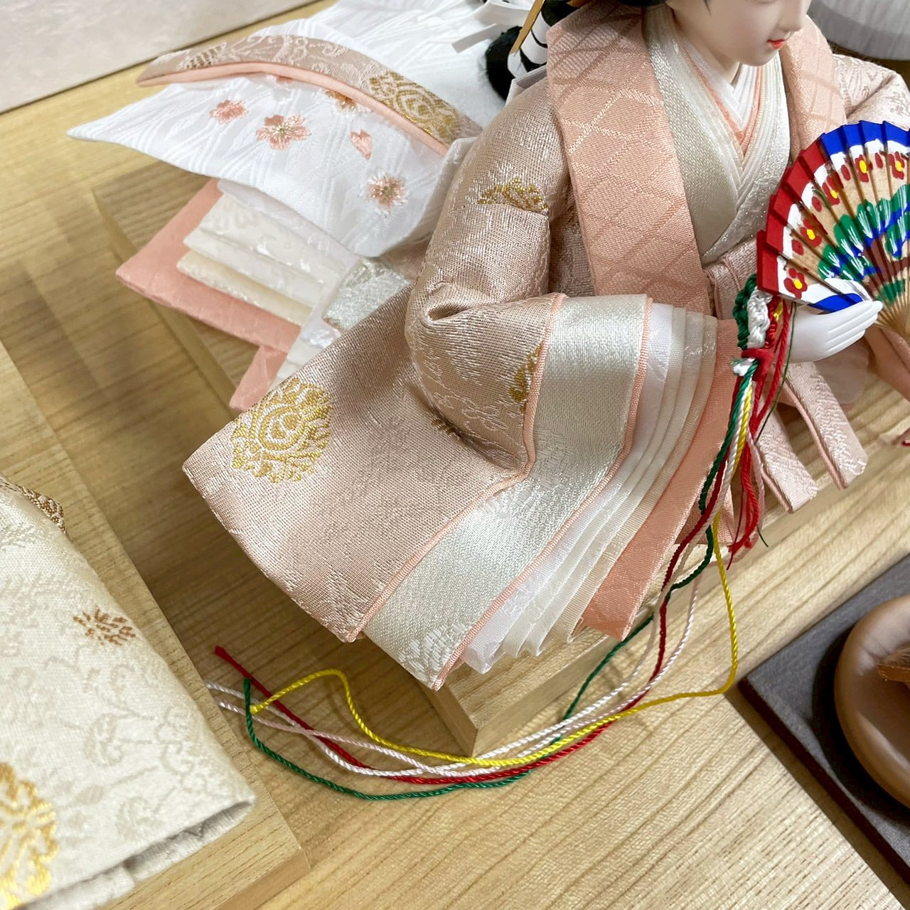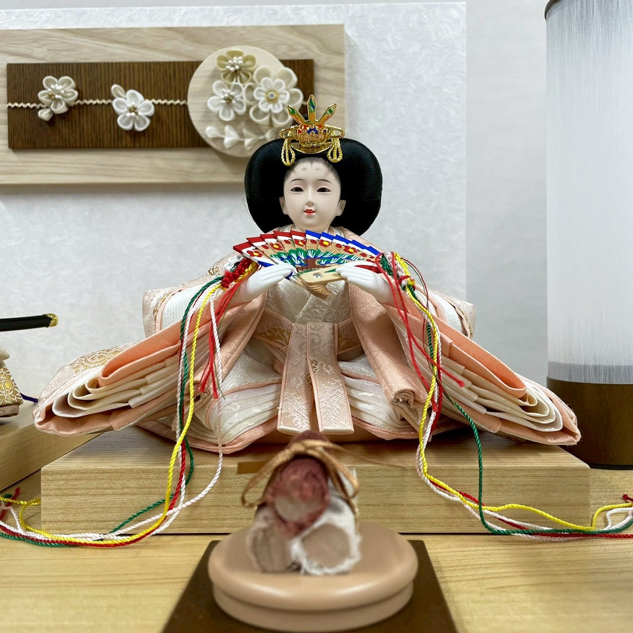 かわいいお道具やつまみ細工の花飾りの衝立屏風の中で淡い衣裳のお雛様がかわいらしいコンパクト収納です。