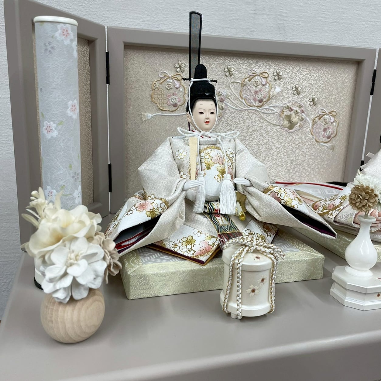 トレンドカラーの飾台に合わせた優しい色目のお雛様。