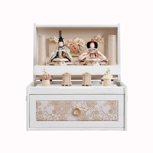 真っ白な宝箱をイメージした収納飾りに、ピンクや白色の桜を刺繍した衣裳のお雛様がよく似合います。