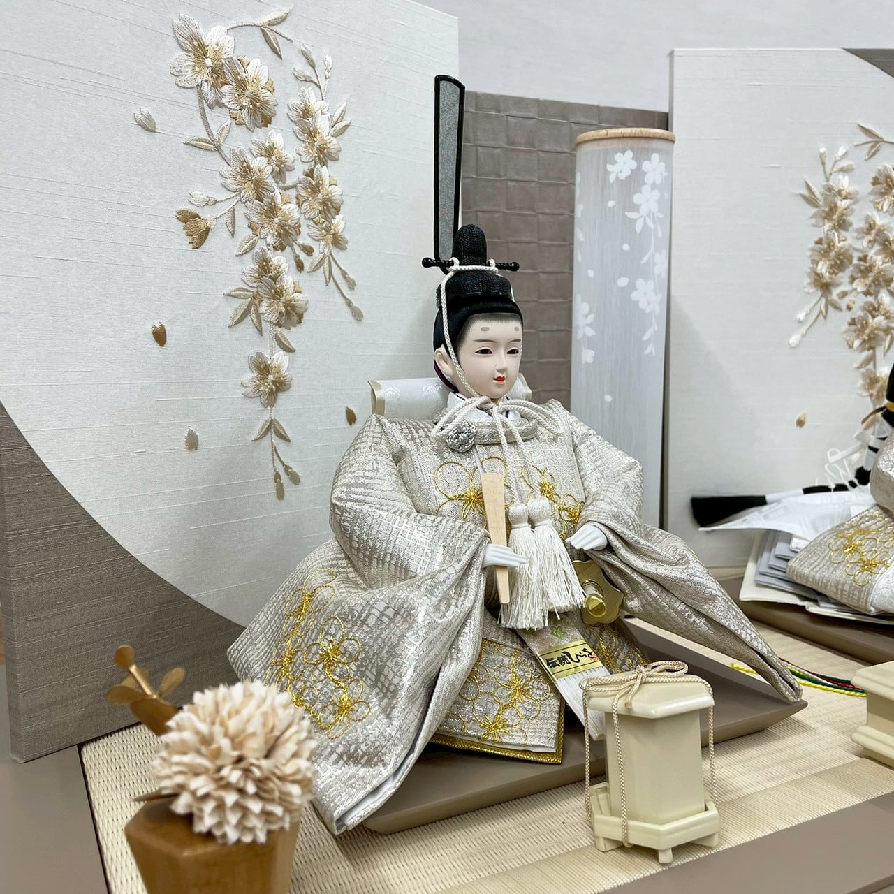 グレーの台屏風とシルバーの衣裳に金糸で刺繍を施したお人形を合わせたモダンな雛人形セットです。