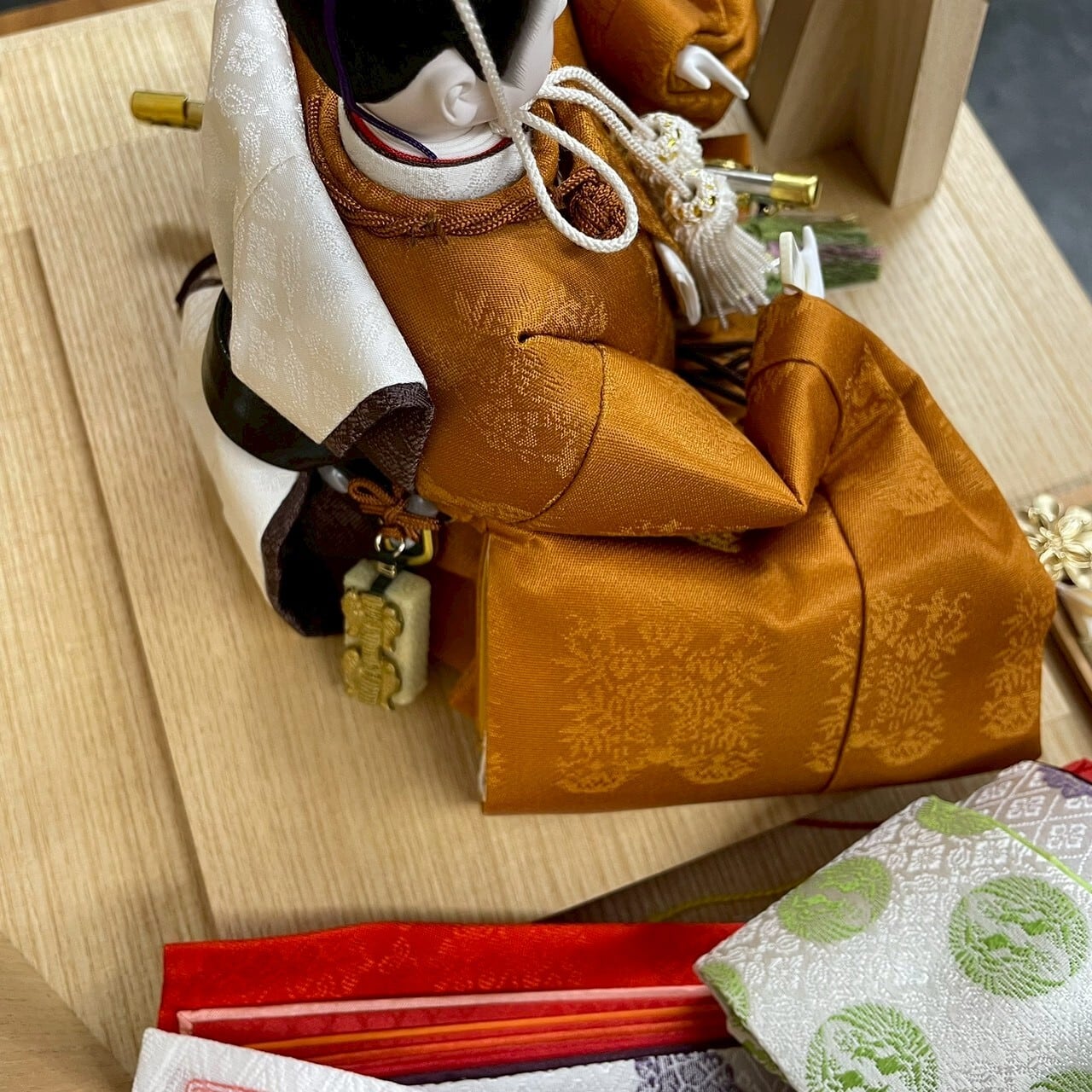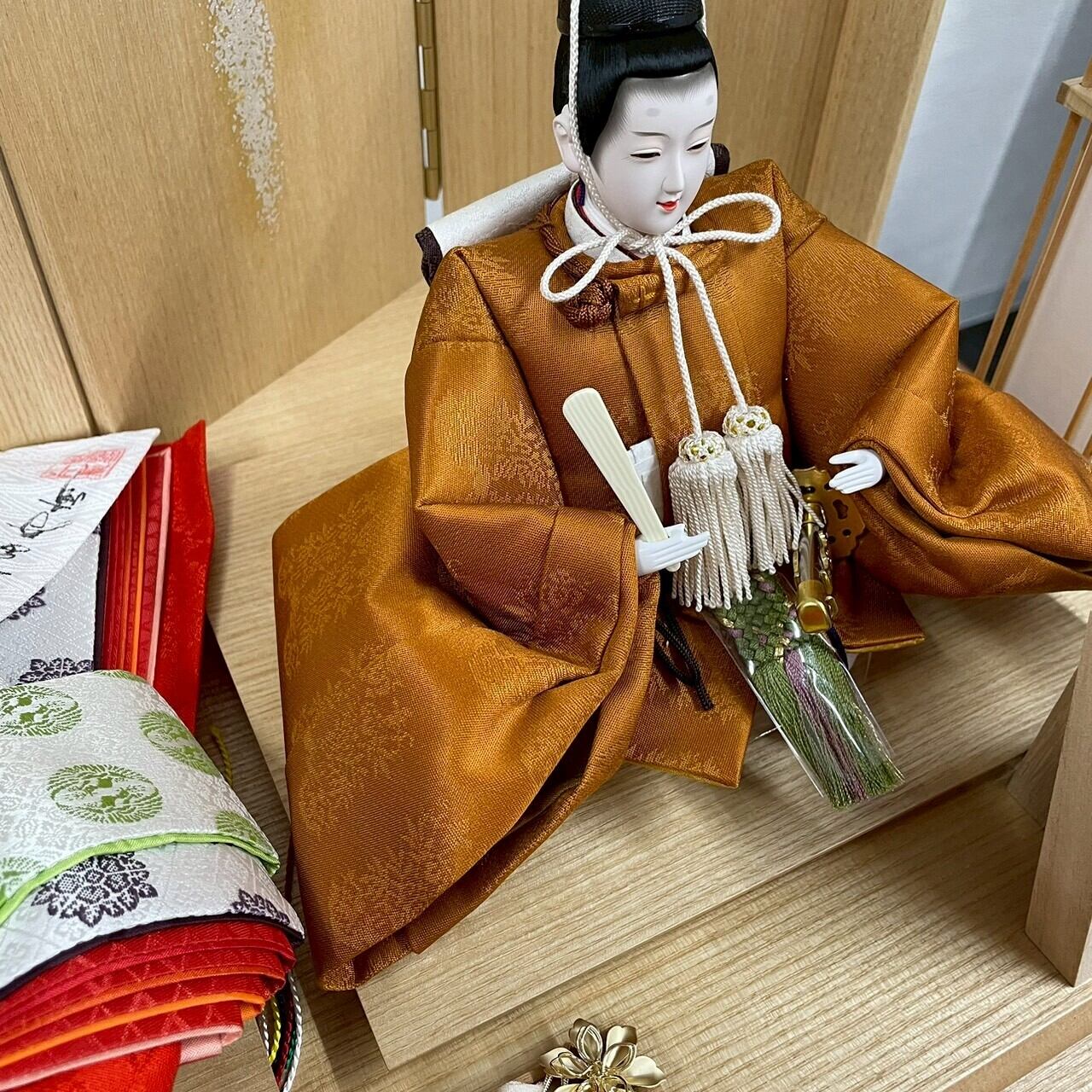 即位礼正殿の儀で天皇陛下がお召しになった「黄櫨染御袍」のお雛様。