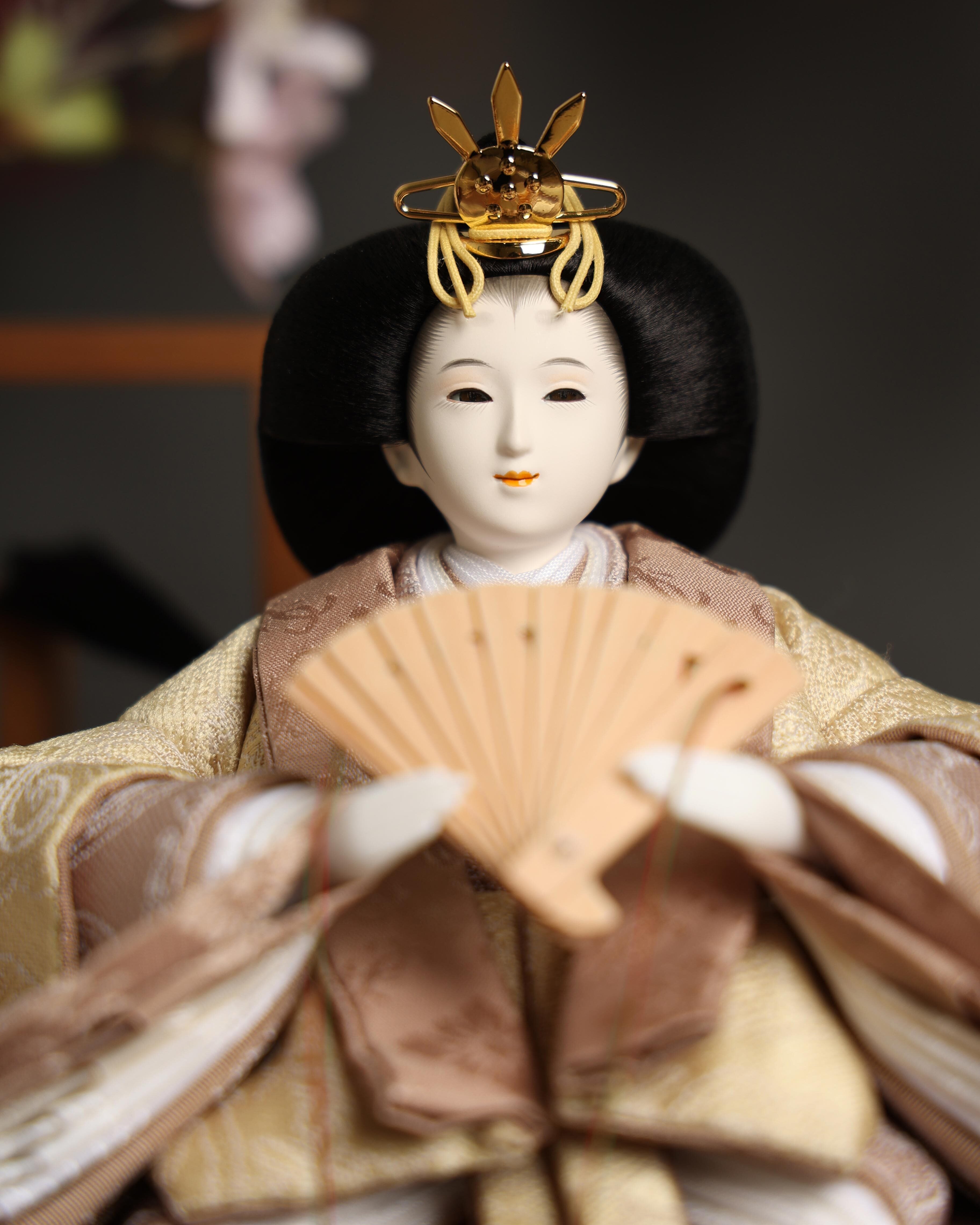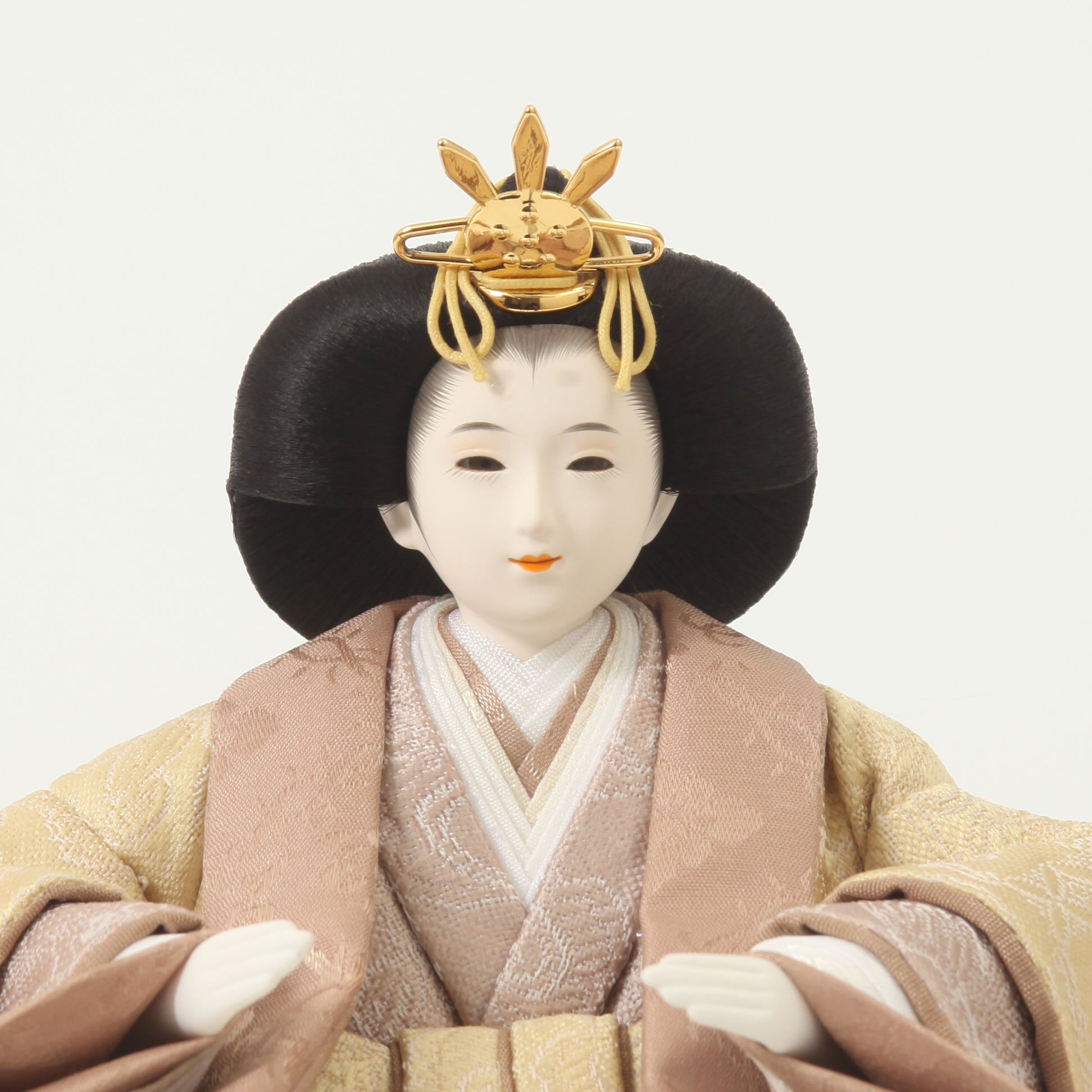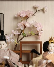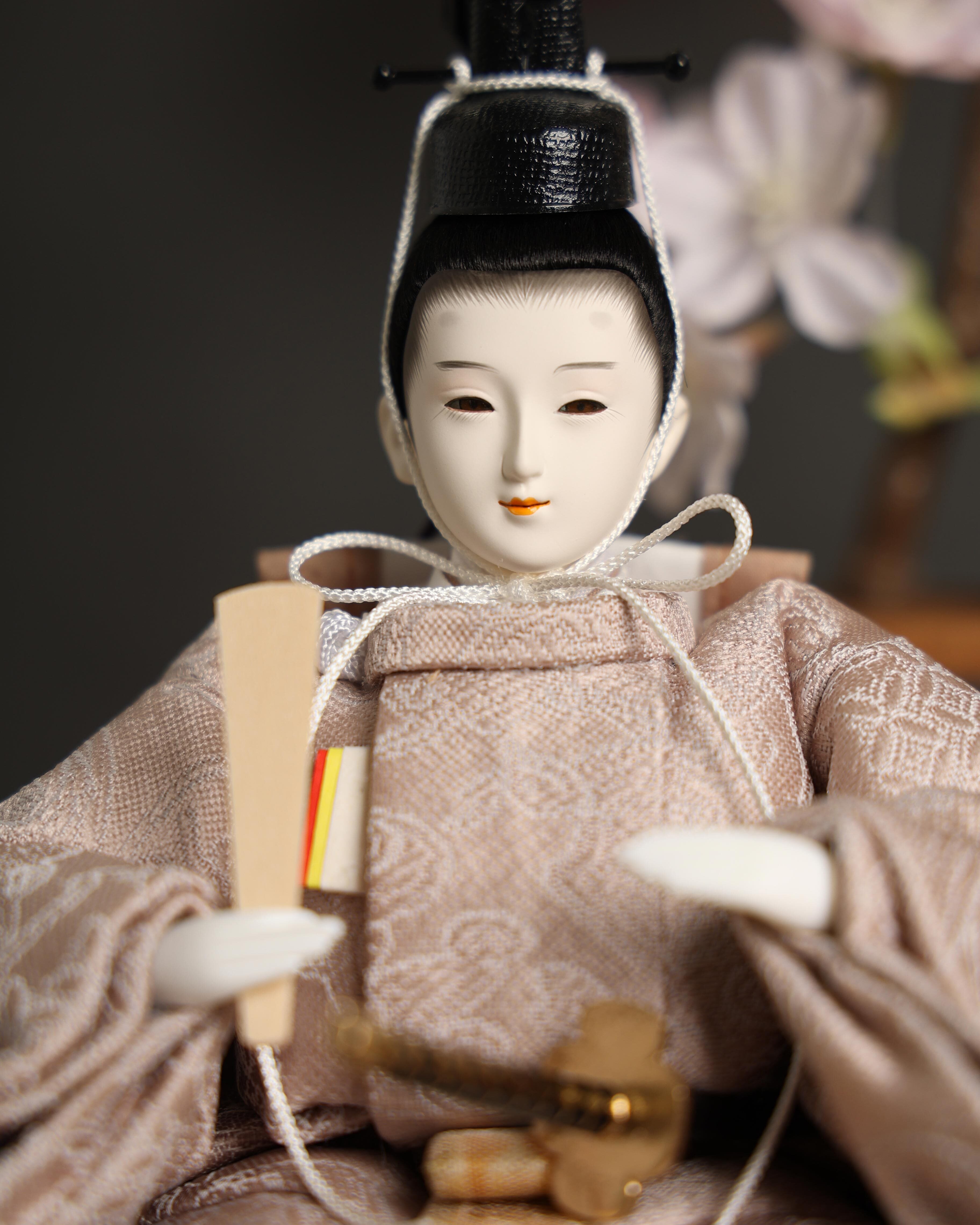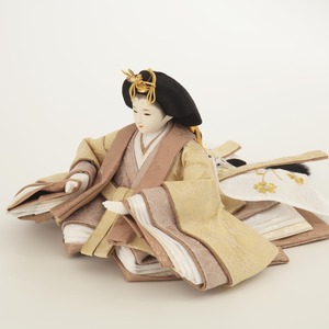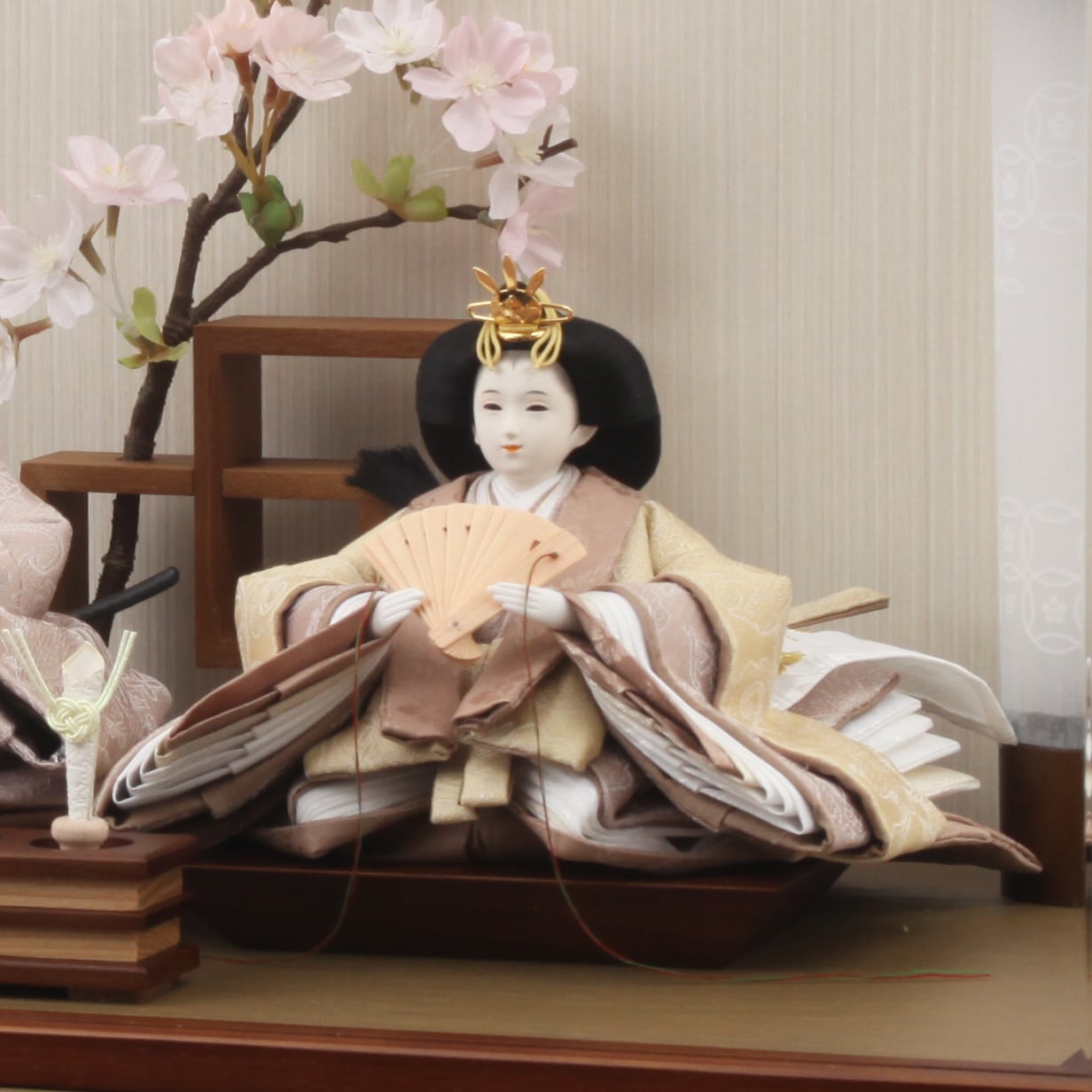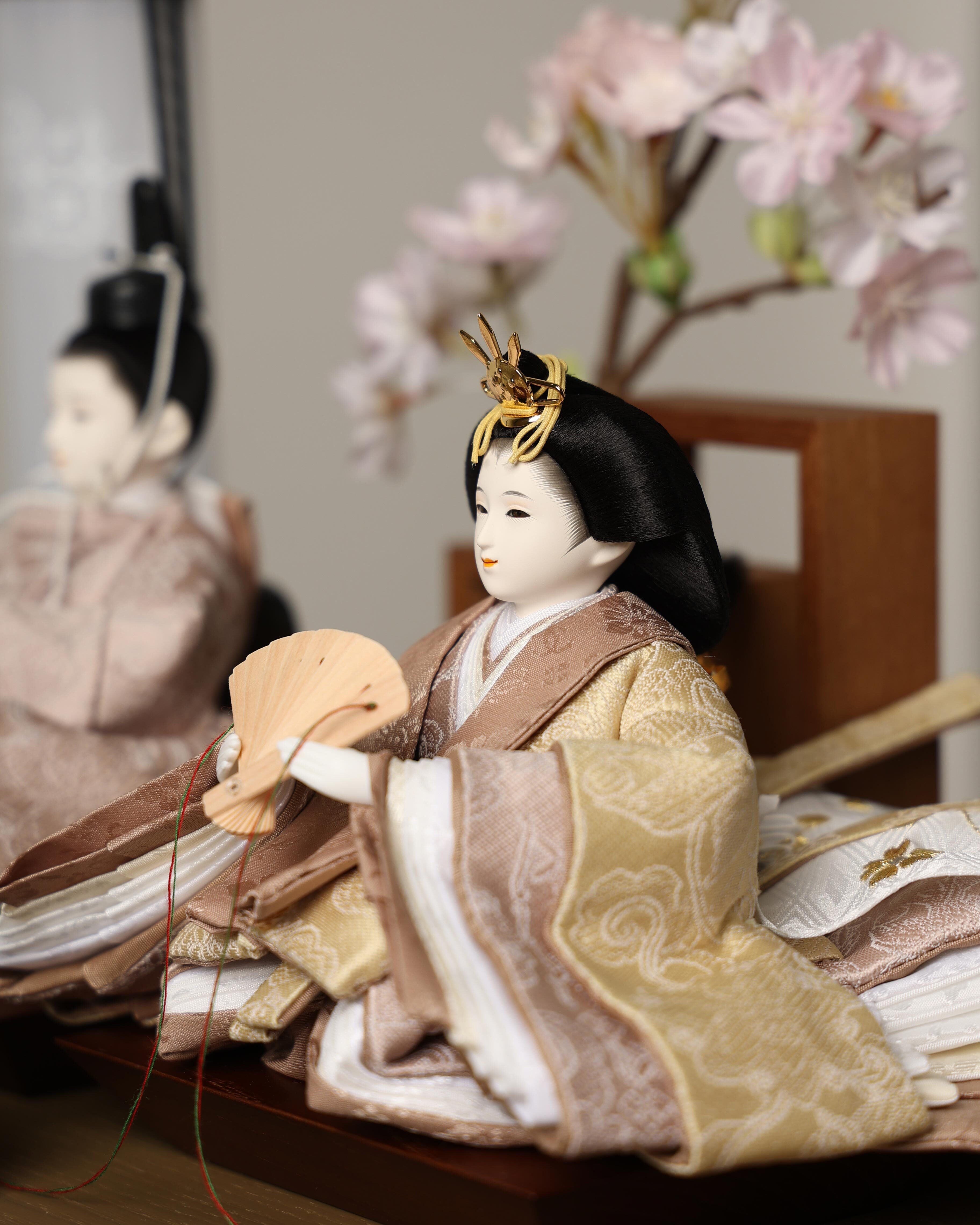 淡いベージュと桜色を基調とした、やさしい色合いの親王飾りです。上品な織柄が際立つ衣装は、柔らかな光沢が美しく、落ち着いた中にも華やかさを感じられる仕上がり。背景の桜飾りと調和し、まるで春の空気をそのまま閉じ込めたような、優雅でナチュラルな雰囲気のお雛様です。インテリアになじむ大人可愛いカラーが魅力で、リビングにも上品に飾っていただけます。