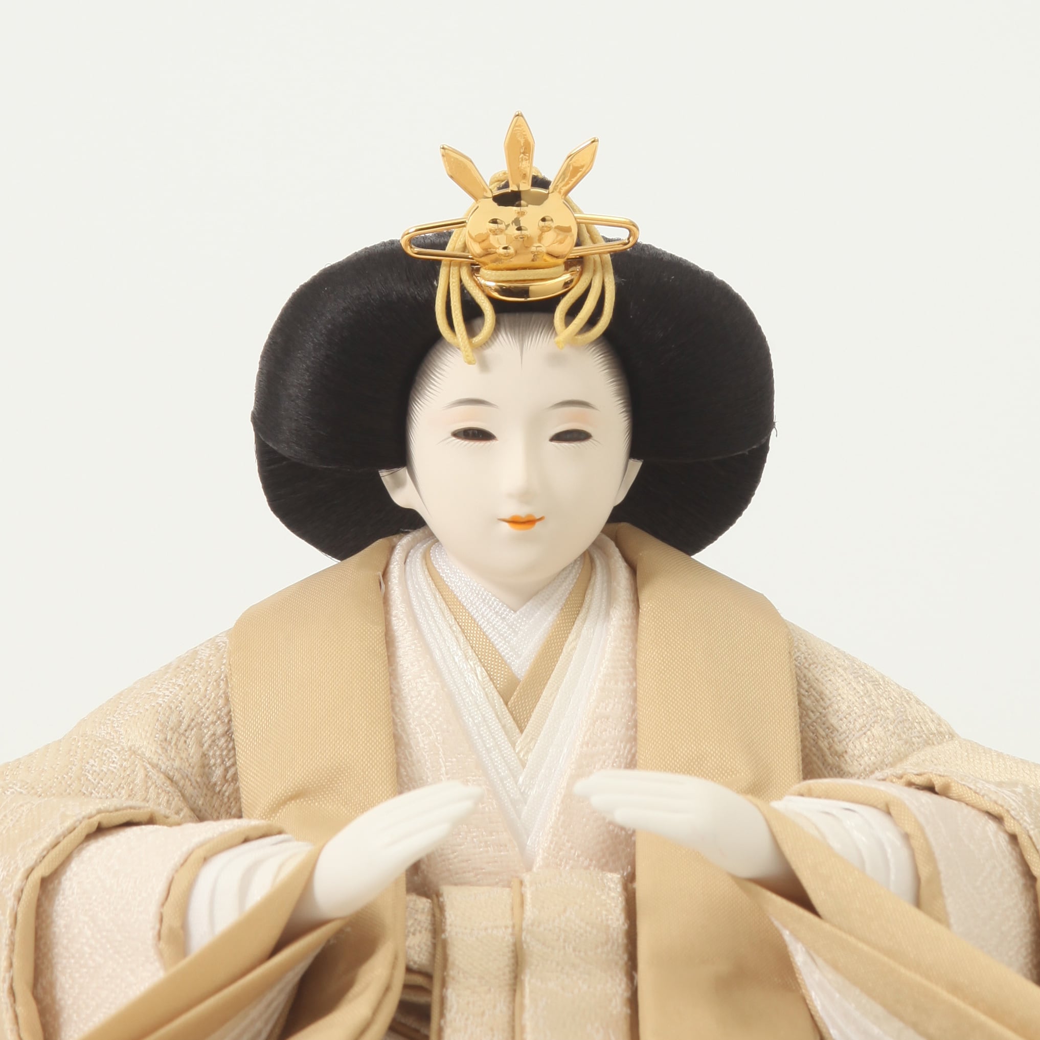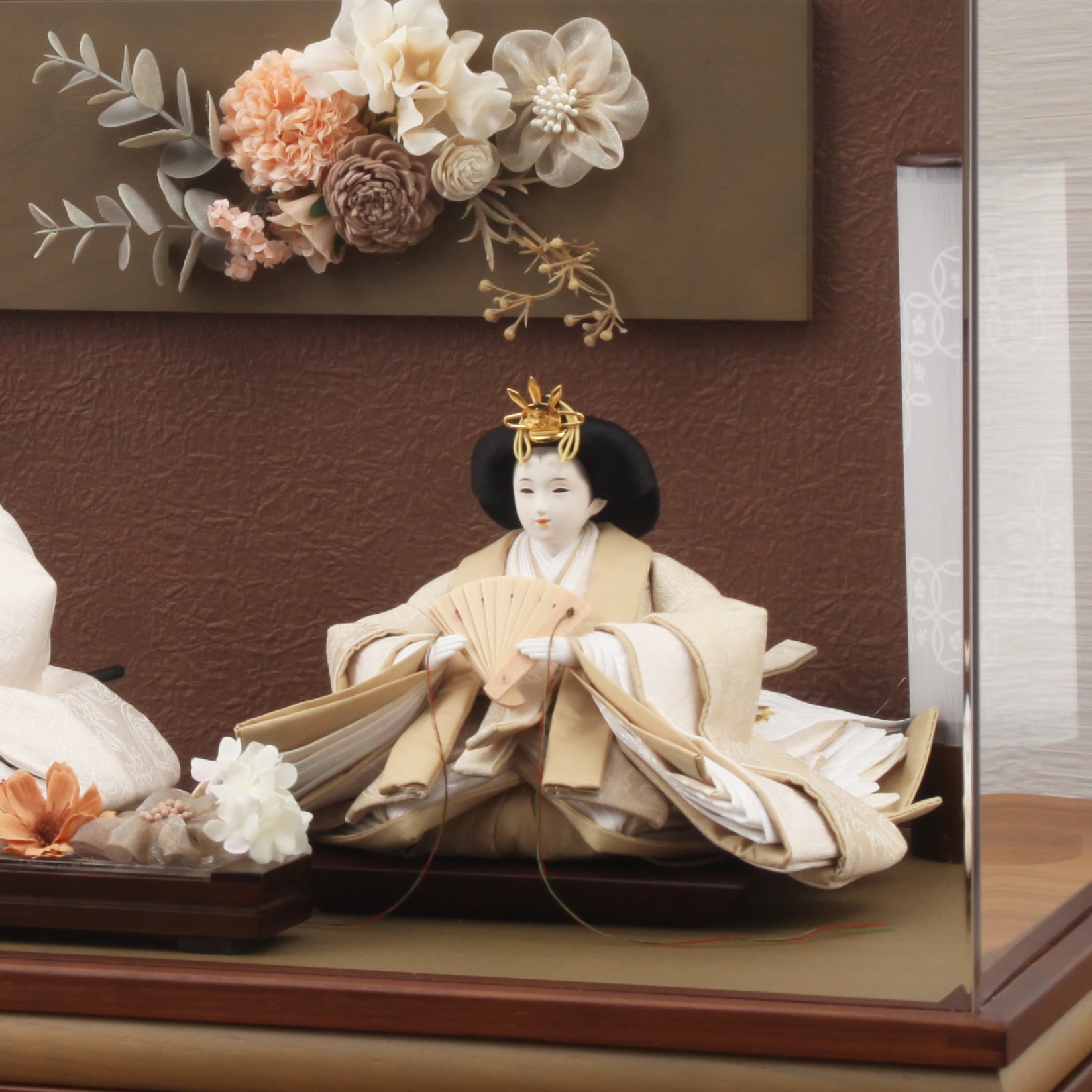 落ち着いたベージュトーンでまとめた、やさしく上品な雰囲気の親王飾りです。柔らかな生成り色の衣装は、さりげない光沢と丁寧な重ねが美しく、大人っぽいニュアンスカラーが洗練された印象を与えます。背景にはくすみカラーのフラワーアレンジをあしらい、和モダンインテリアに自然に馴染むデザインに仕上げました。コンパクトなケース飾りで飾りやすく、お部屋に上質な春の彩りを添えてくれるお雛様です。