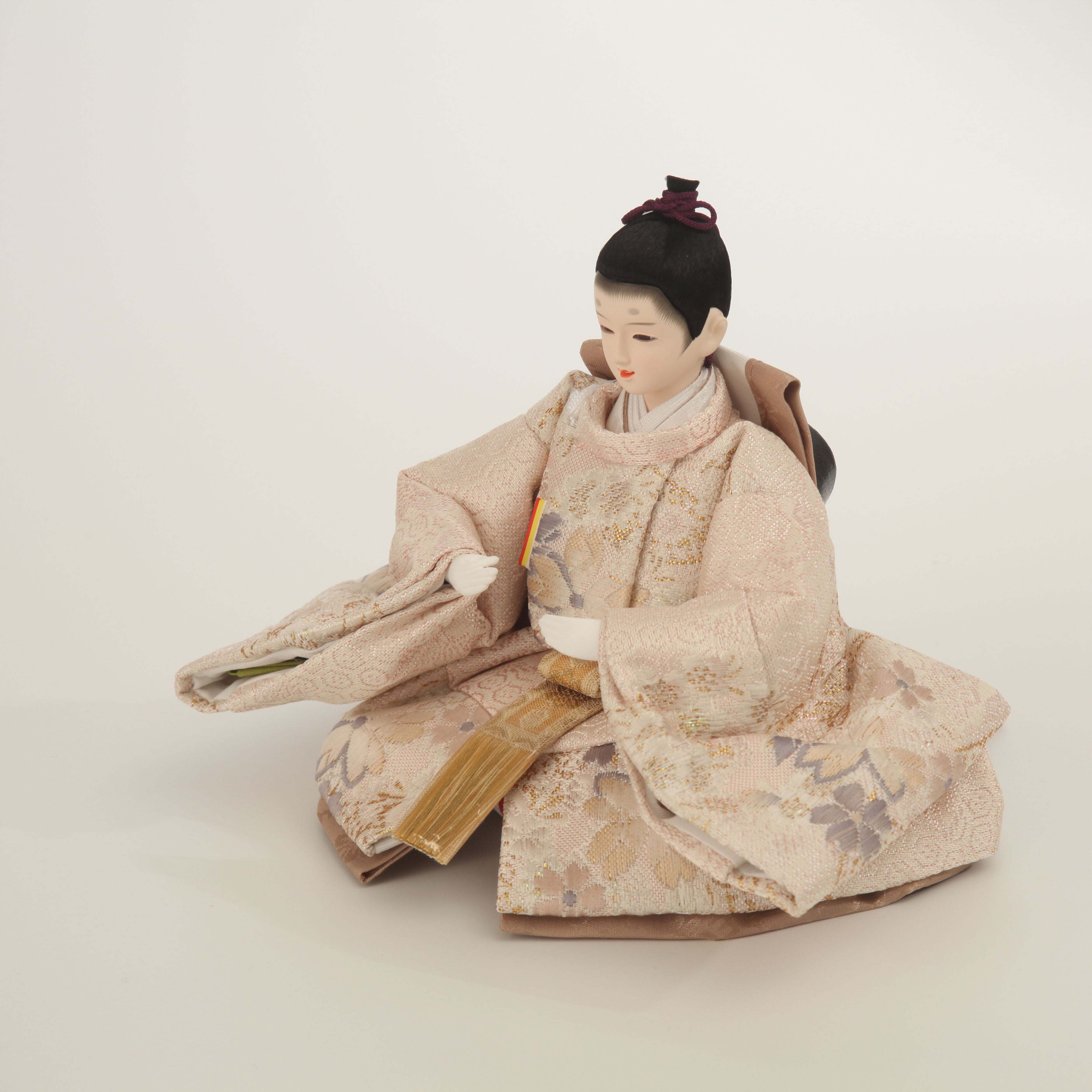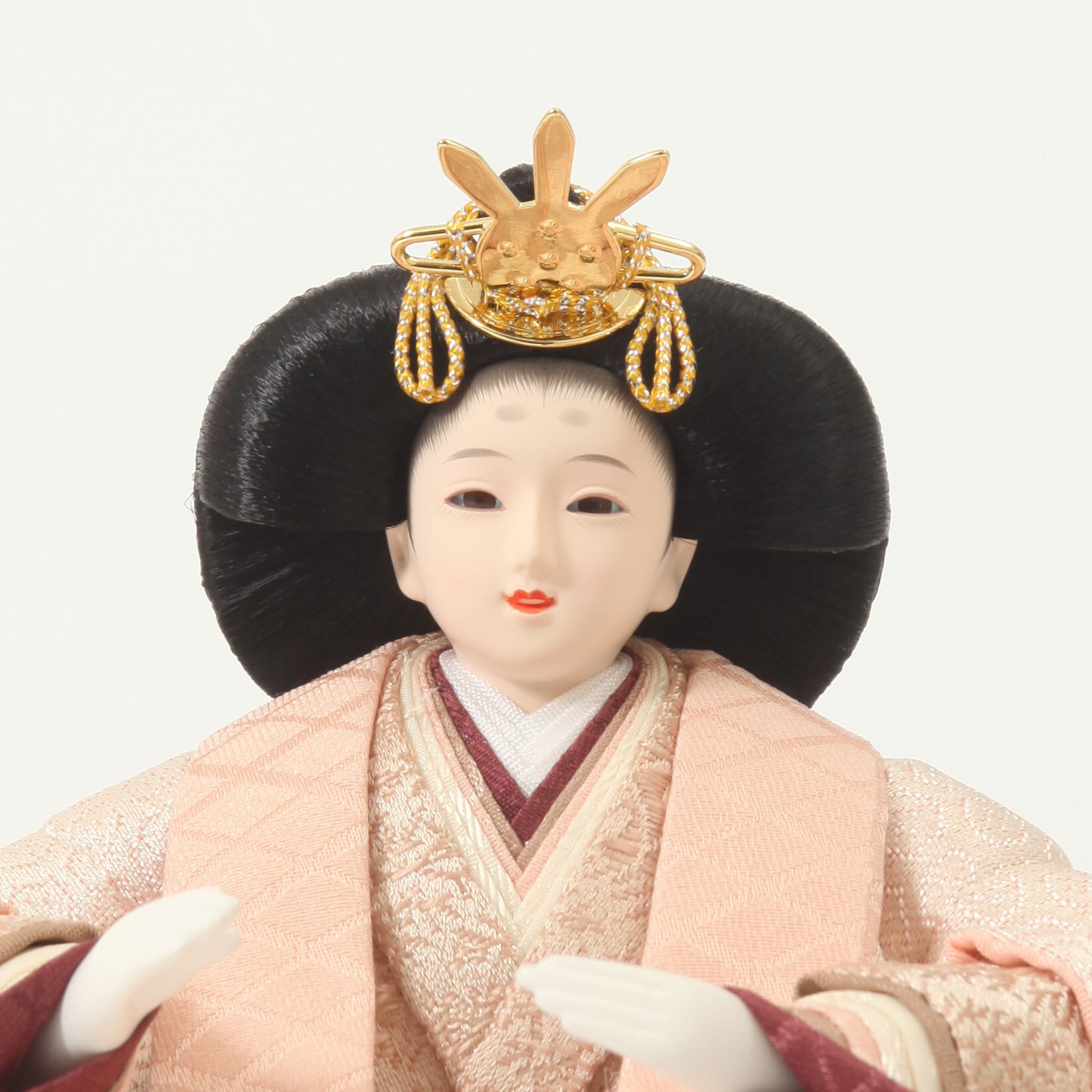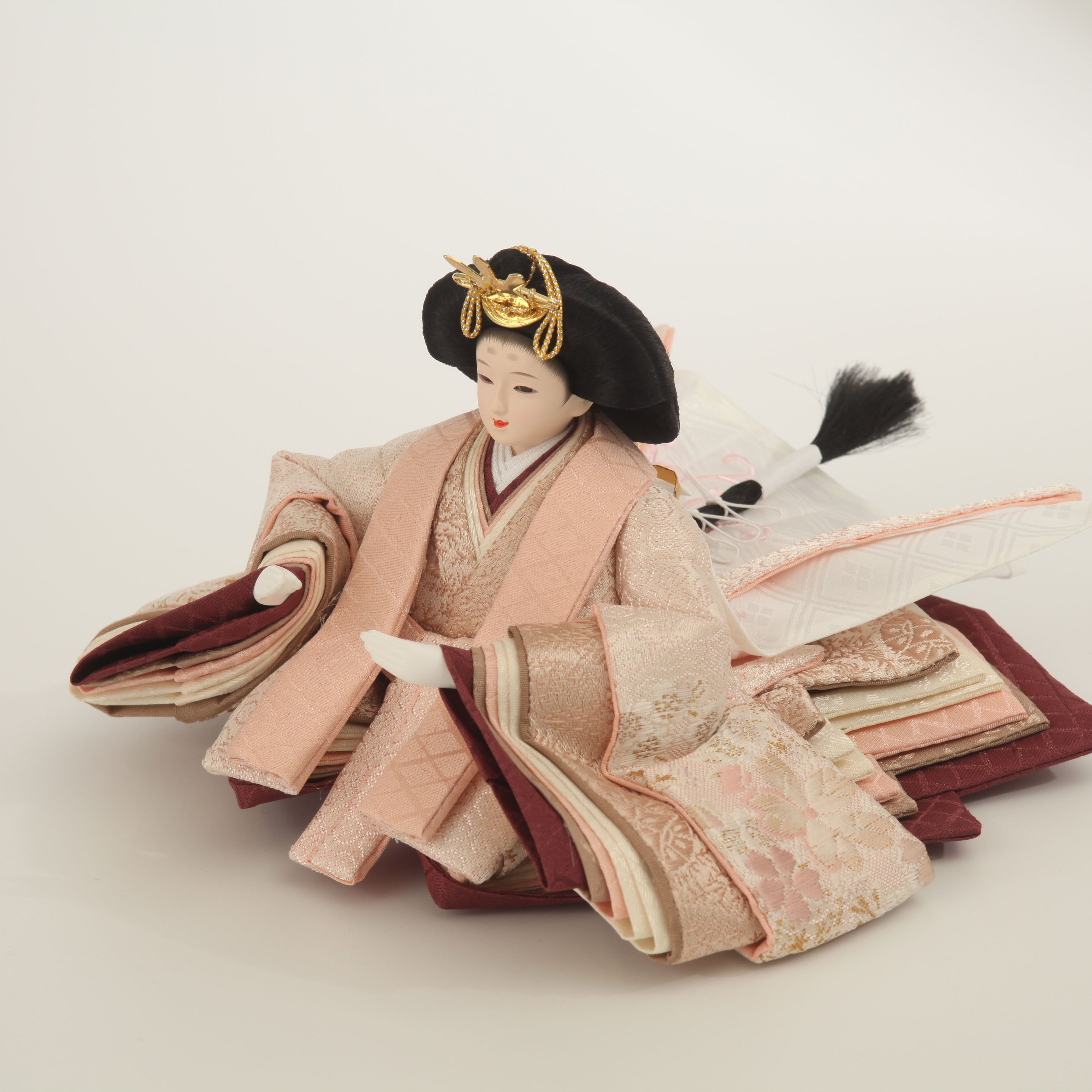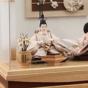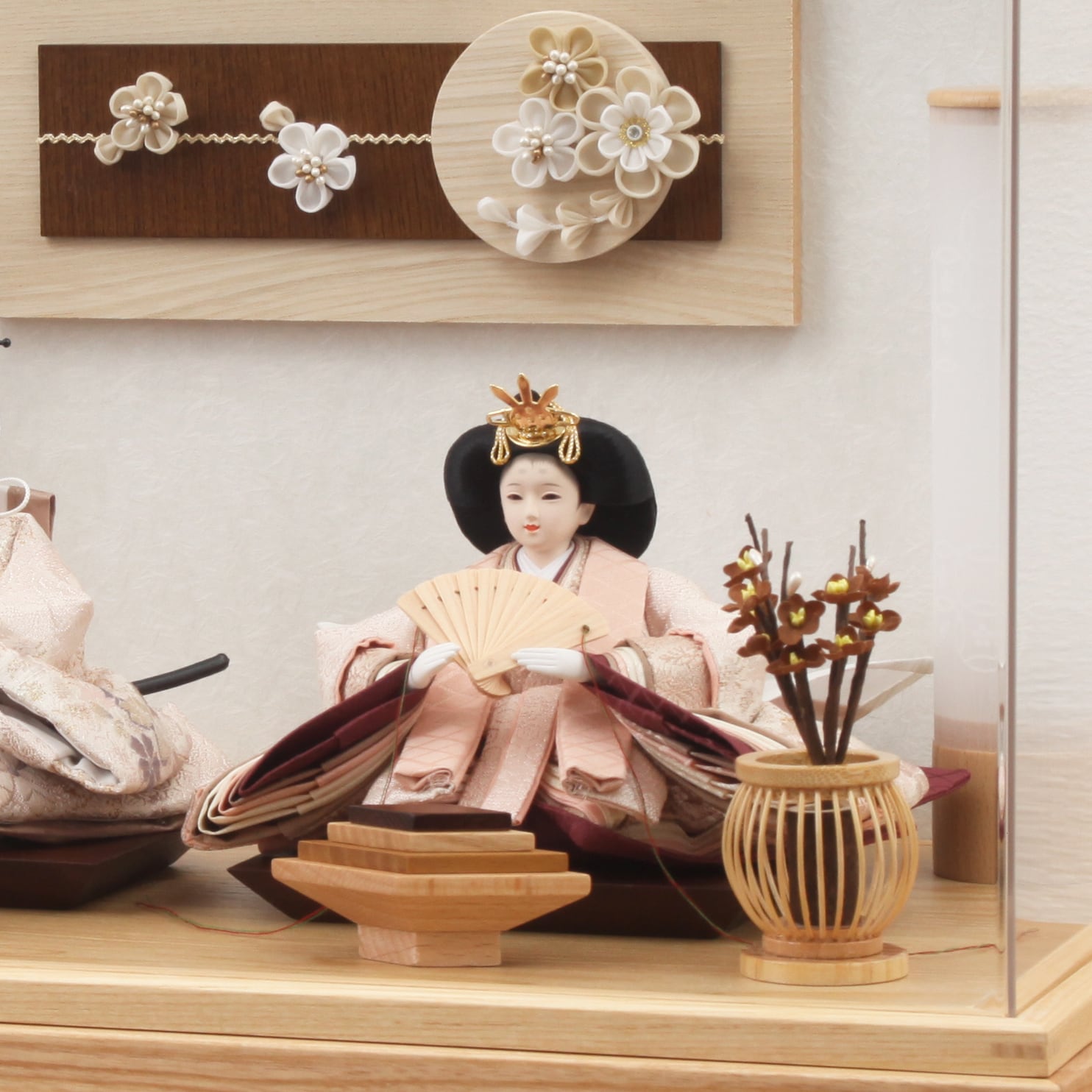 淡いピンクとやさしい生成りを基調とした、柔らかな雰囲気の親王飾りです。男雛は落ち着いたベージュ系の衣装で端正に、女雛はくすみピンクの優しい色合いがふんわりと華やかさを演出。重ね色の美しさが際立つ上品な衣装で、ナチュラルな木目のケースと調和し、明るく清潔感のある佇まいに仕上げました。春らしい桜モチーフの飾りがアクセントとなり、お部屋に自然と馴染む“可愛らしい和モダン”のお雛様です。
