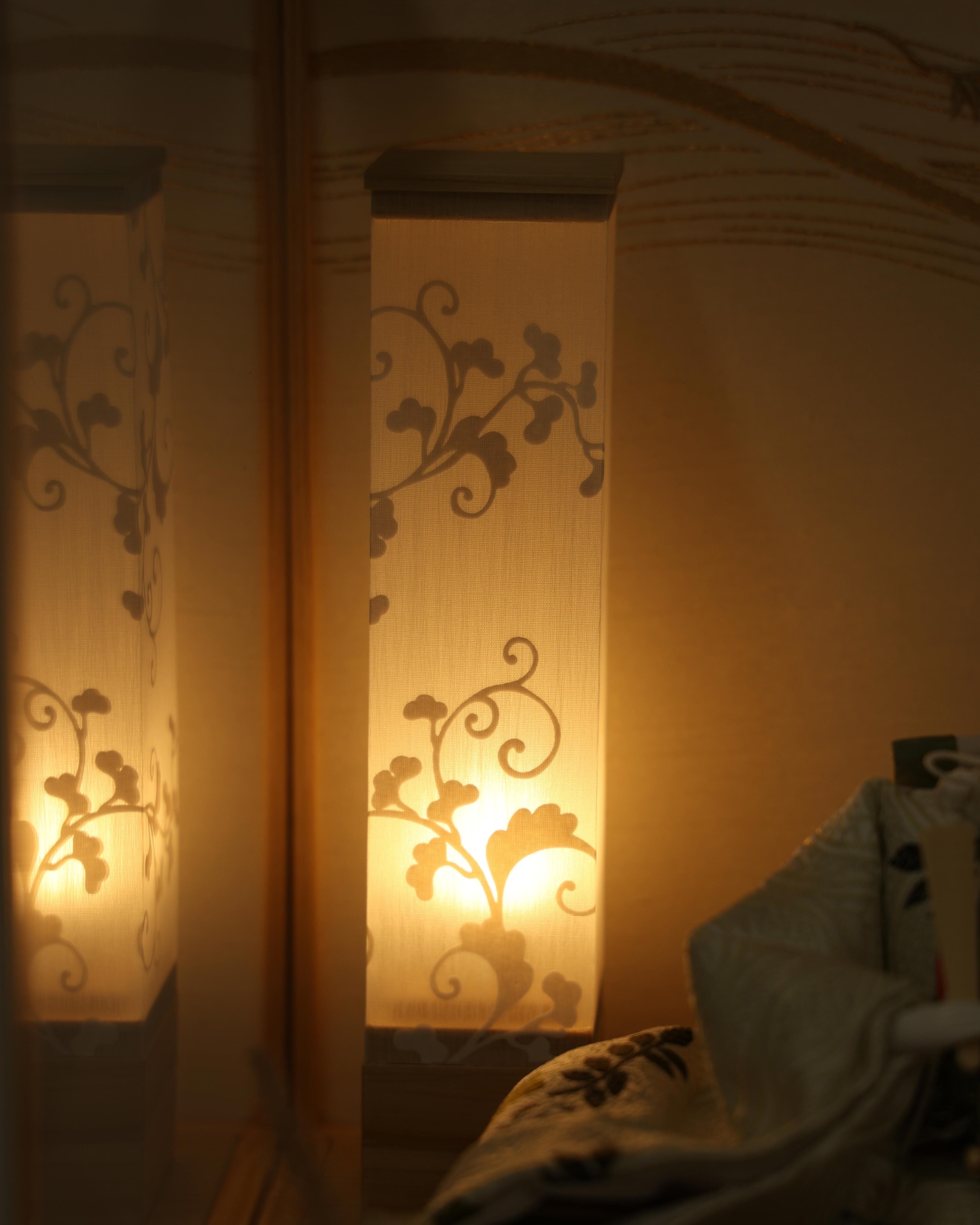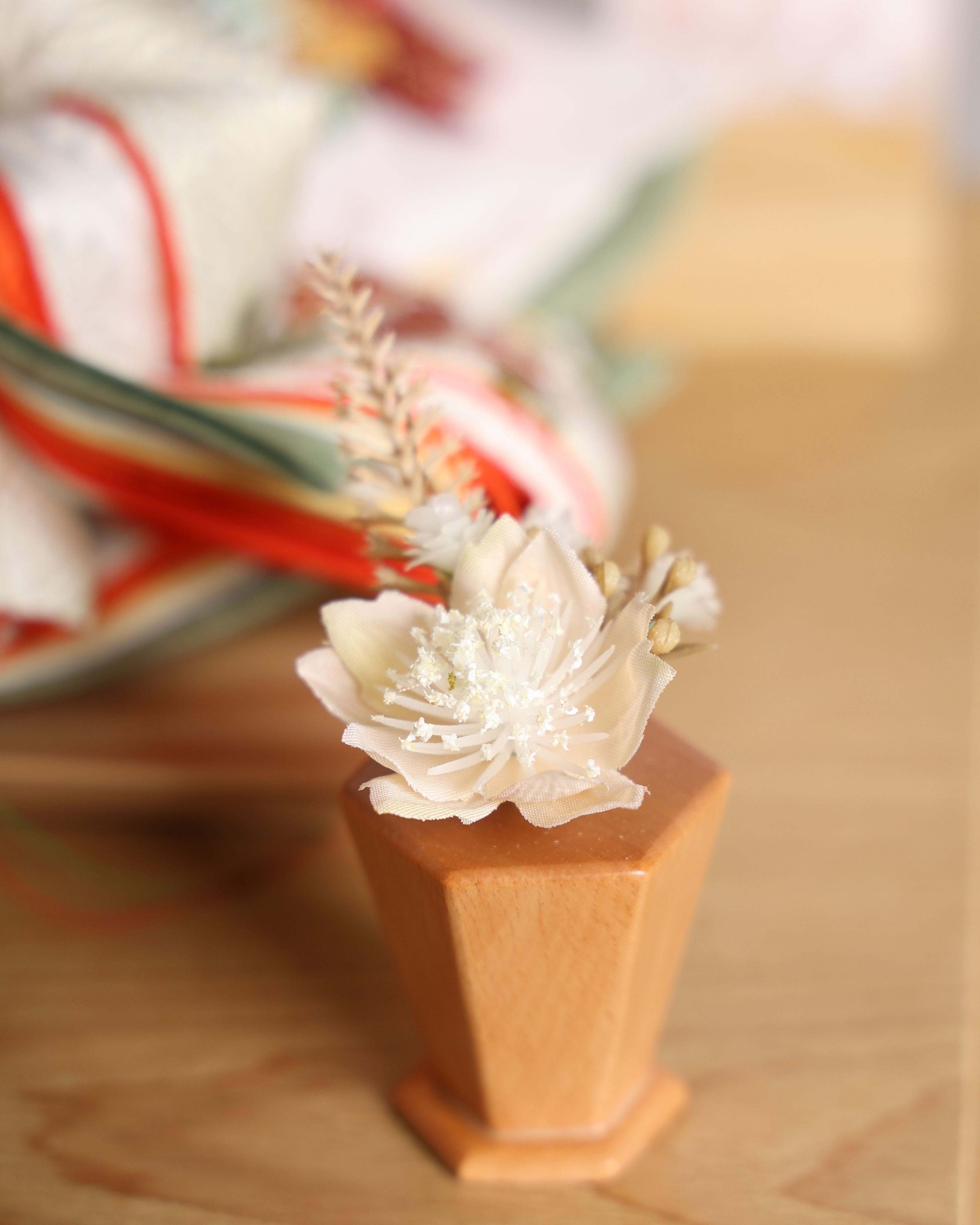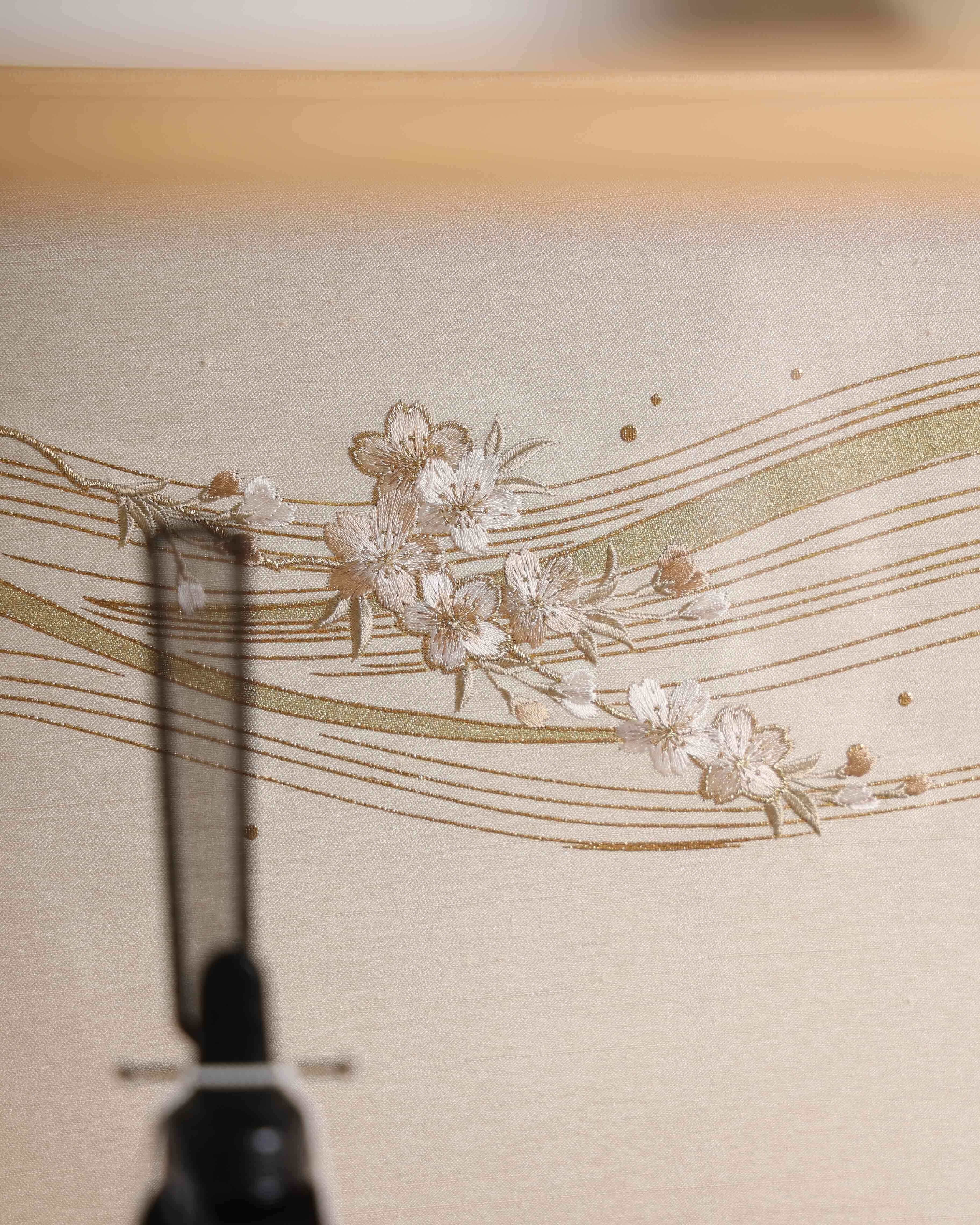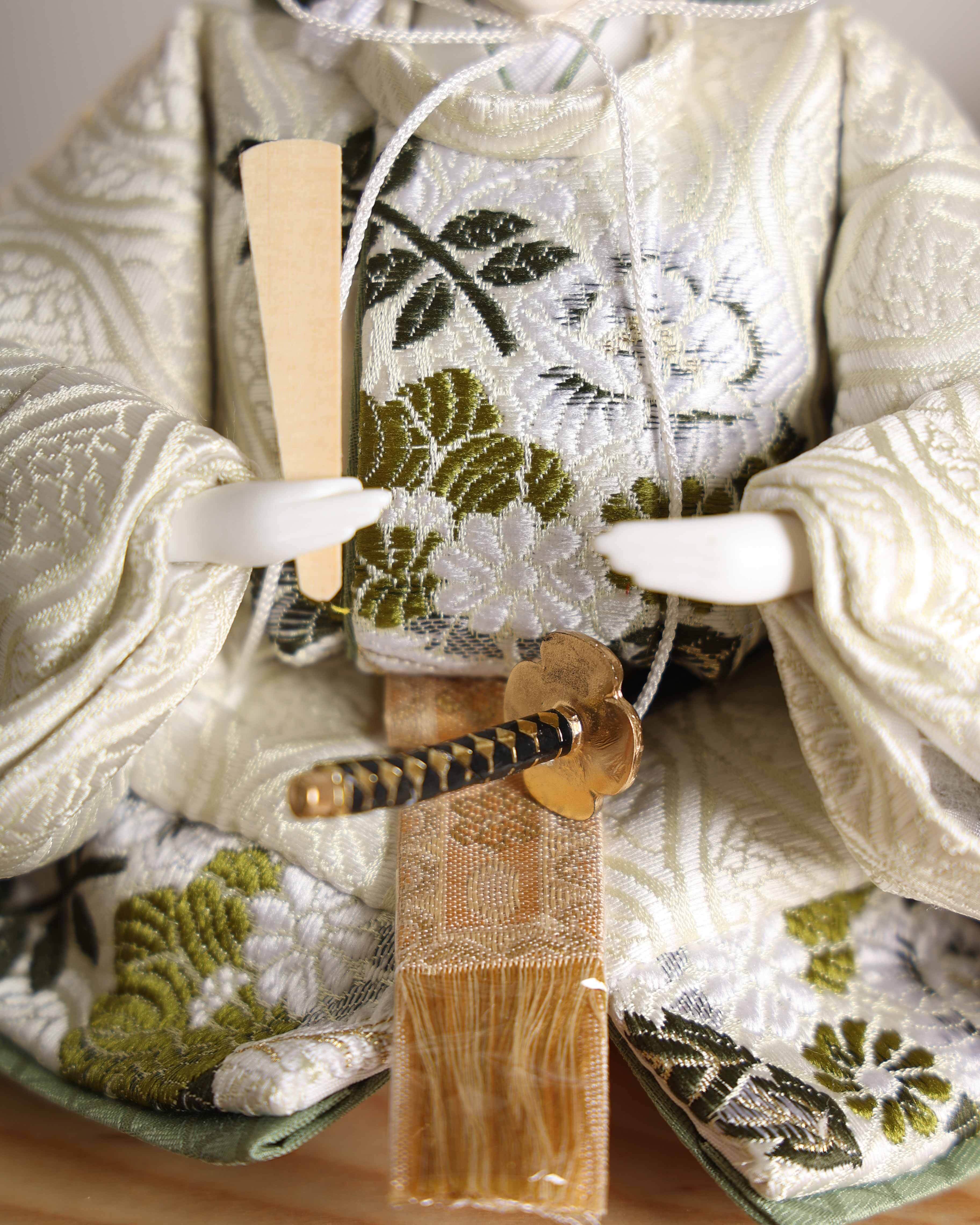 お殿様は白地に穏やかな草花文様をあしらった気品ある装束、お姫様は朱と白の重ねが美しい華やかな衣装を纏い、晴れやかな存在感を放ちます。背景には金彩の流線と桜のモチーフが描かれ、春の祝福を思わせる優雅な雰囲気に仕上げました。
