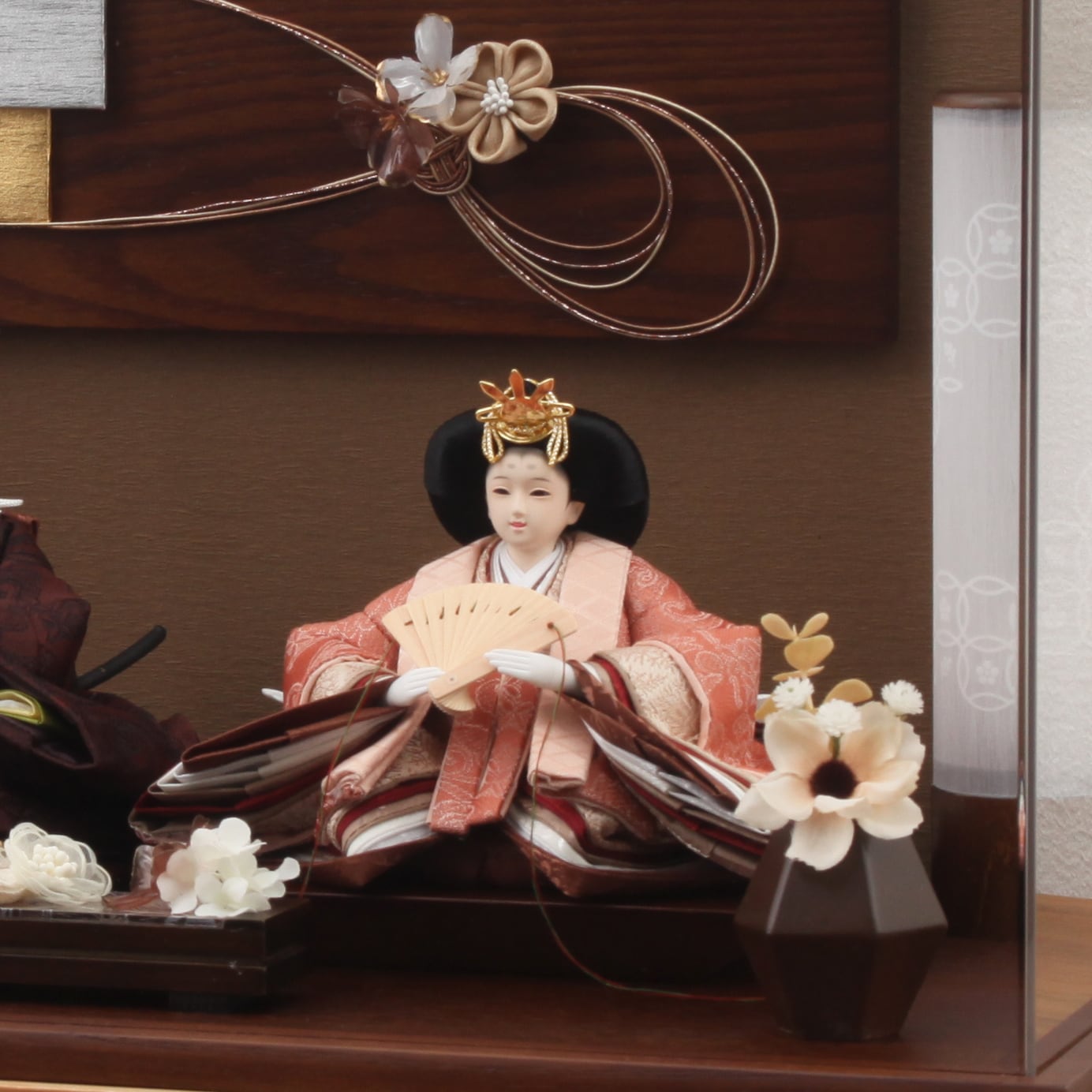 温かみのある木目と落ち着いた色調が美しい、シックで上質なケース入り親王飾りです。現代のお部屋に自然に馴染みながらも、節句らしい華やかさをしっかり感じられるデザインで、コンパクトながら存在感のある逸品です。