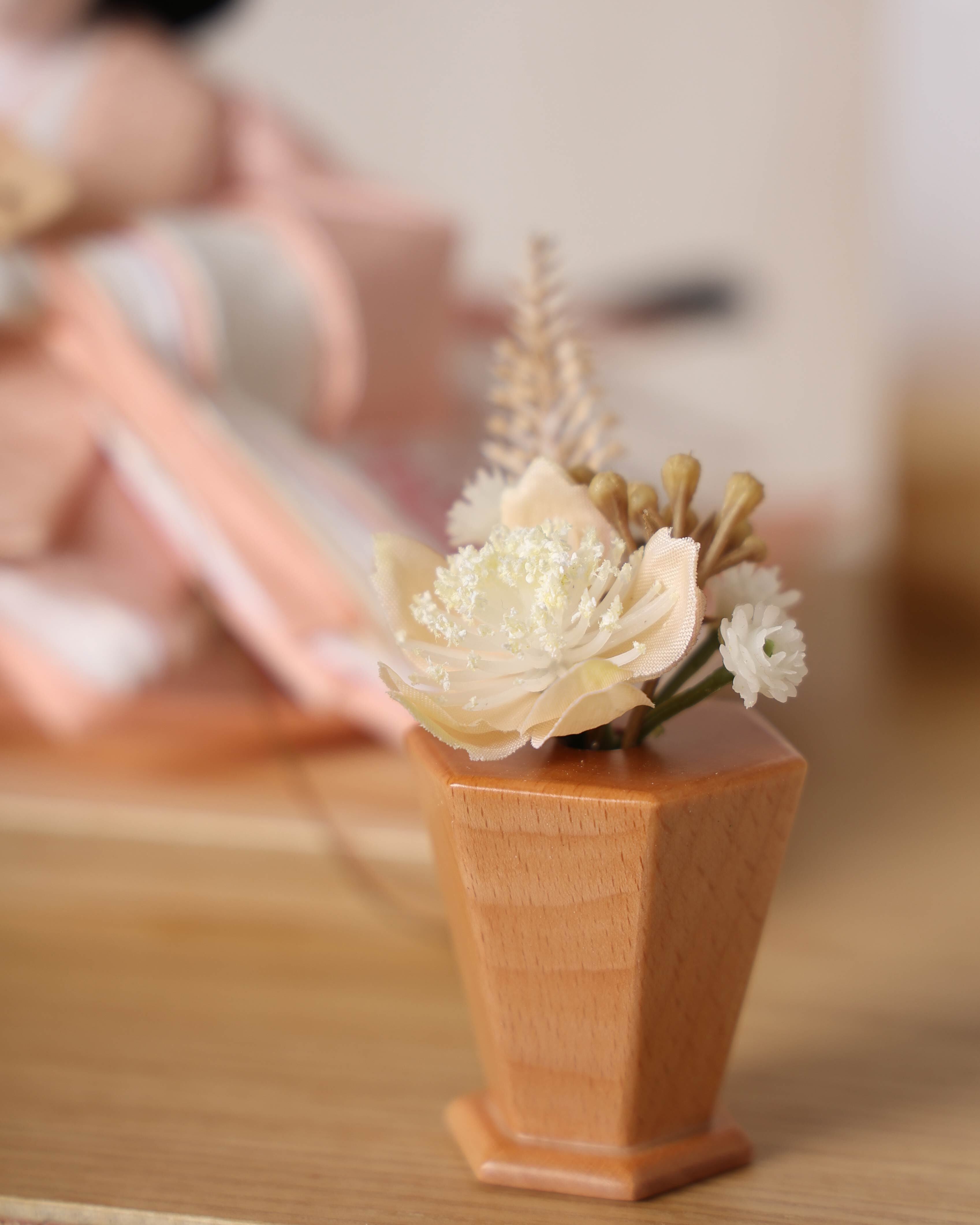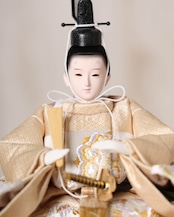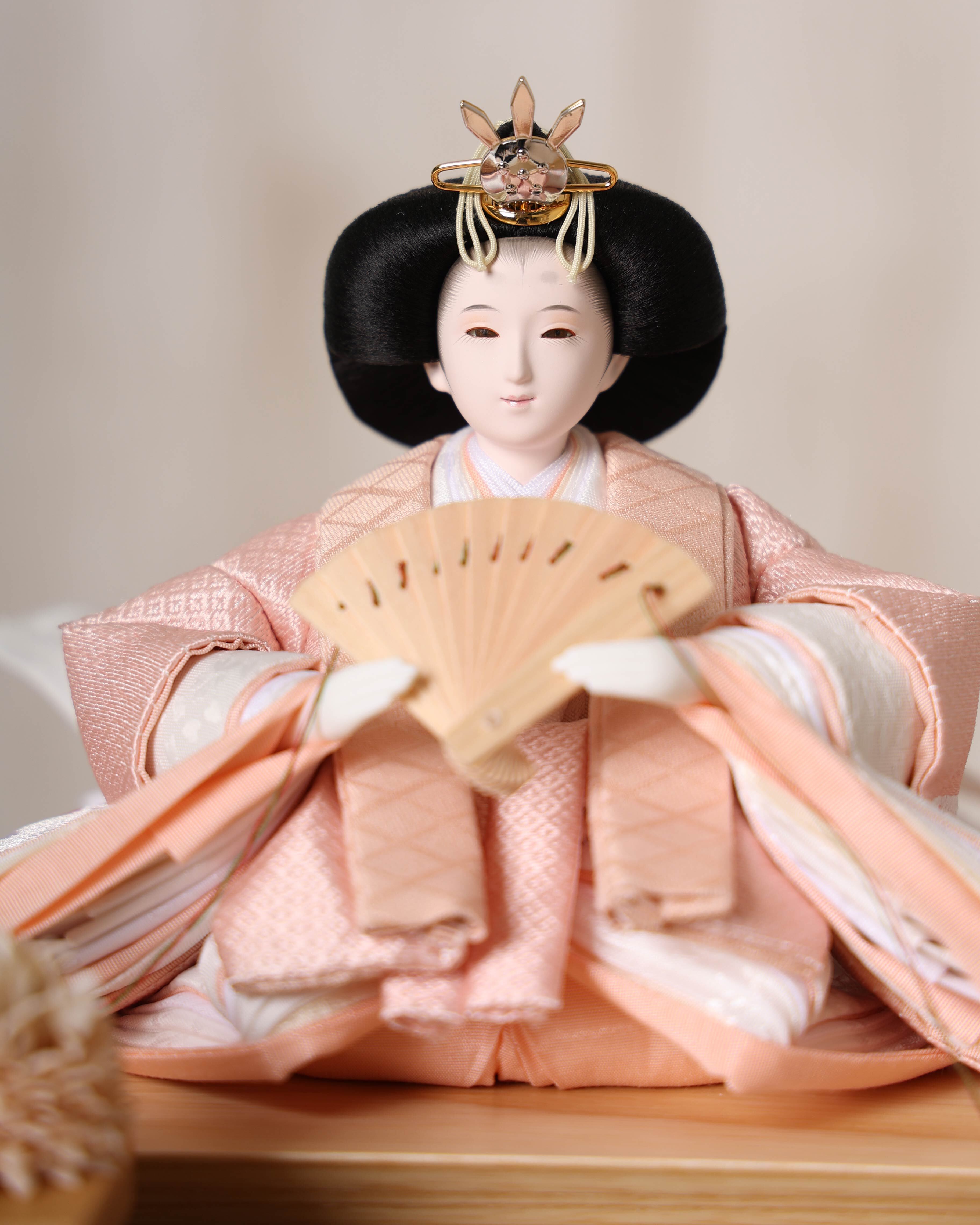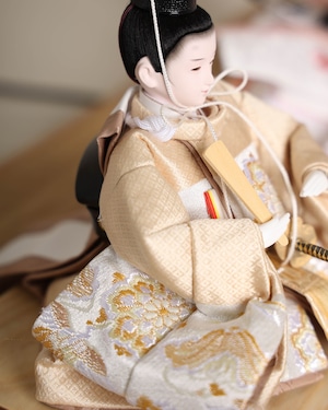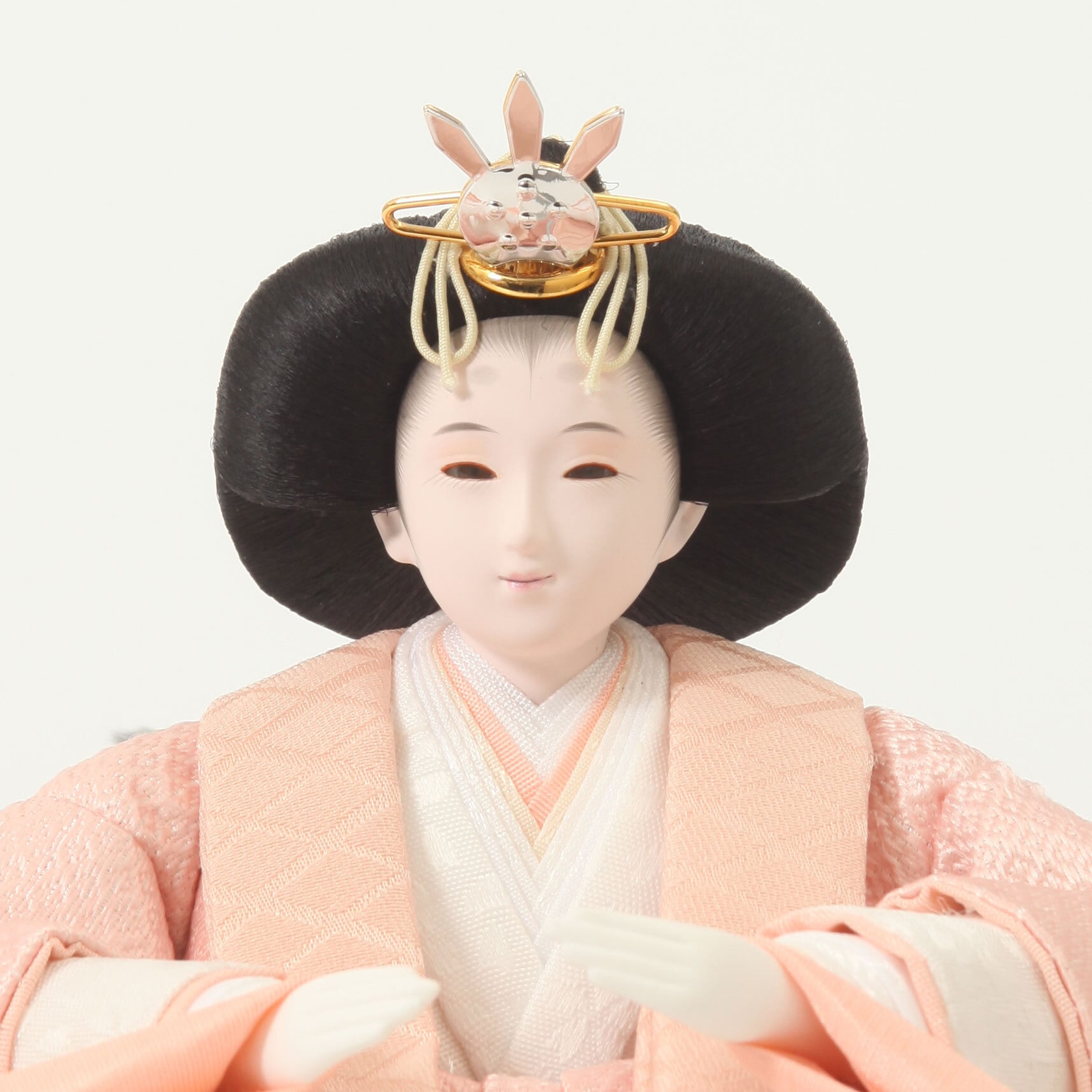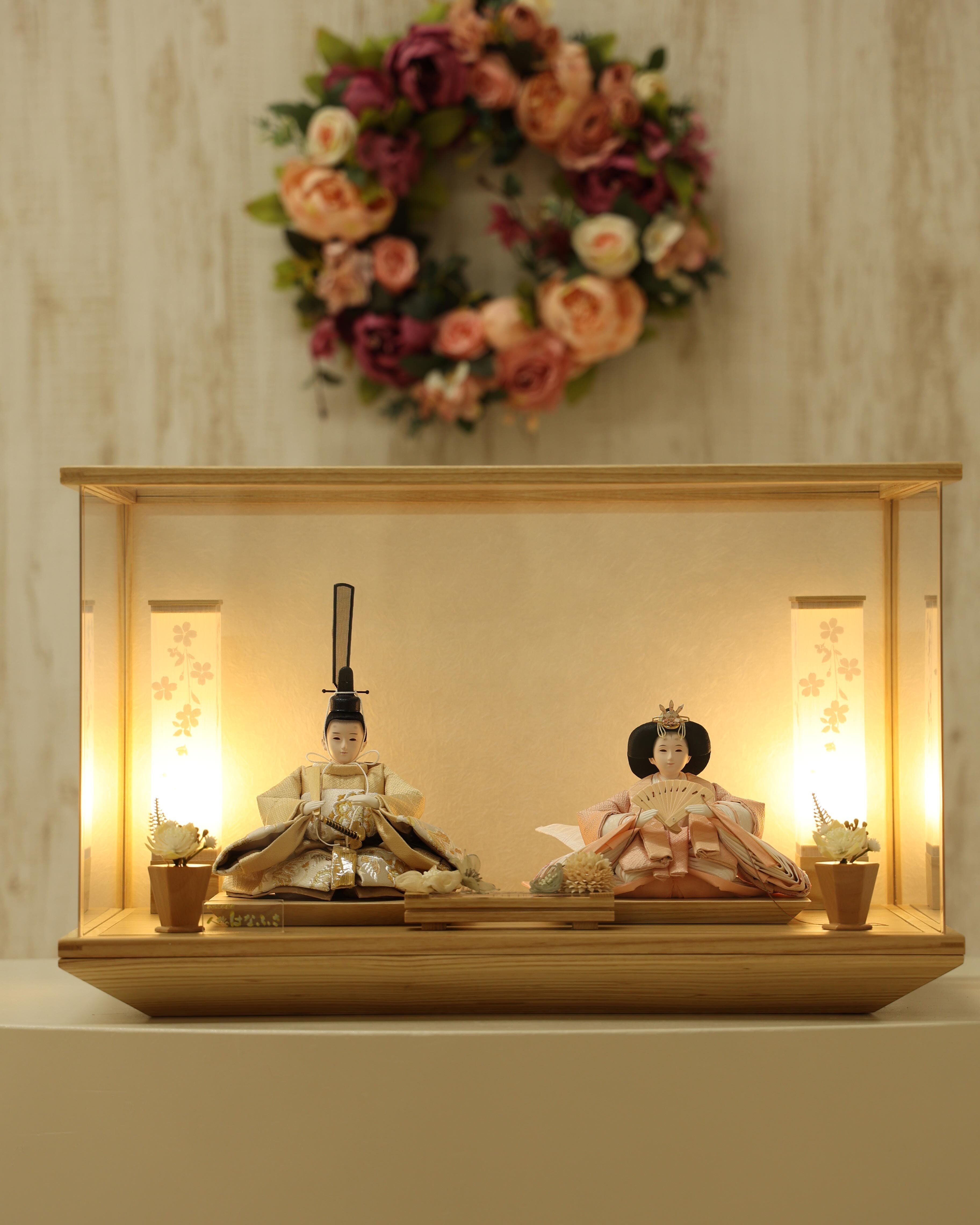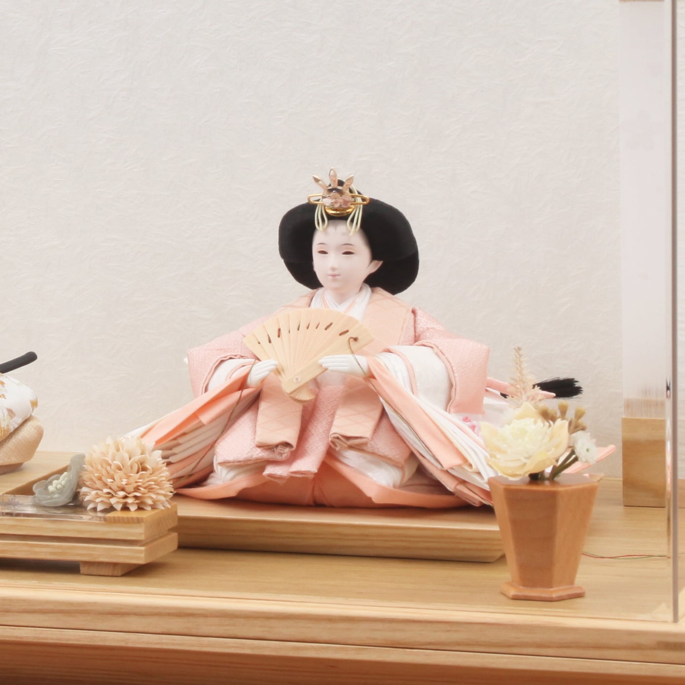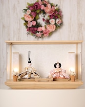 柔らかなベージュのお殿様と、淡い桃色が可憐なお姫様が並ぶ、優しく上品な雛飾りです。落ち着いた色合いの衣装が温かみを感じさせ、シンプルな木目のケースと相まって、明るく穏やかな雰囲気でお人形さんを引き立てます。和洋どちらのお部屋にも自然に馴染む、飾りやすい親王飾りです。