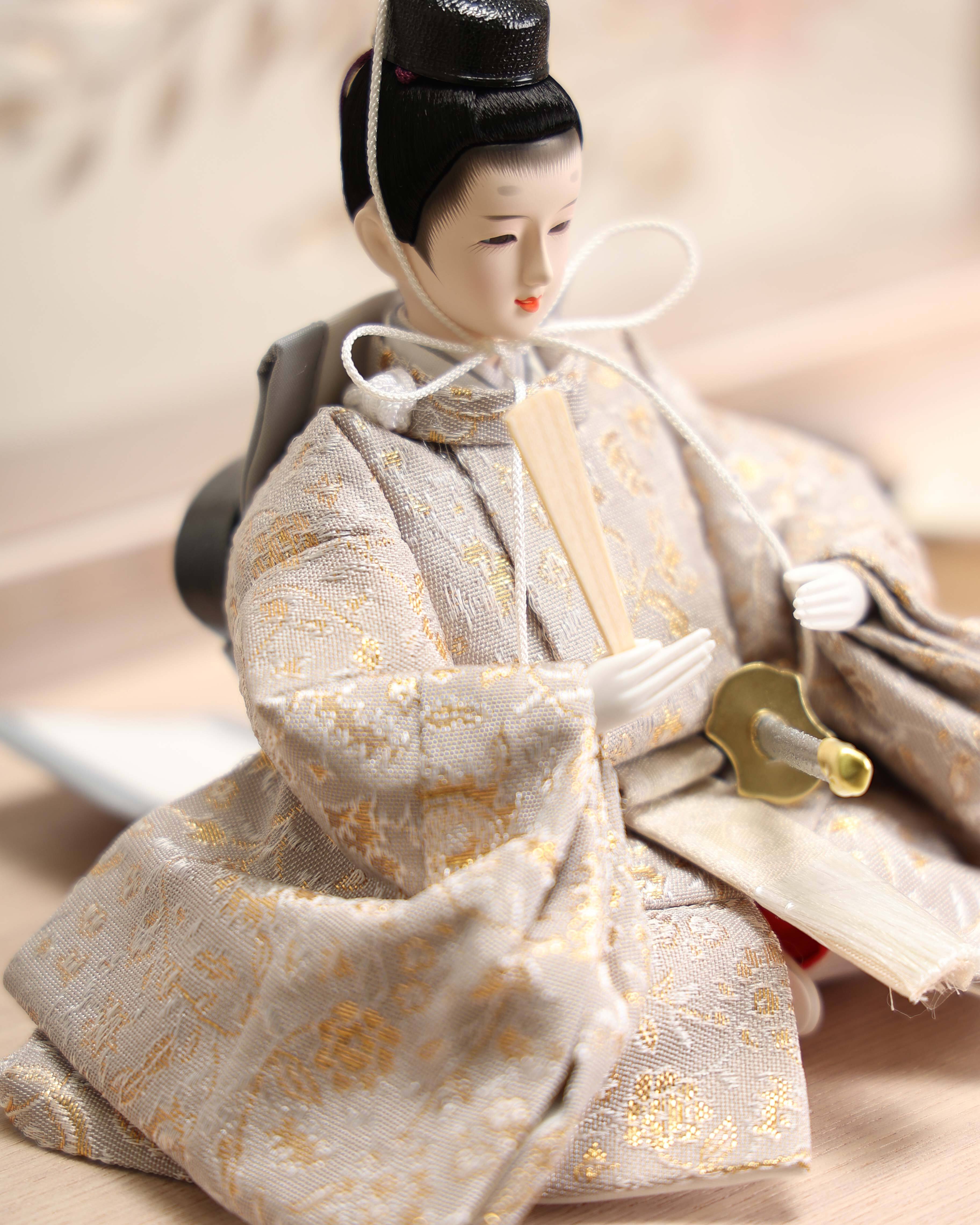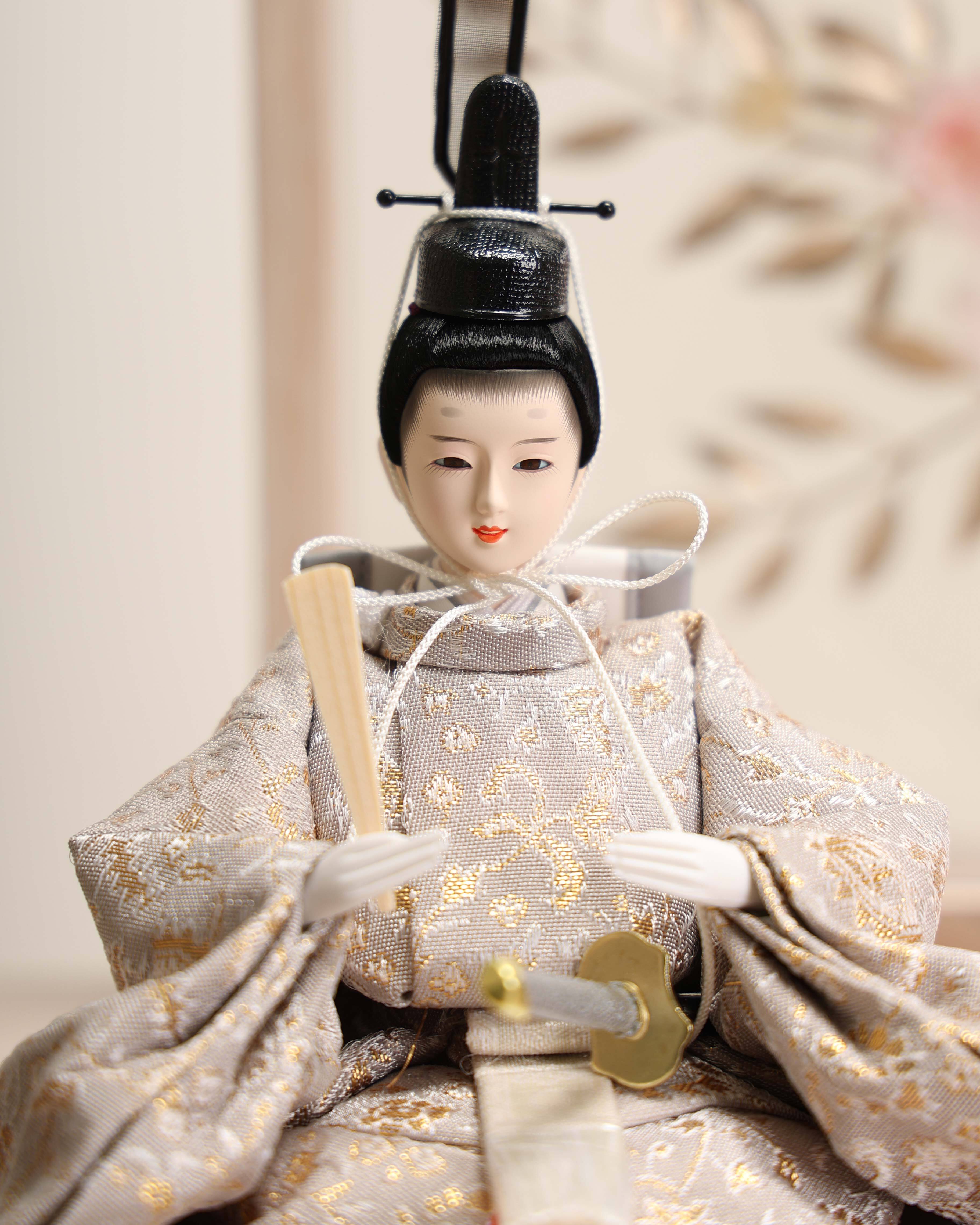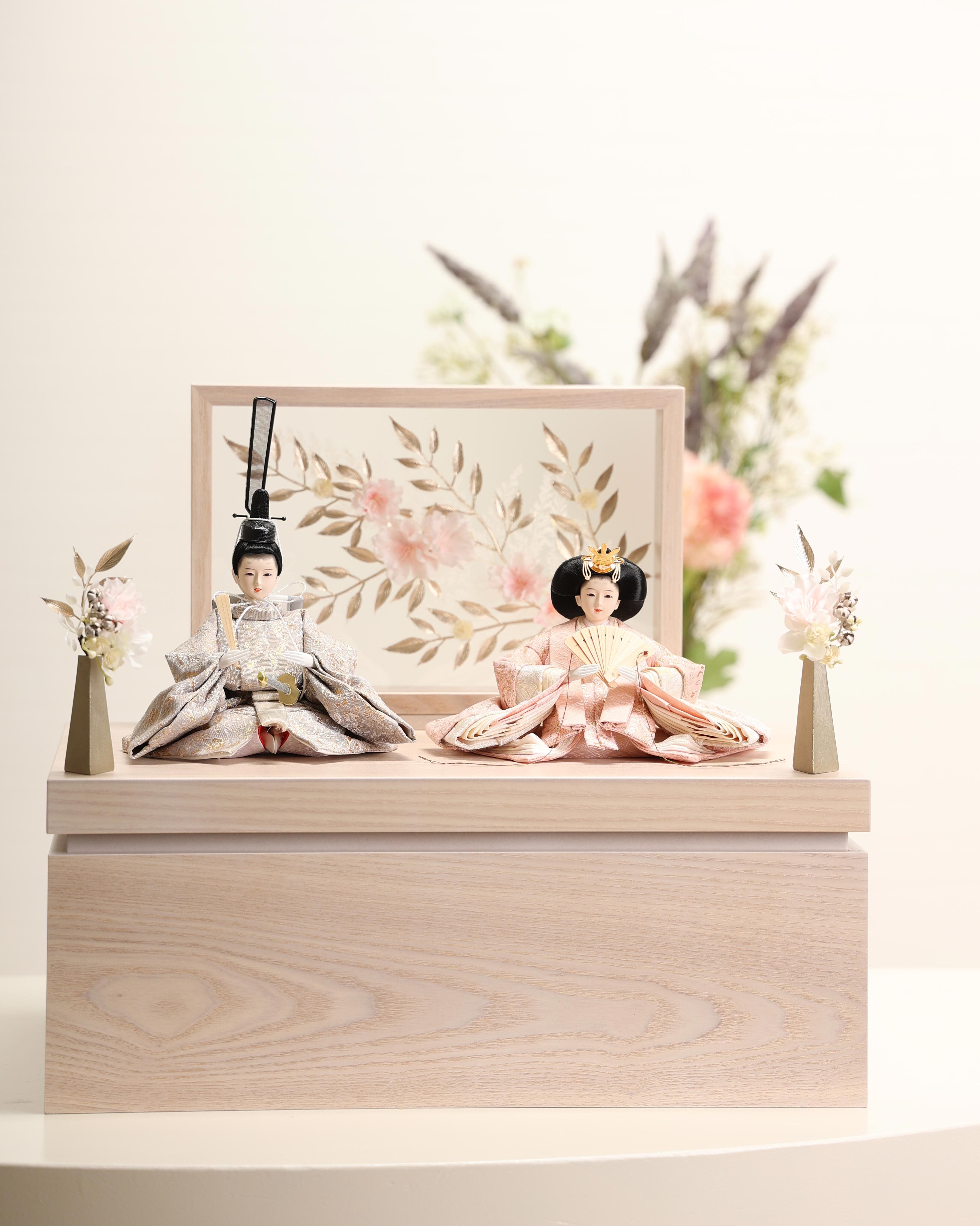 淡い銀白と優しい桜色をまとったお殿様とお姫様が並ぶ、清らかで洗練された雛飾りです。控えめな光沢を含んだ衣装が落ち着いた華やぎを演出し、桜花をあしらった背景と明るい木目の木枠が、全体をやさしく包み込みます。空間にすっと馴染む端正な佇まいで、和室・洋室を問わず心地よく飾れる親王飾りです。