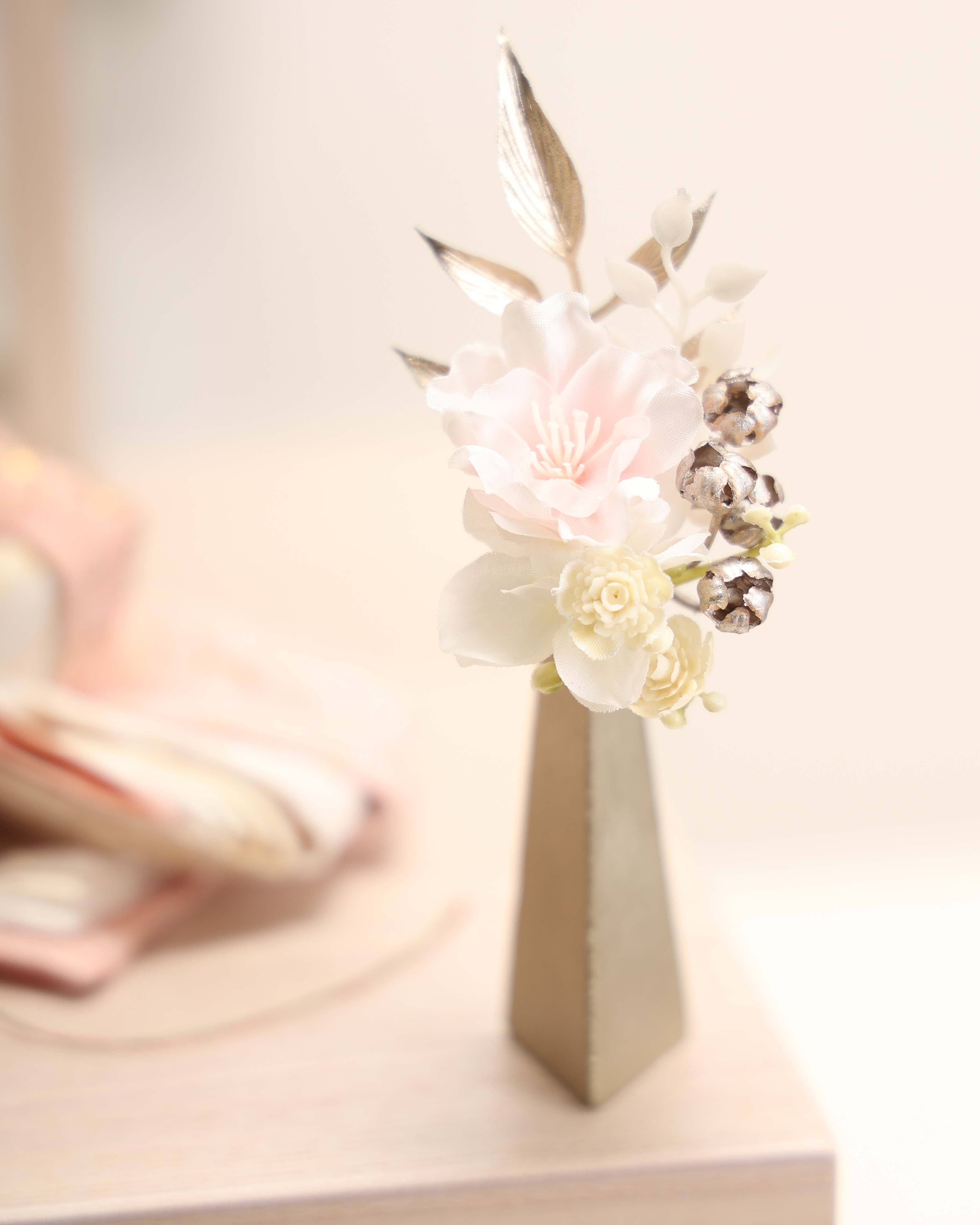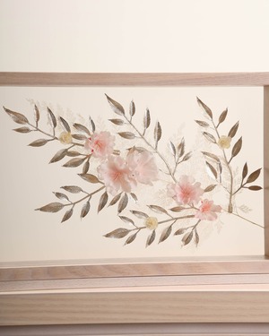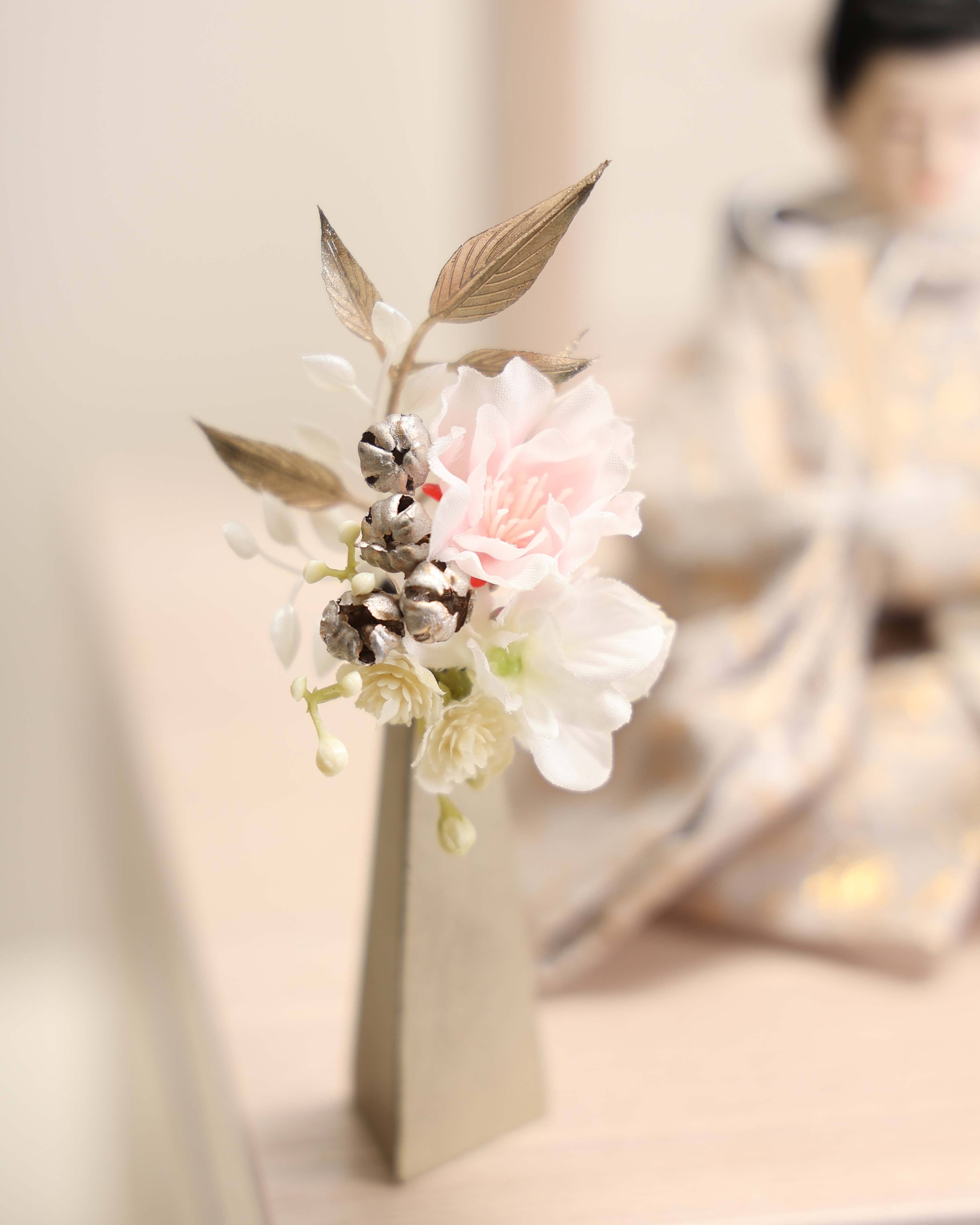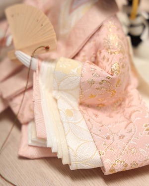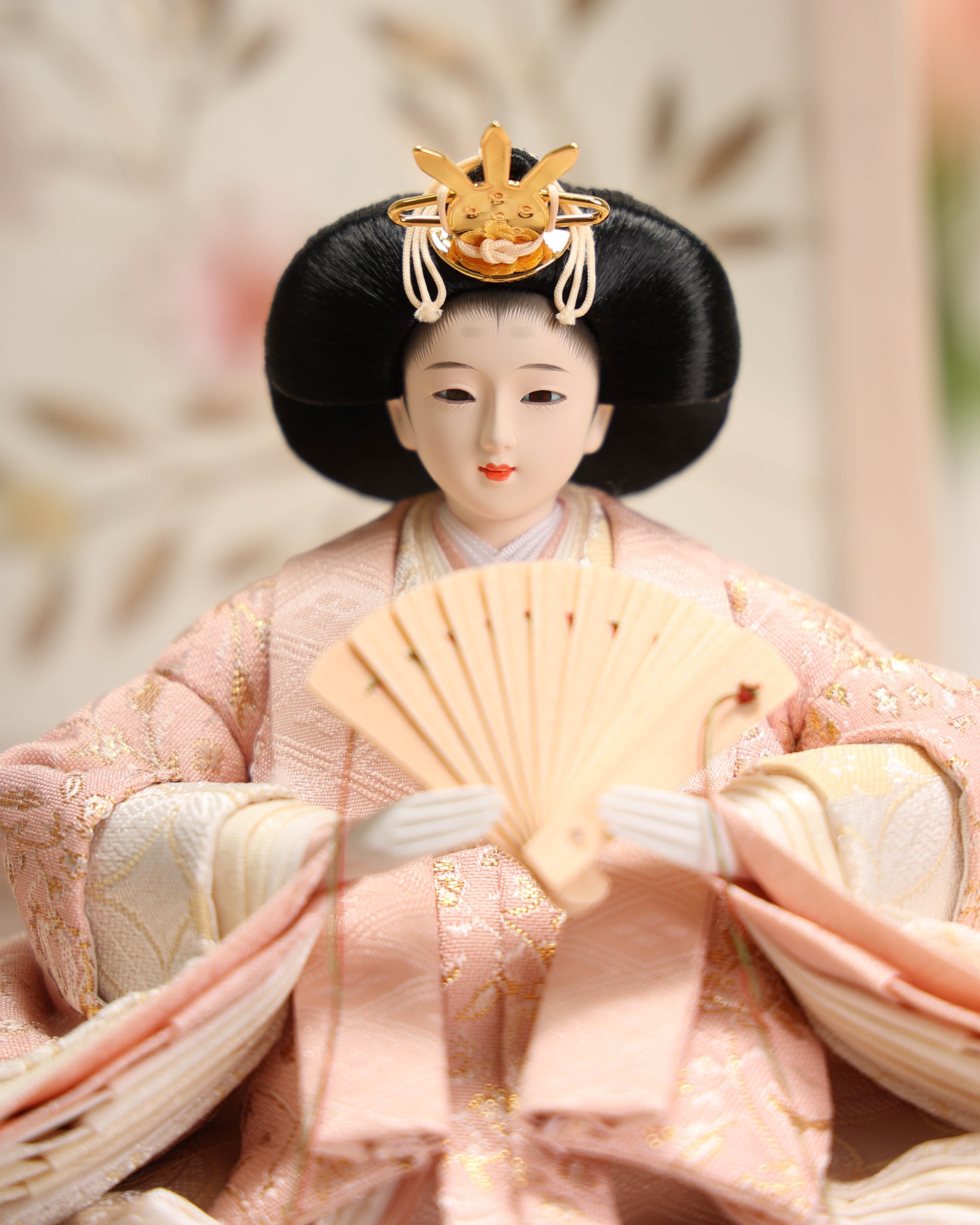 淡い銀白と優しい桜色をまとったお殿様とお姫様が並ぶ、清らかで洗練された雛飾りです。控えめな光沢を含んだ衣装が落ち着いた華やぎを演出し、桜花をあしらった背景と明るい木目の木枠が、全体をやさしく包み込みます。空間にすっと馴染む端正な佇まいで、和室・洋室を問わず心地よく飾れる親王飾りです。