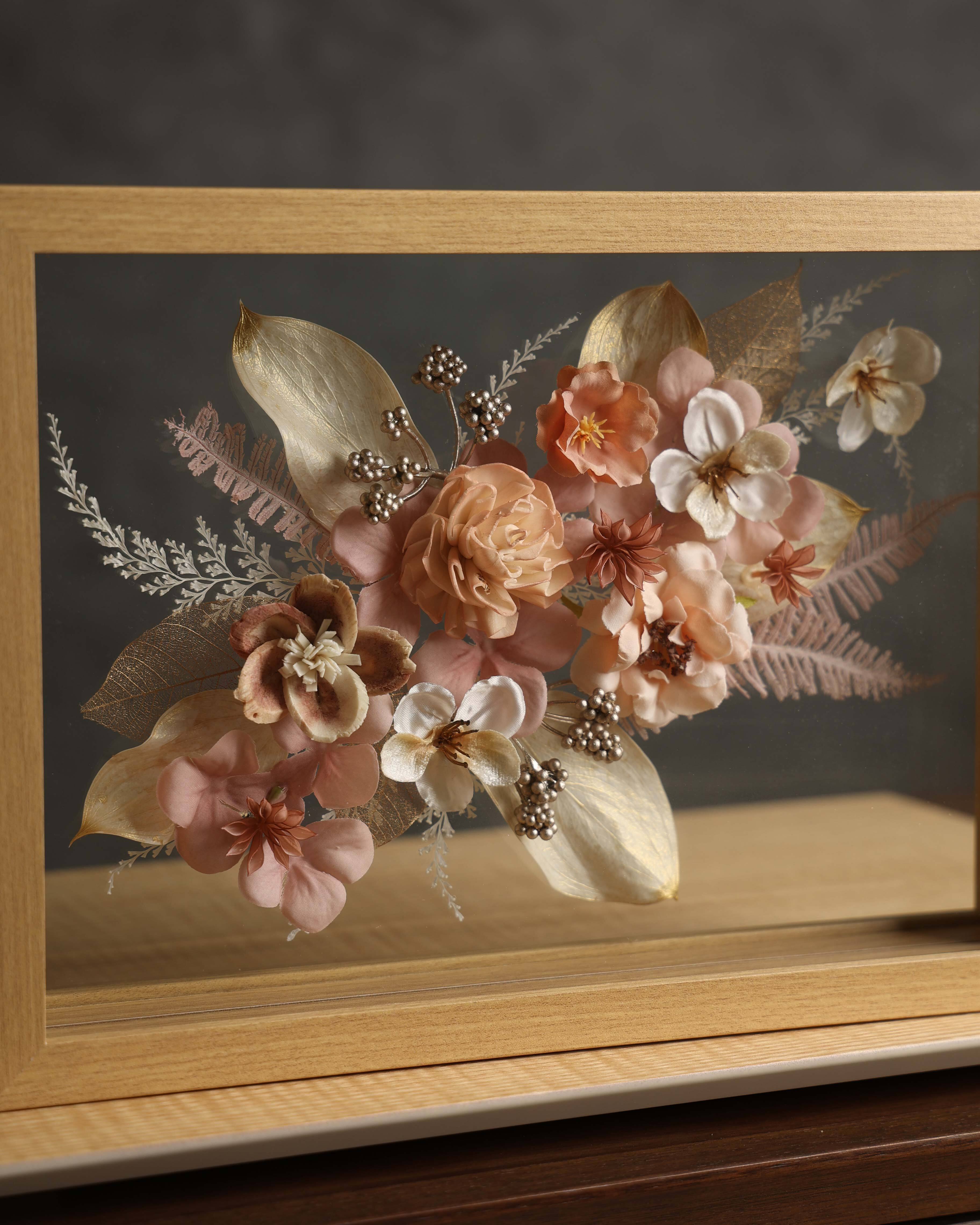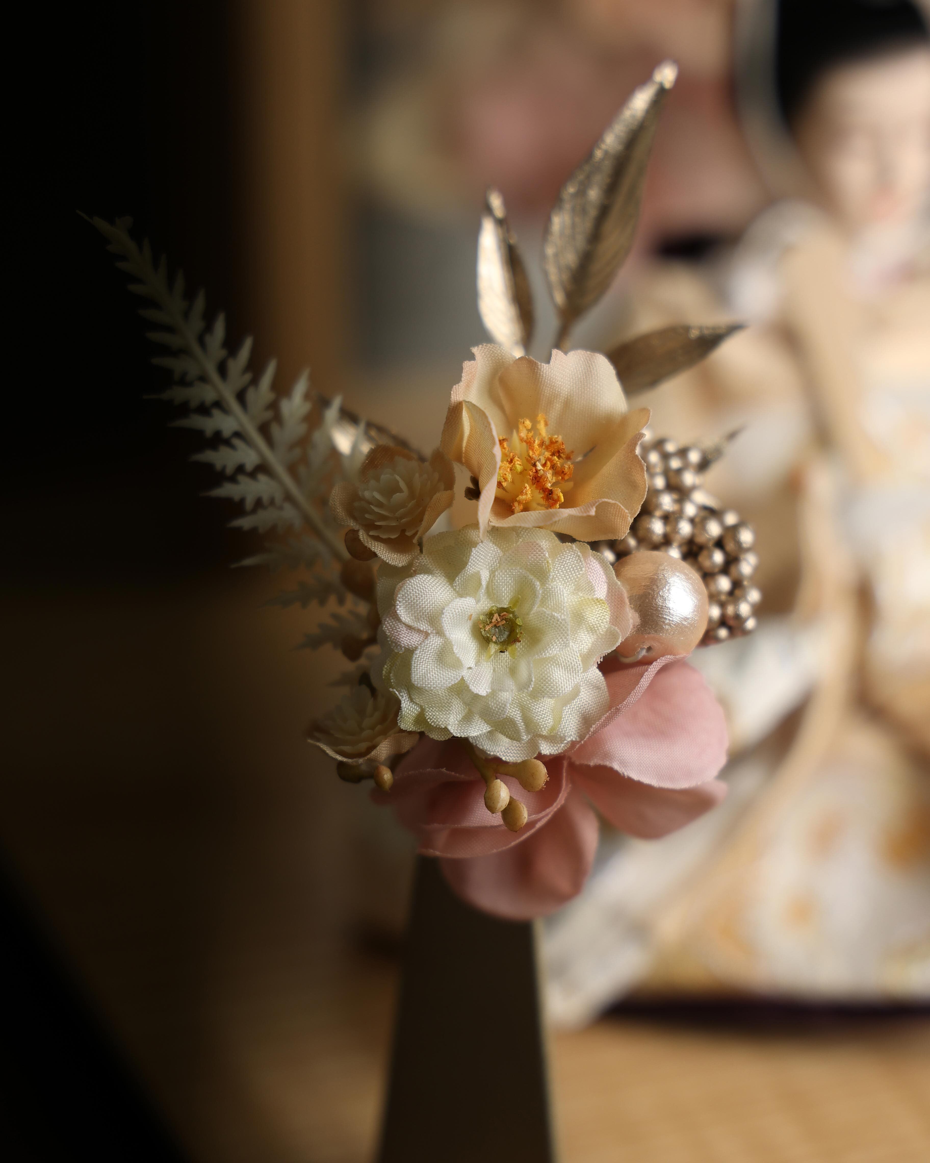 やわらかな金彩を含んだ生成りのお殿様と、深みのある紅をまとったお姫様が並ぶ、華やかさと気品を兼ね備えた雛飾りです。落ち着いた色調の衣装に、立体的な花々を配した背景が奥行きを添え、温もりある木目の枠と調和しながら格調高い佇まいを演出します。空間を美しく引き締める存在感があり、和洋を問わず上質な雰囲気で楽しめる親王飾りです。