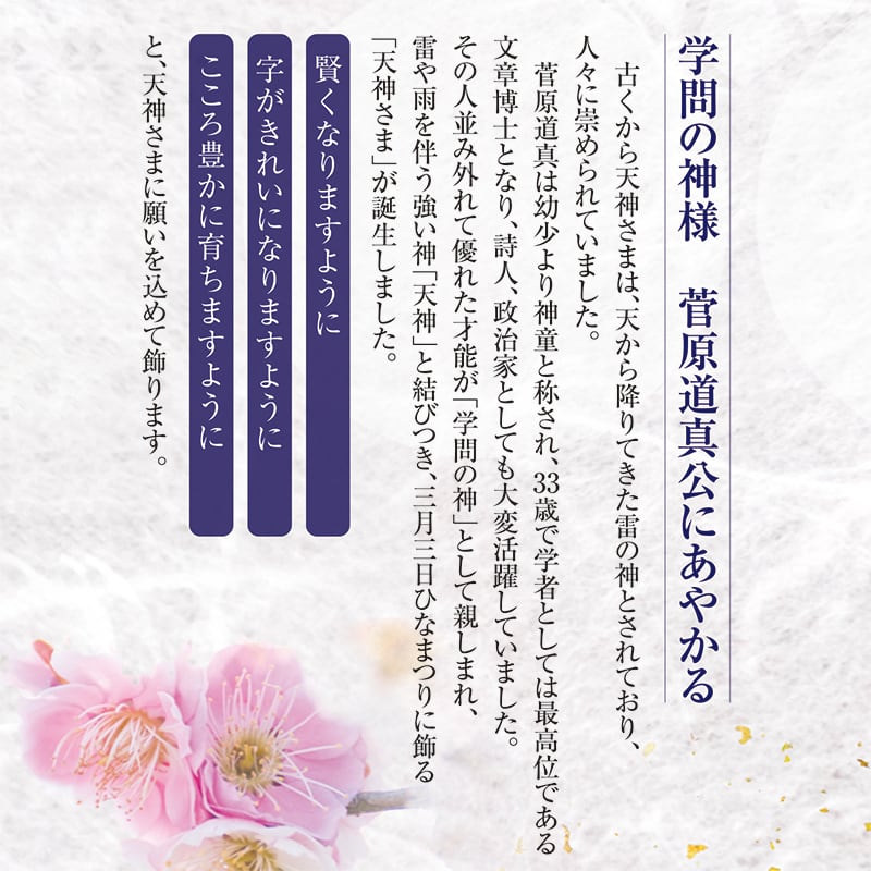 山陰・東海など一部の地域では3月3日(地域によっては4月3日)に男児のひな祭りとして学問の神様 菅原道真公の卓越した才能にあやかれるよう願いを込めて天神様を飾ります。