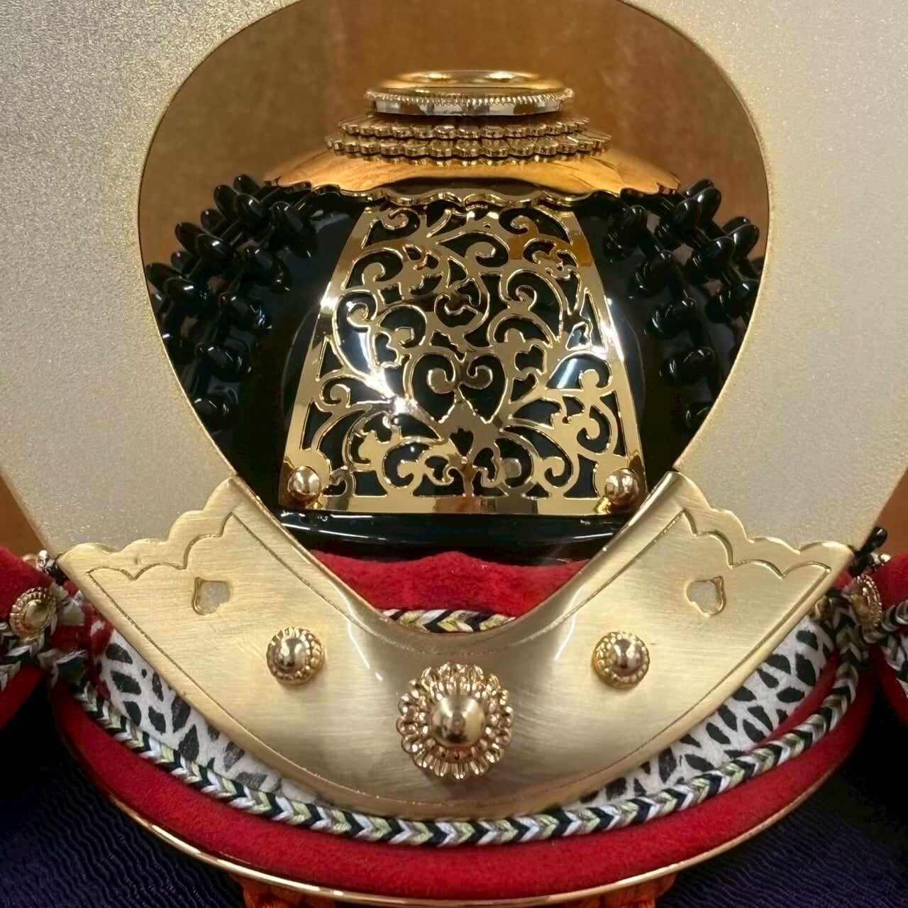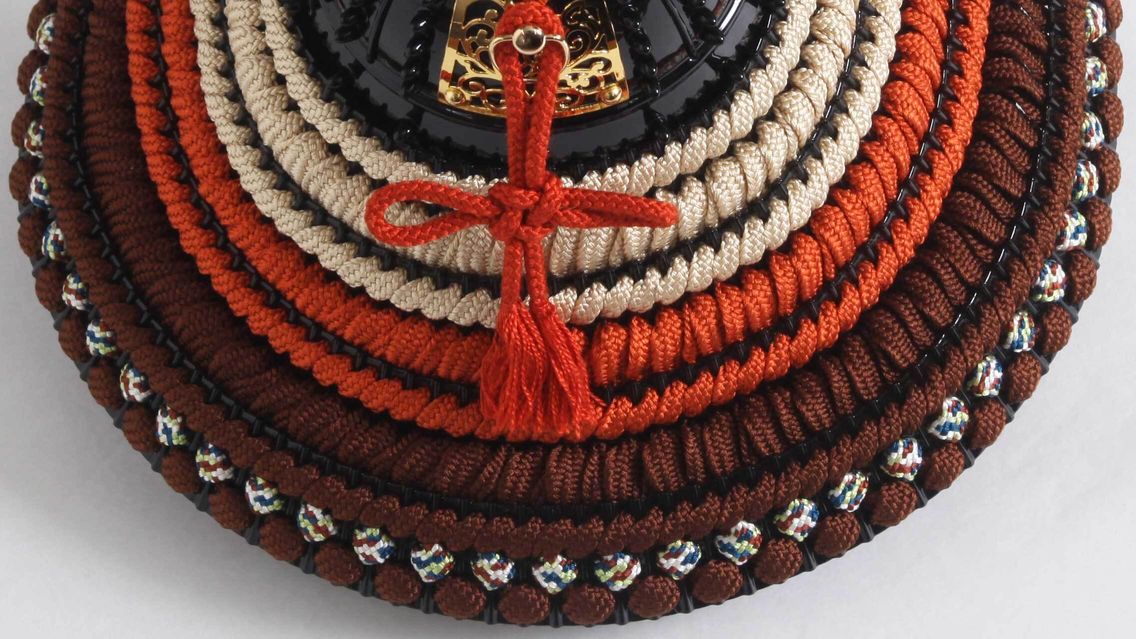 兜の鉢を天空に見立てて打ち込む鋲頭を星と呼びます。その無数の星を持つ兜が鎌倉時代にみられる星兜です。丹念に叩き上げて形成した真鍮製の鉢に一つ一つ手作業で隙間なく乱れなく星を打ち、重厚さを表現しています。また、金色に輝く、前後の柊の葉の彫金の地板や、五枚の板を見事に重ね合せた八幡座が兜鉢のもつ美しさをより引き立てています。