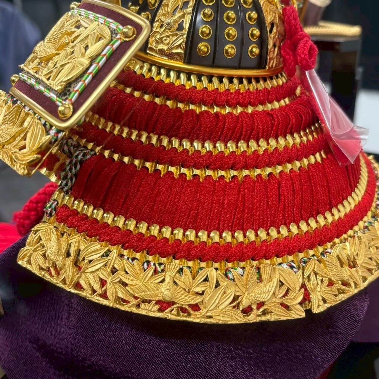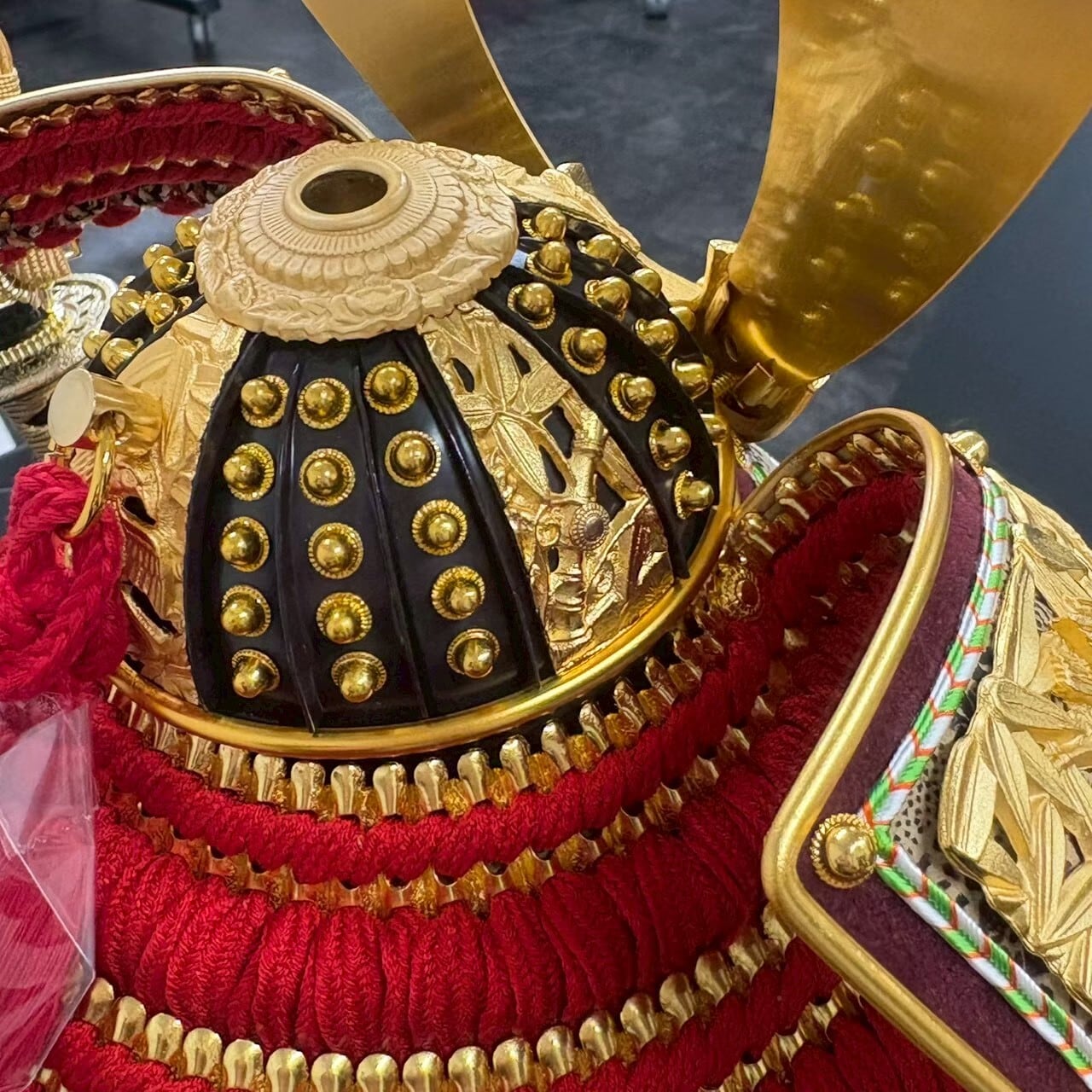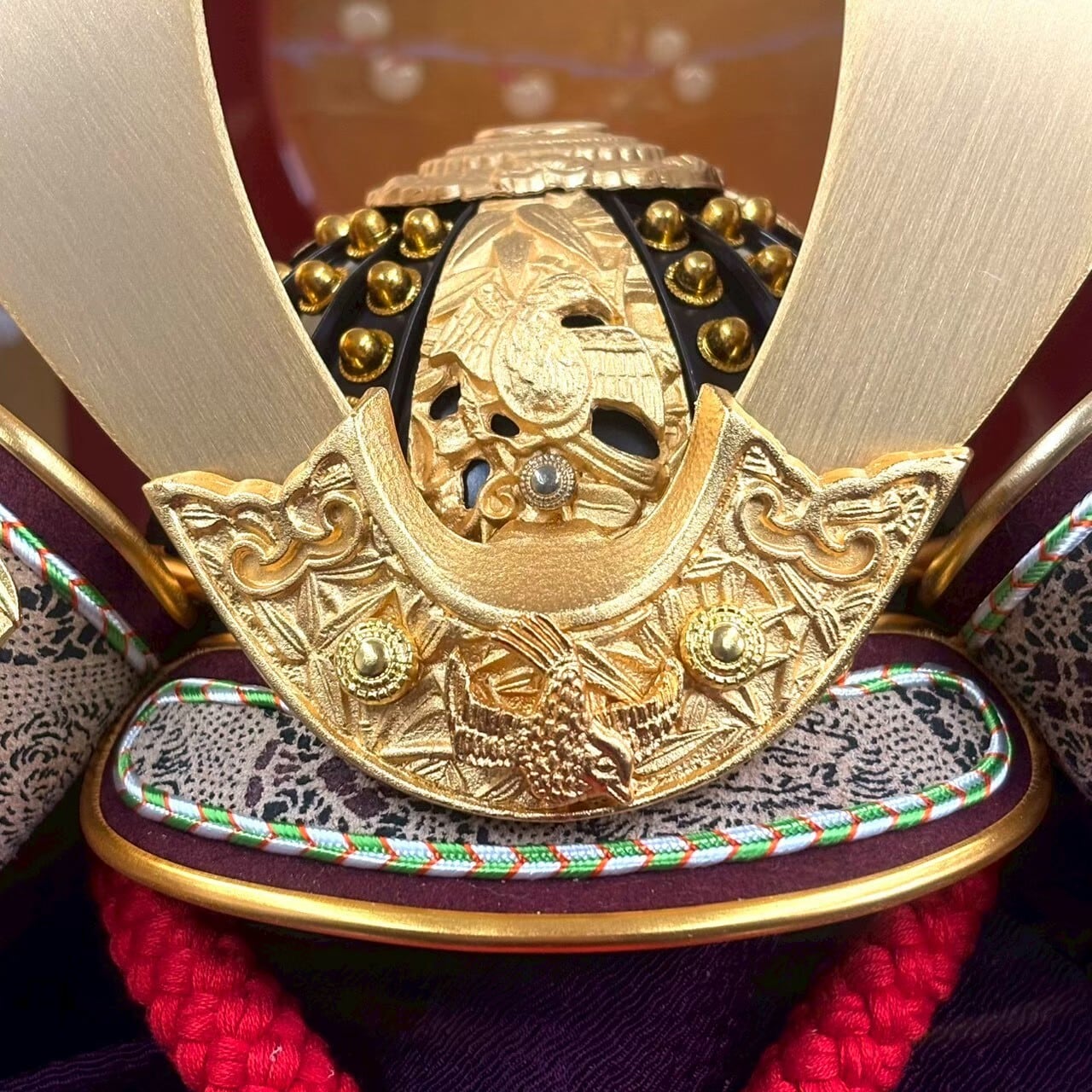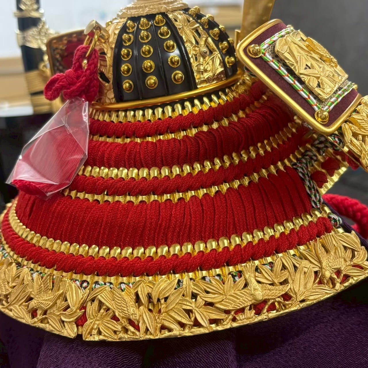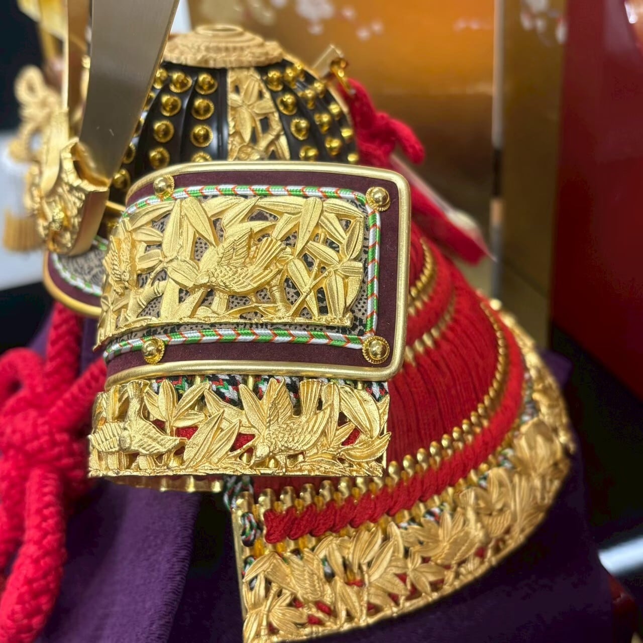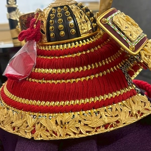 国宝の竹雀金物赤糸威を模写した兜です。