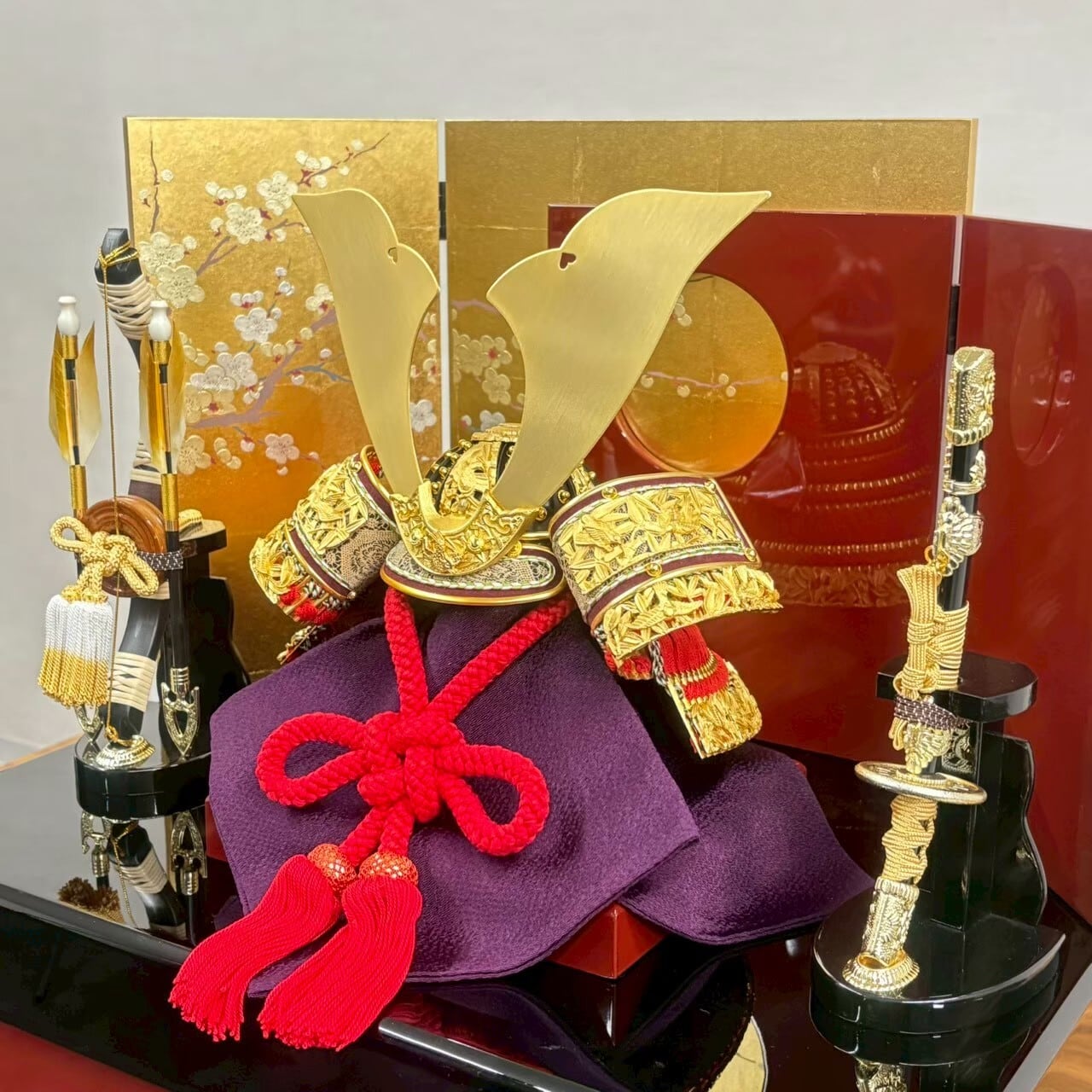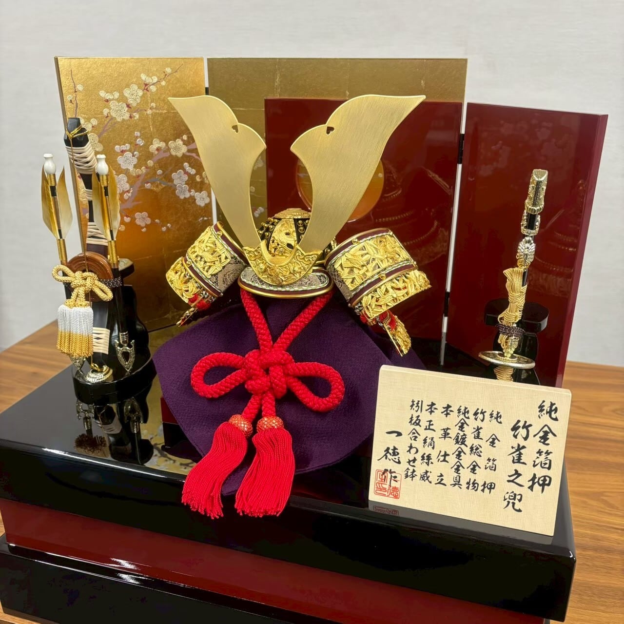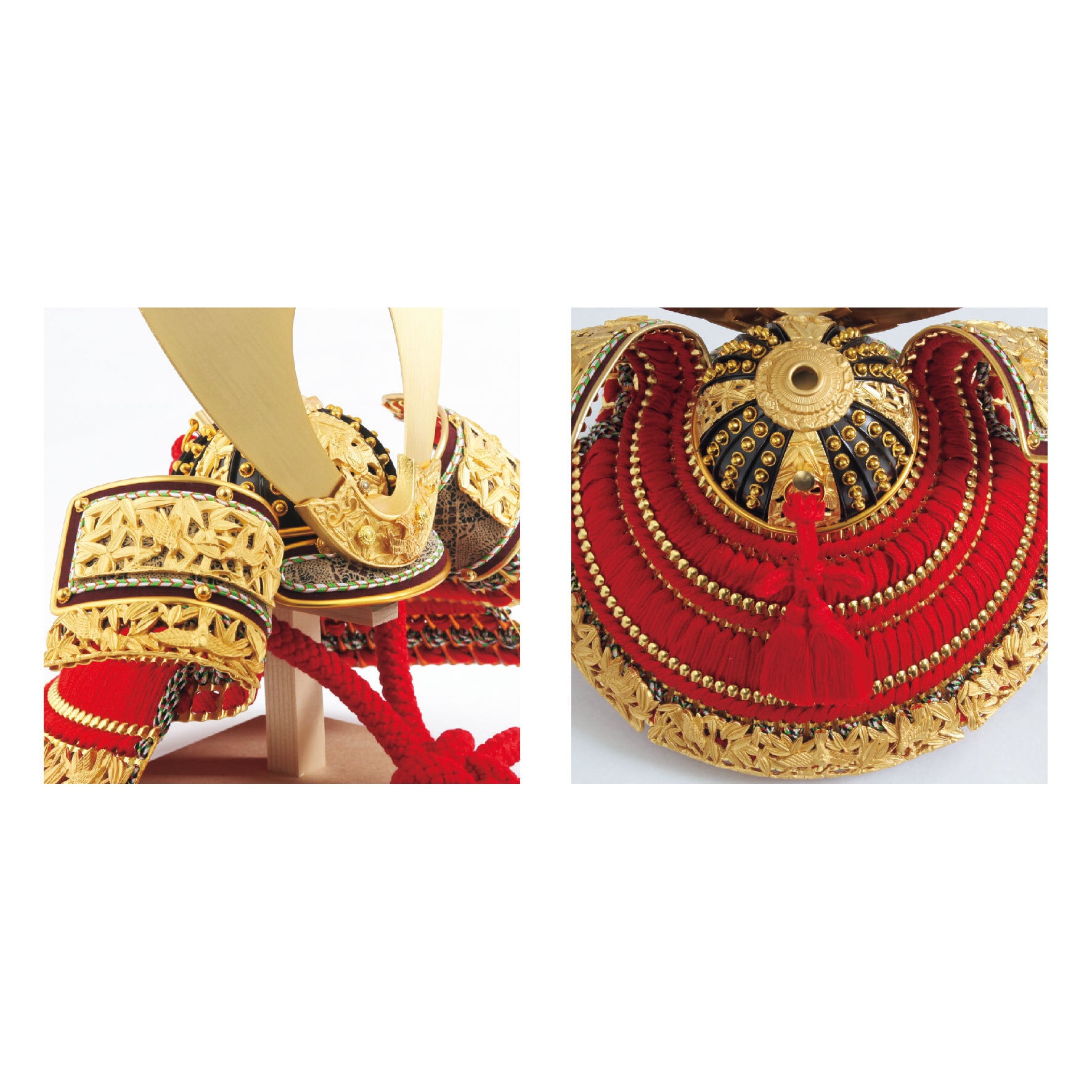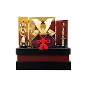 朱と金の二色の重ね屏風に、豪華な金物を装飾した兜を合せ、コンパクトながら重厚感のあるセットになっています。