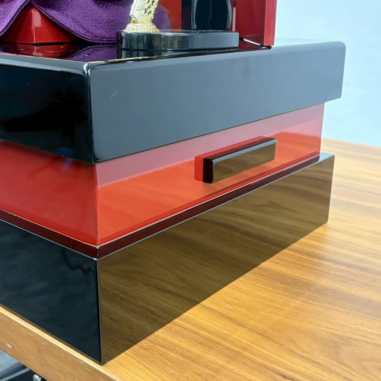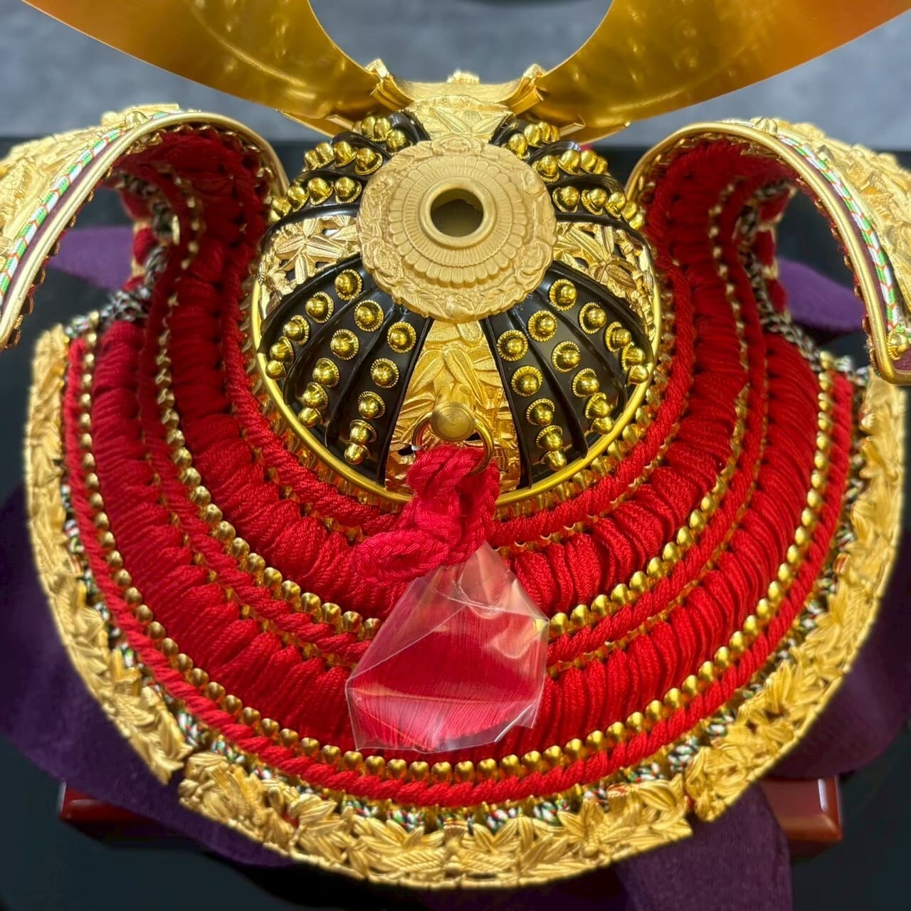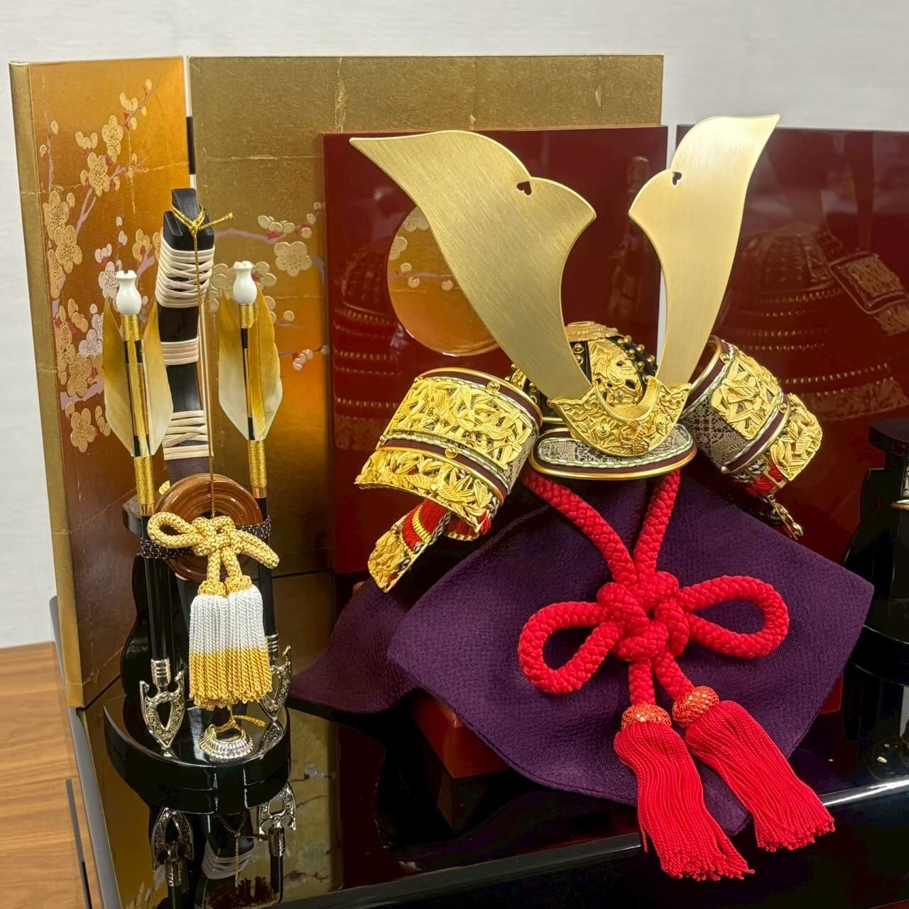 朱と金の二色の重ね屏風に、豪華な金物を装飾した兜を合せ、コンパクトながら重厚感のあるセットになっています。