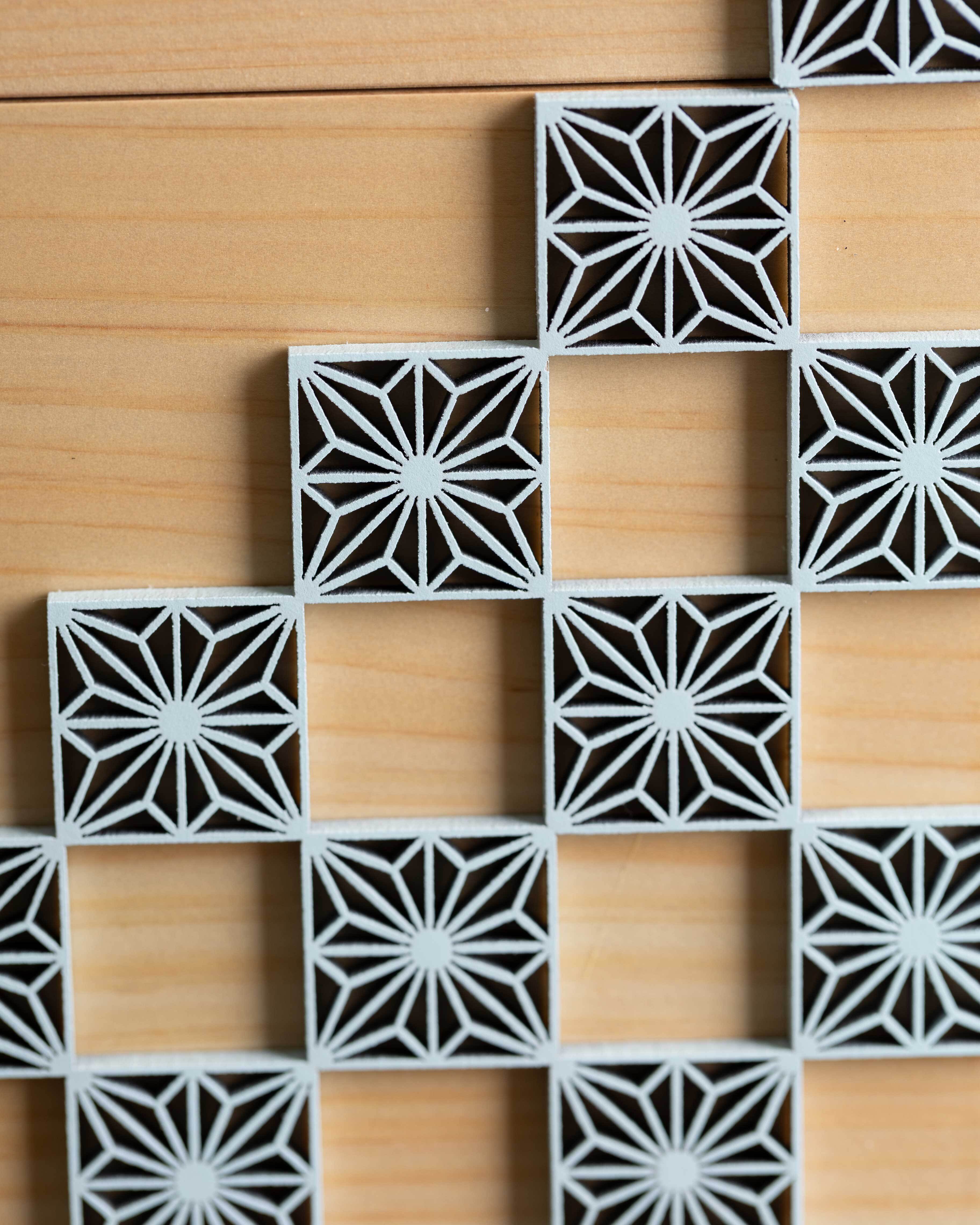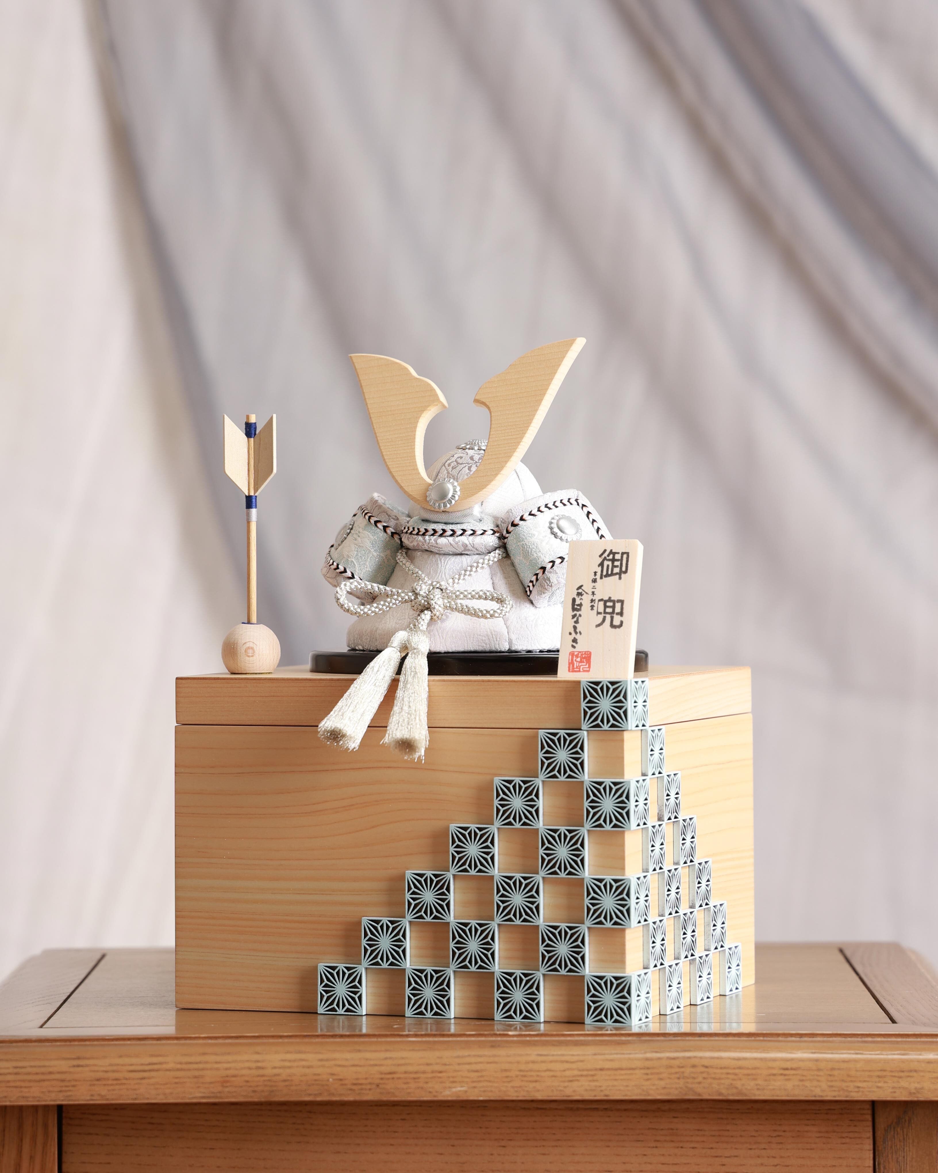 収納箱には、健やかな成長を願う吉祥文様「麻の葉」模様のパネルをあしらいました。まっすぐに伸びる麻にちなむ縁起柄が、落ち着いた木目と調和し、さりげない華やかさを添えます。