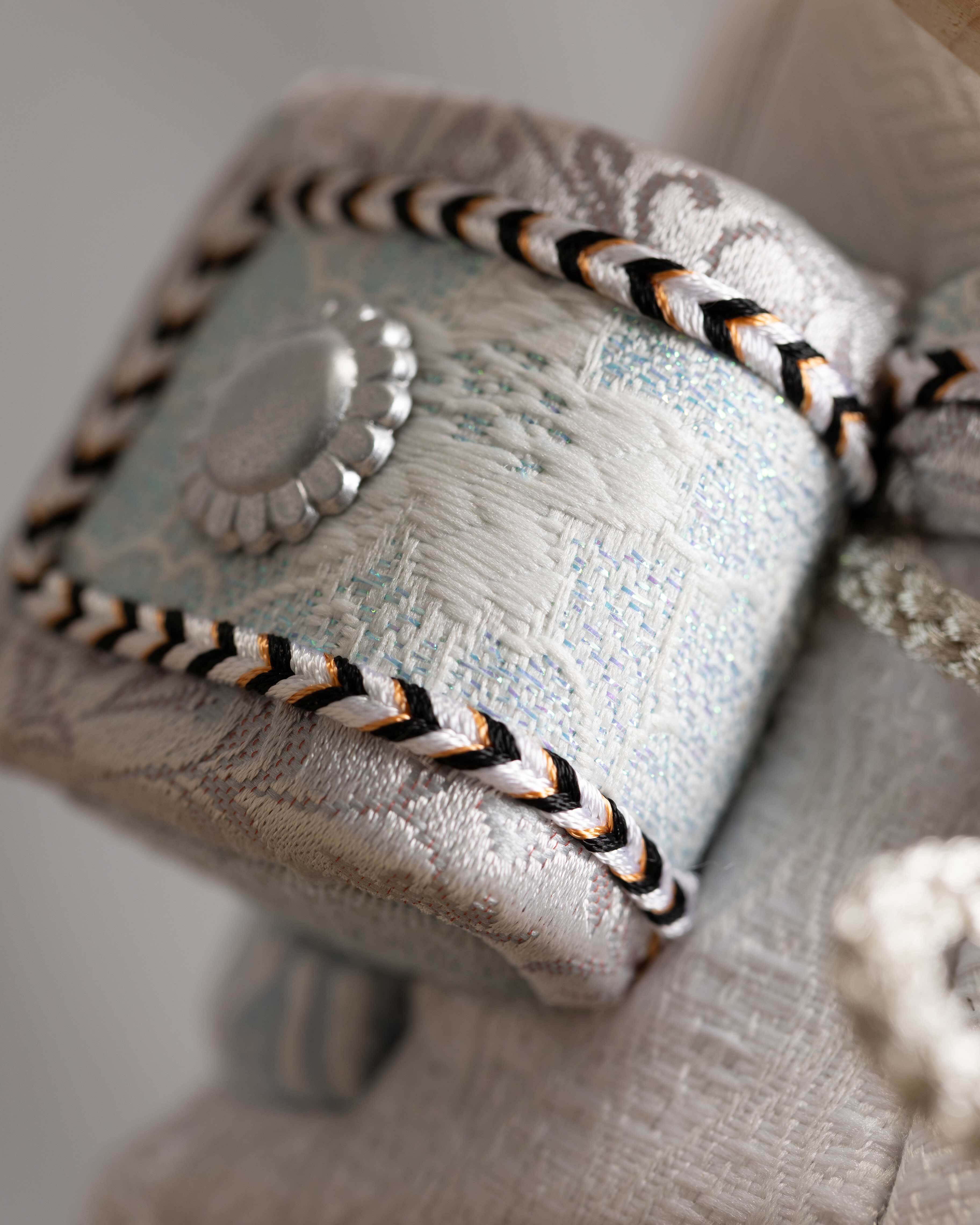 伝統技法「木目込み」により、一つひとつ丁寧に仕立てた五月人形です。布地を溝に沿って丁寧に埋め込むことで、ふっくらとした立体感とやわらかな風合いが生まれ、上品であたたかみのある表情に仕上がっています。