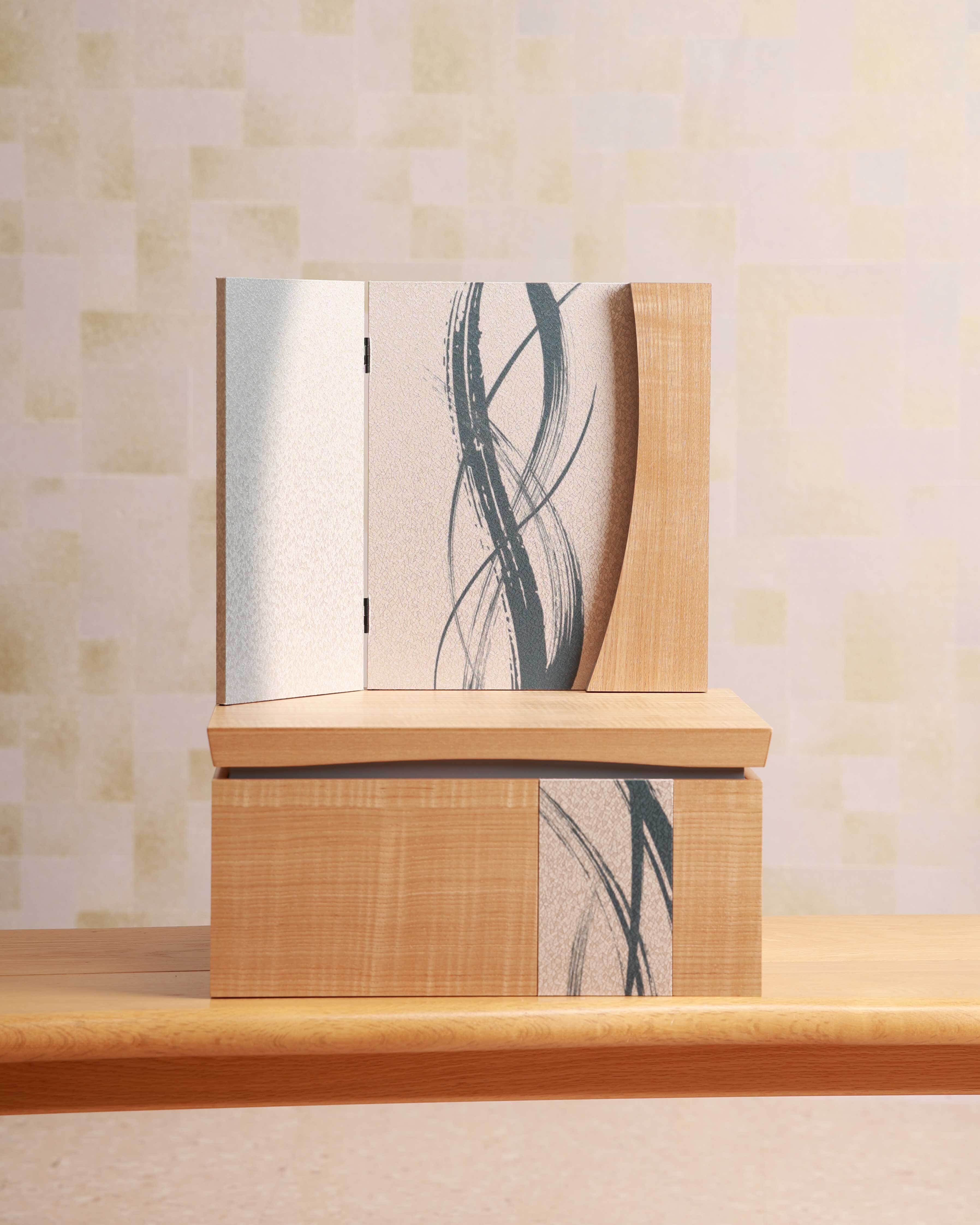 吹き返しには1894年創業の龍村美術織物の正倉院葡萄唐草紋錦を採用。