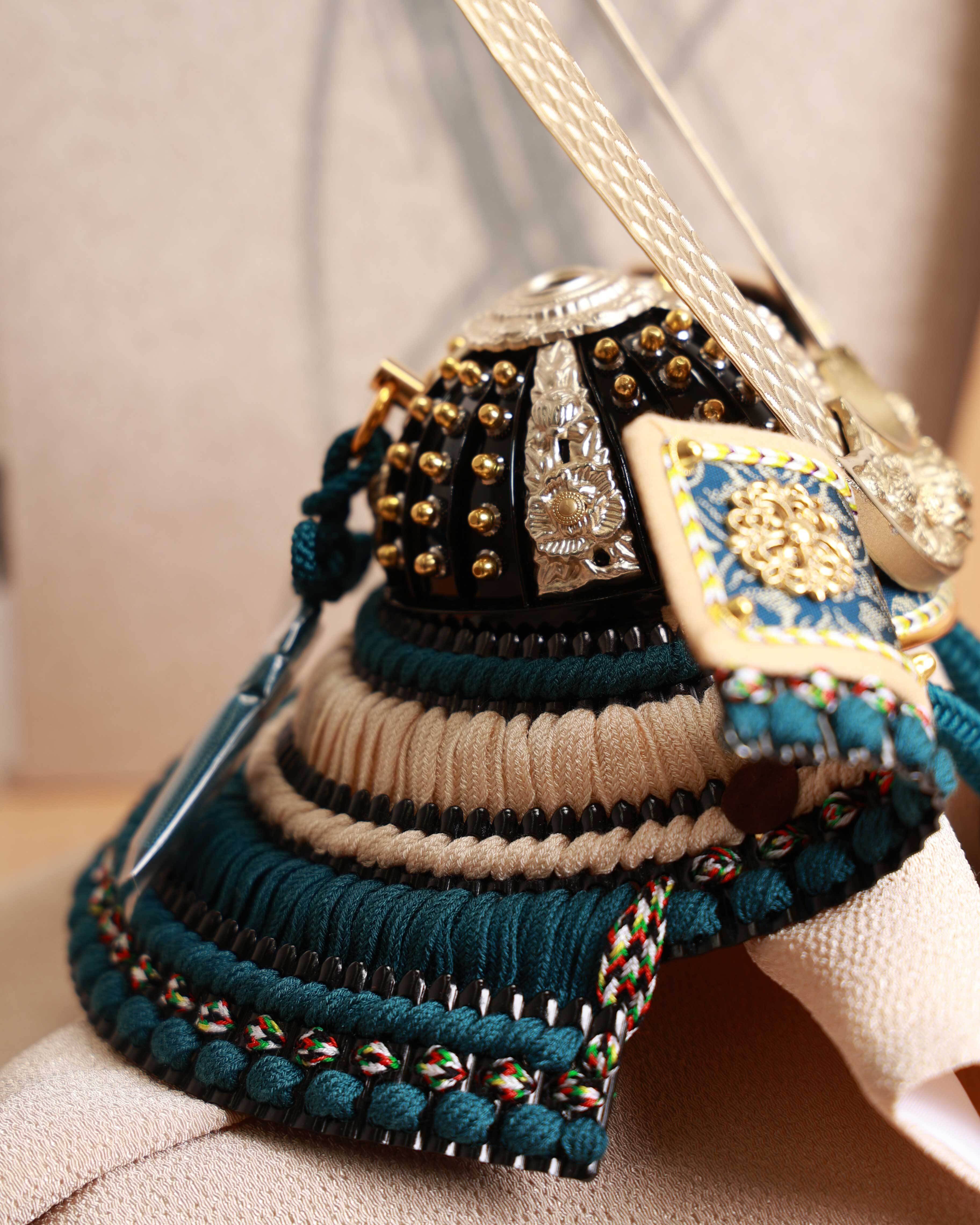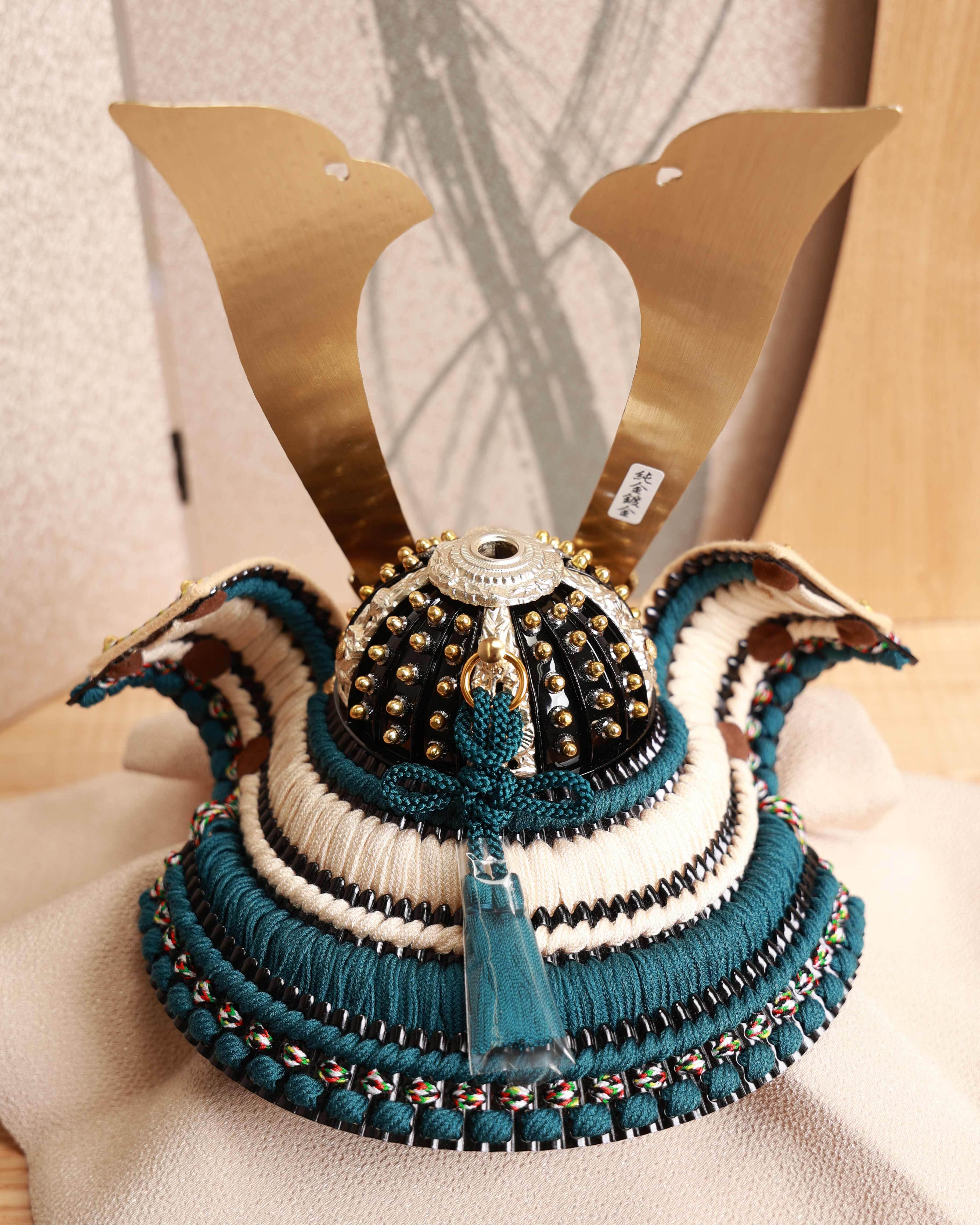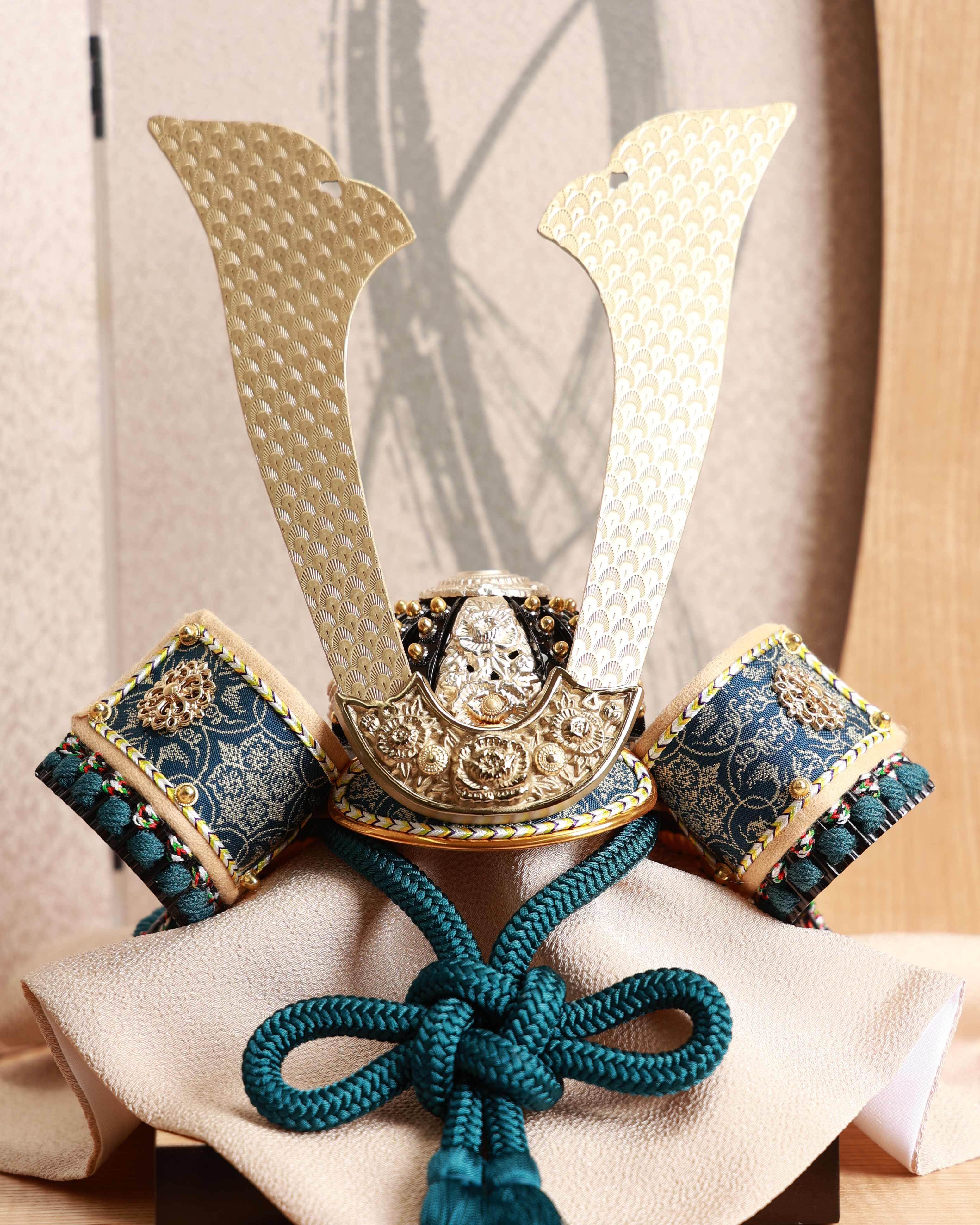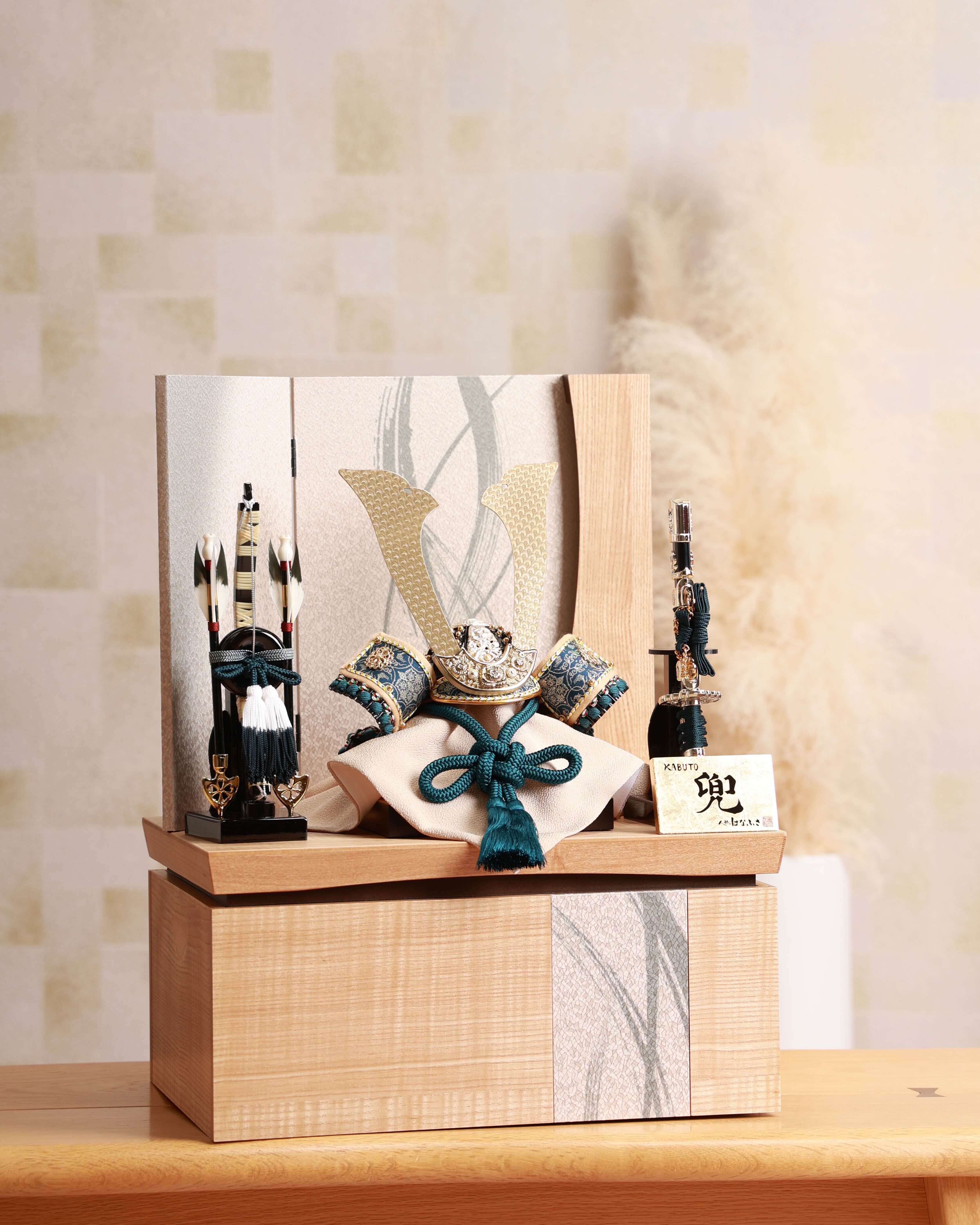 外務省の依頼を受け、日米首脳会談の贈答品を手掛けた、人形のはなふさの『亜麻色縅満天金星兜』。その格式高い逸品の小型シリーズです。