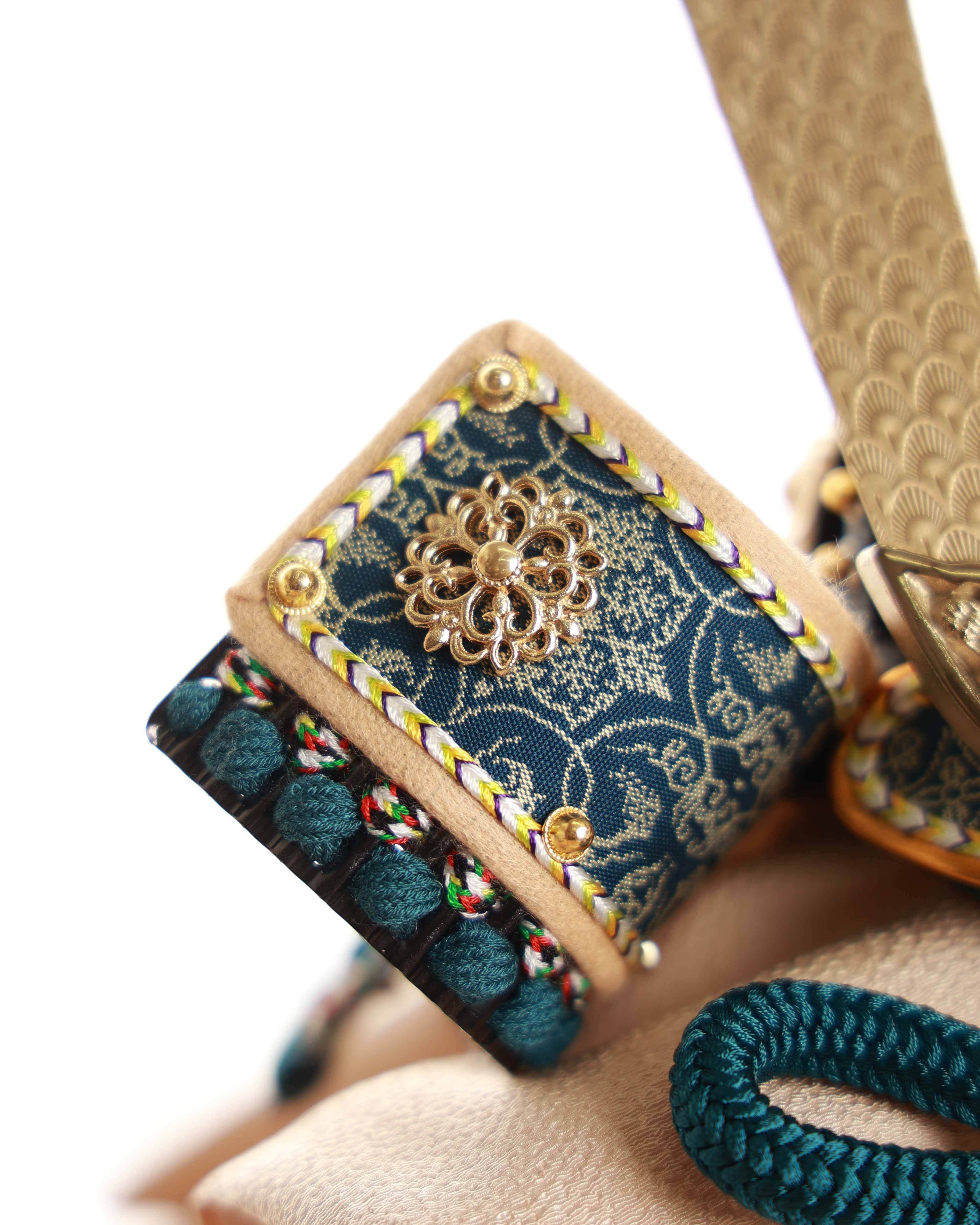 外務省の依頼を受け、日米首脳会談の贈答品を手掛けた、人形のはなふさの『亜麻色縅満天金星兜』。その格式高い逸品の小型シリーズです。