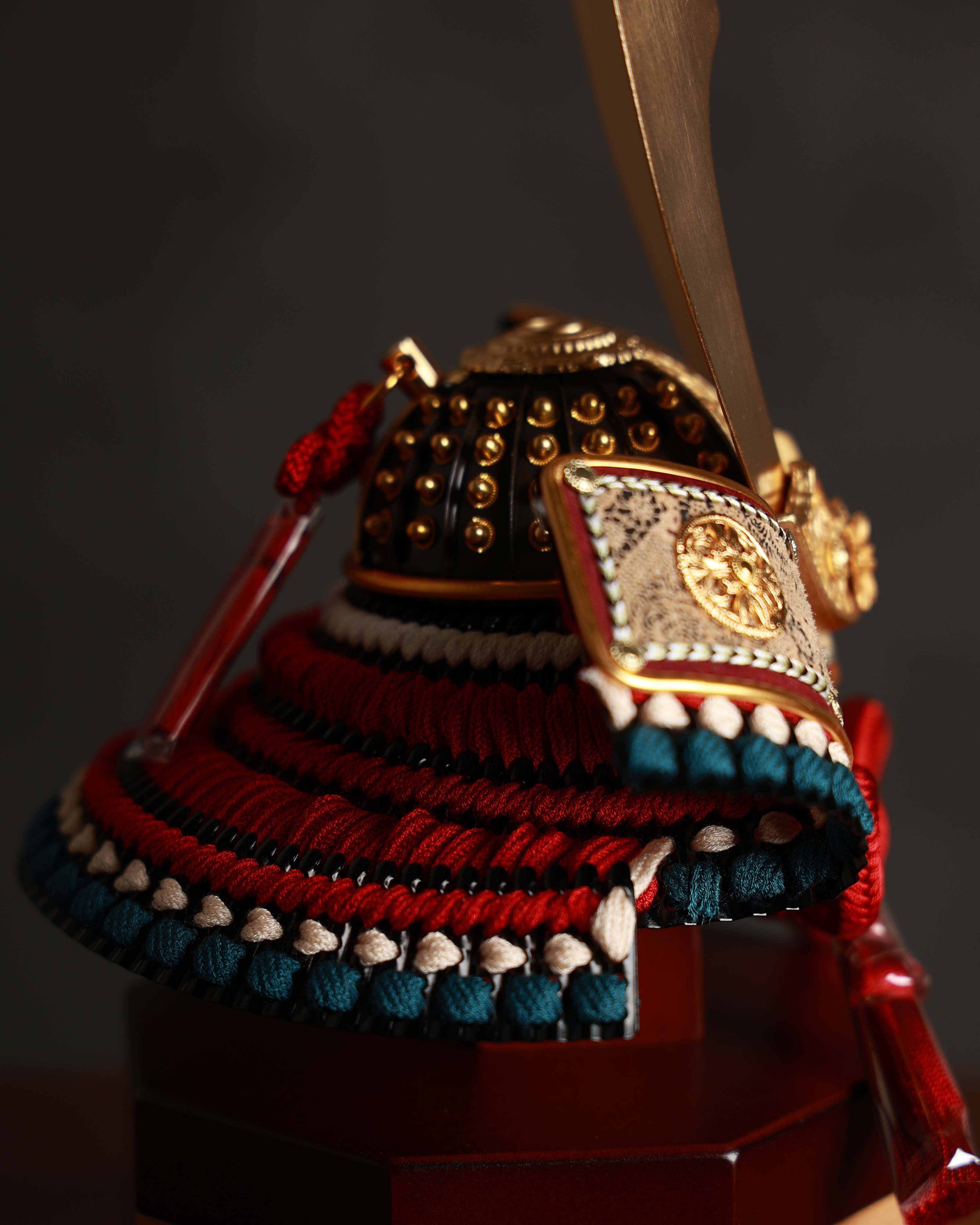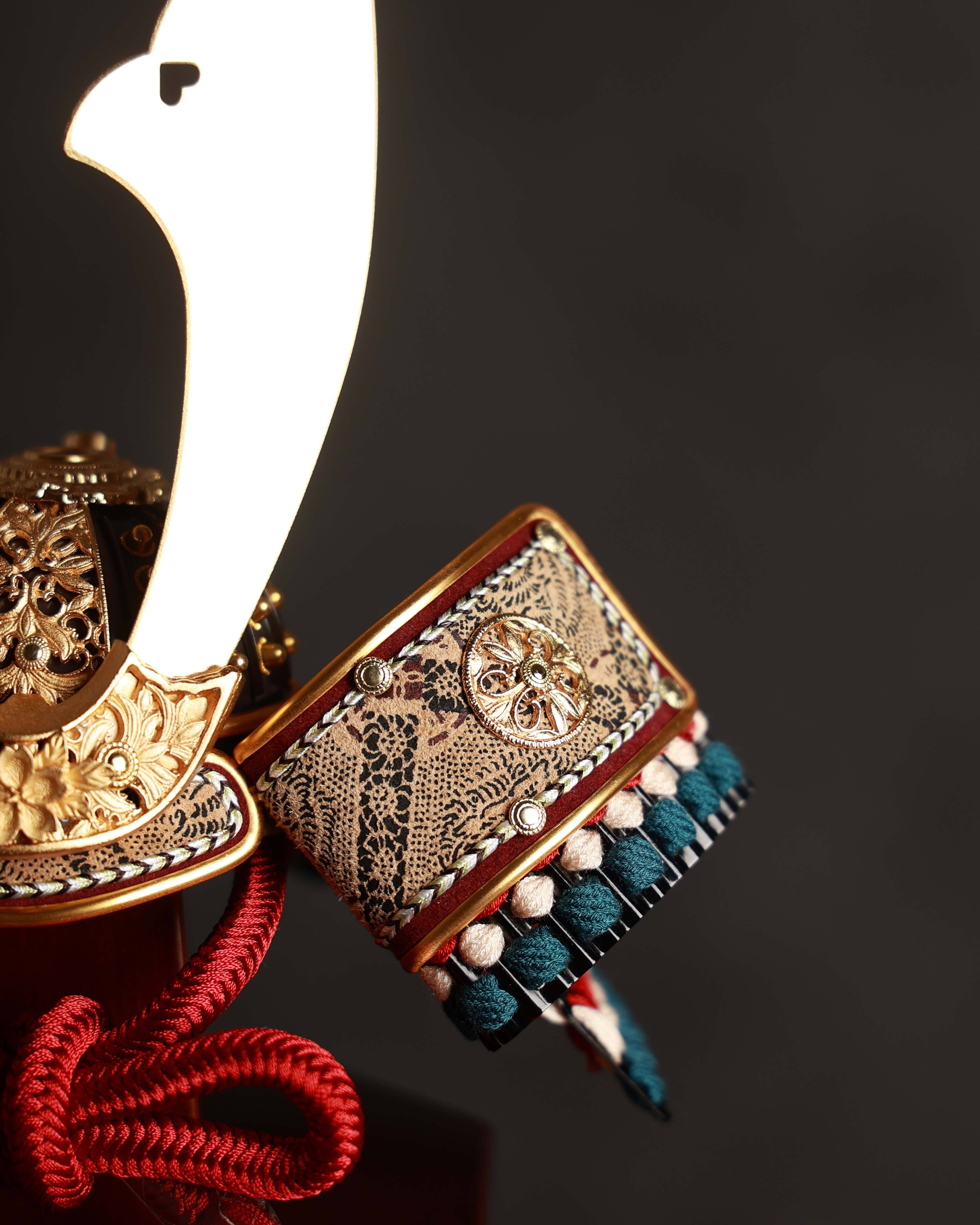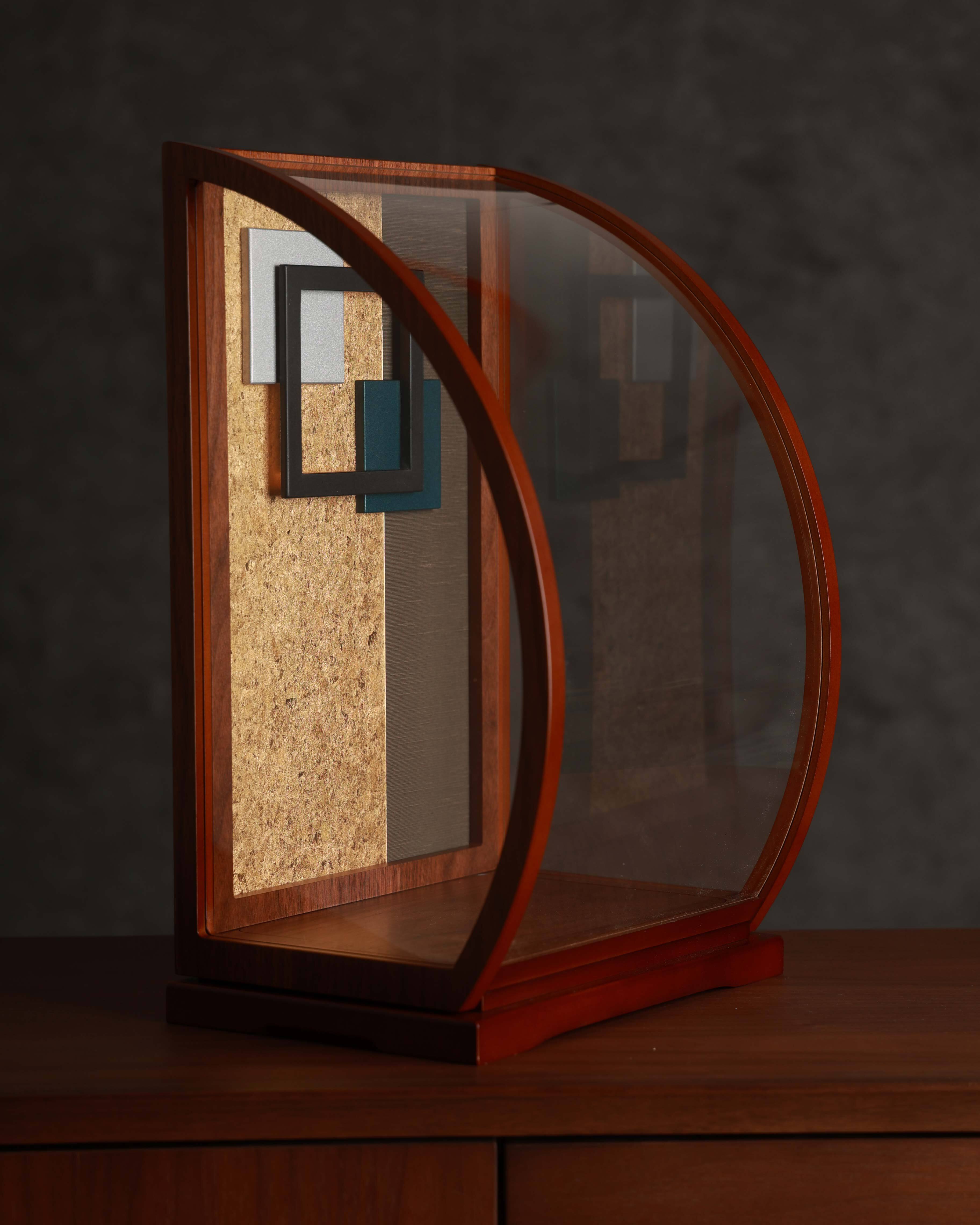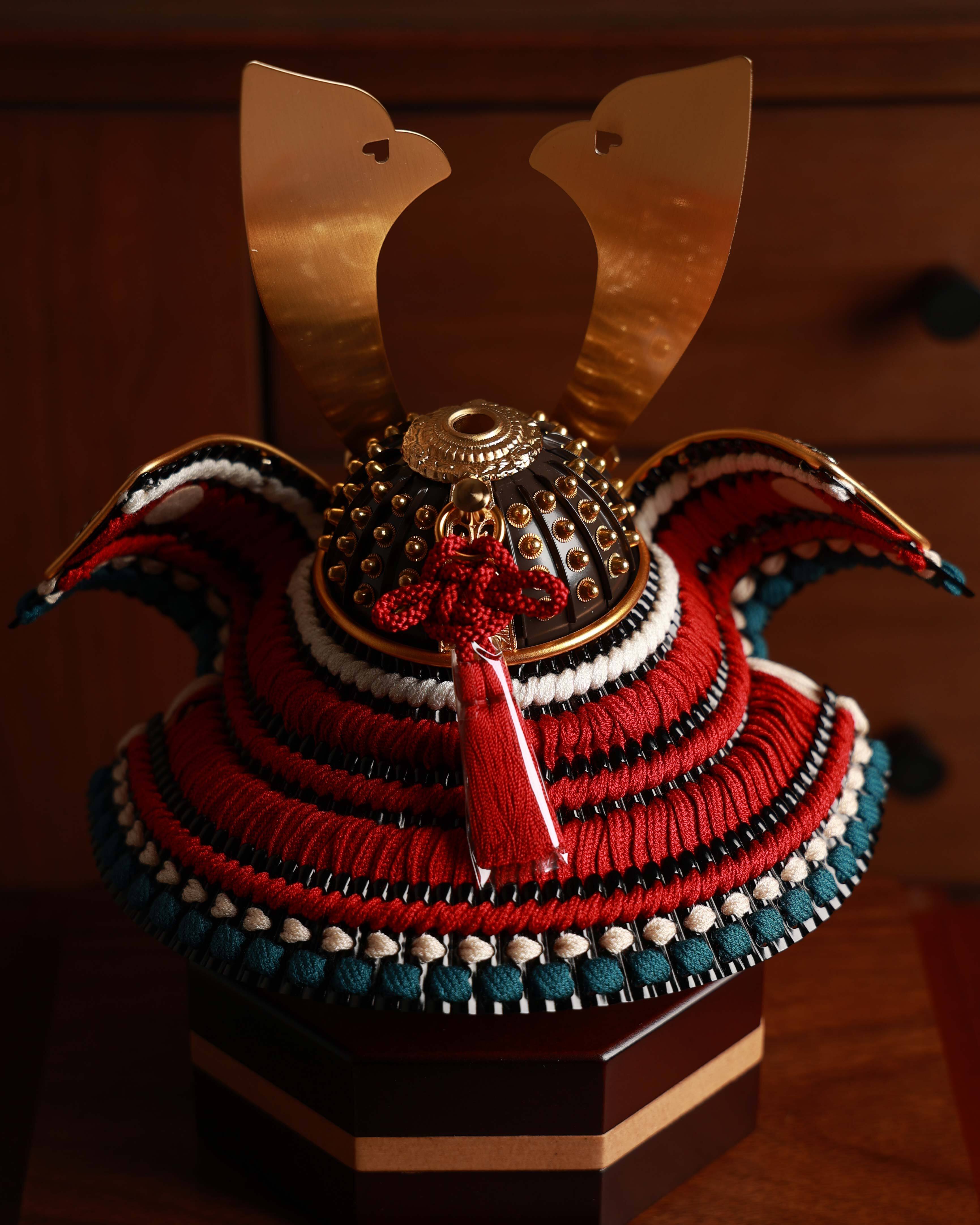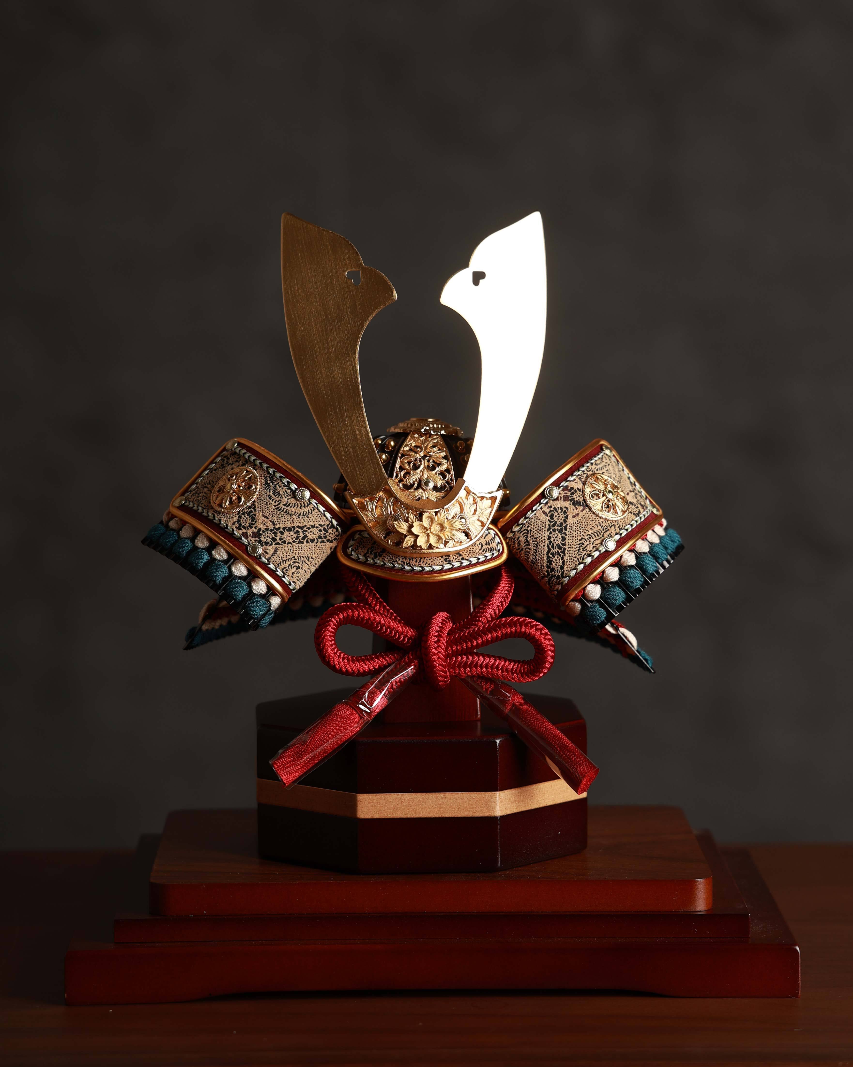 やわらかな曲線が印象的な木製フレームのケースが兜を上品に包み込み、背景には四角形のモチーフを配することで、家族の絆や広がる未来への願いを表現しています。