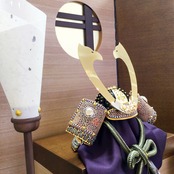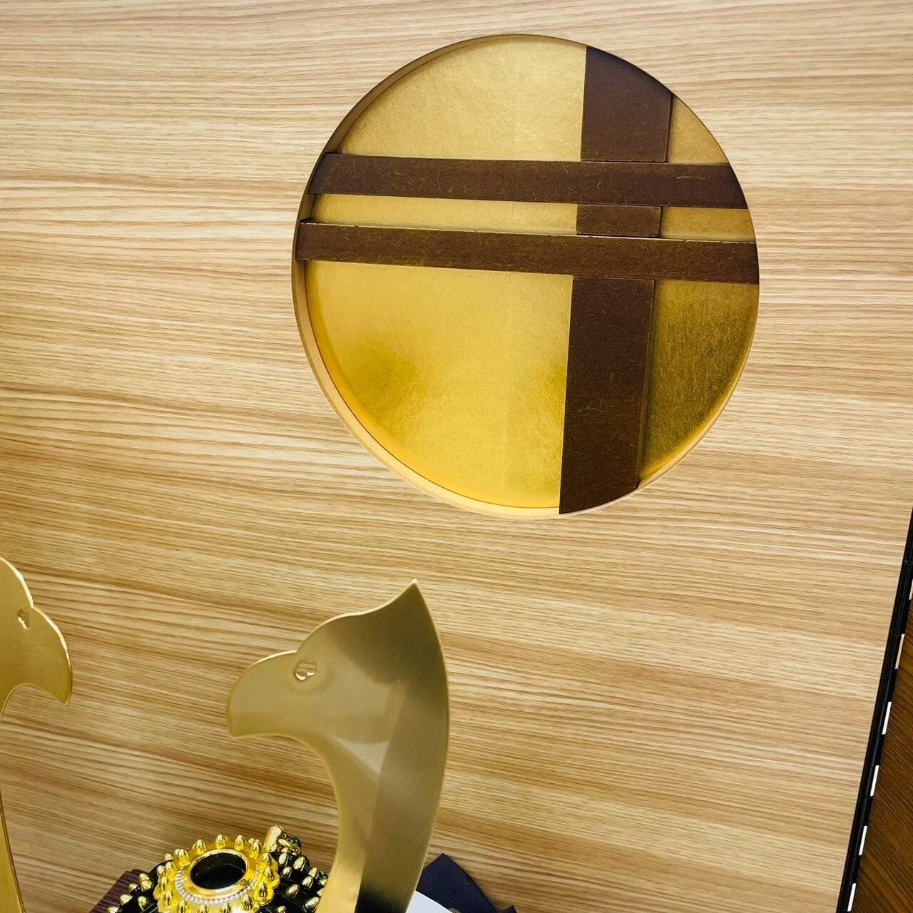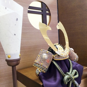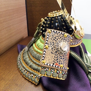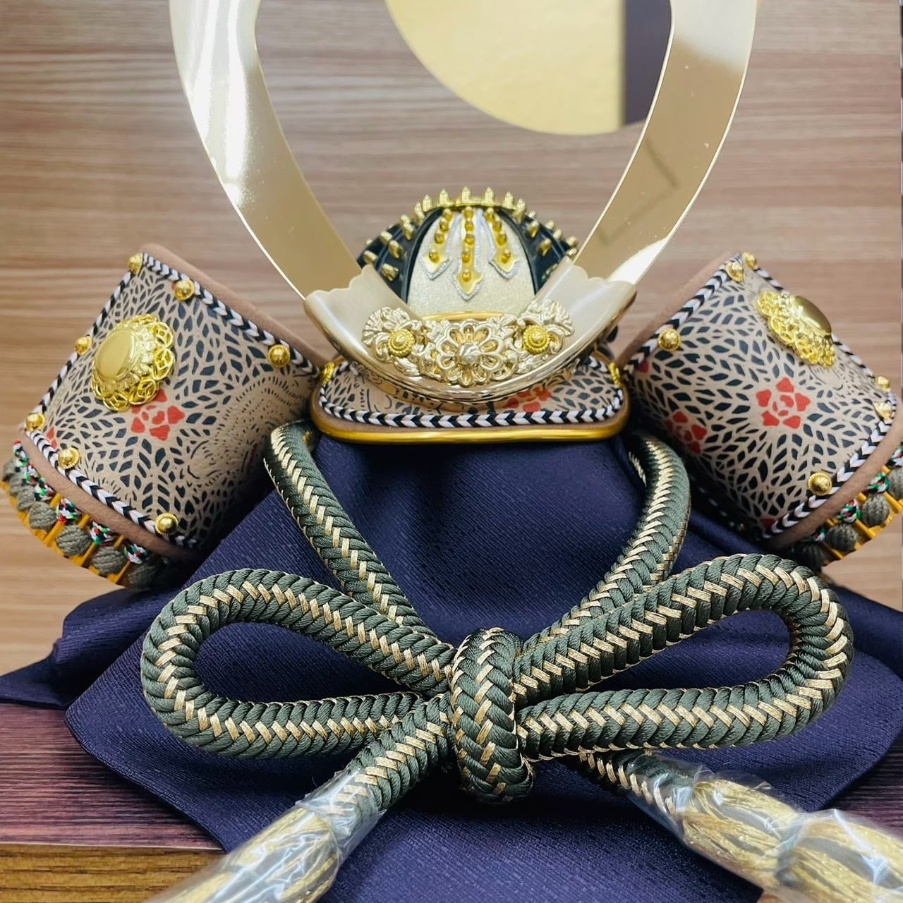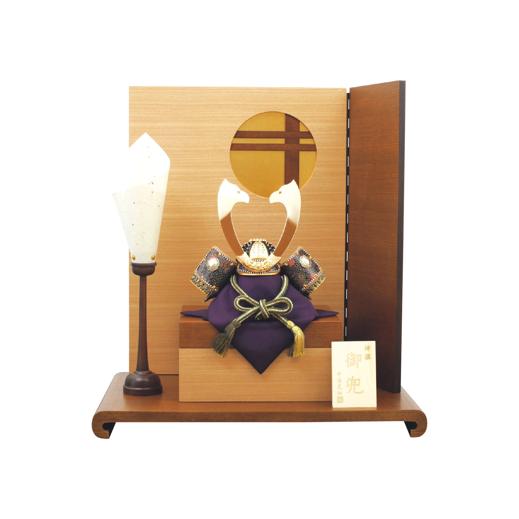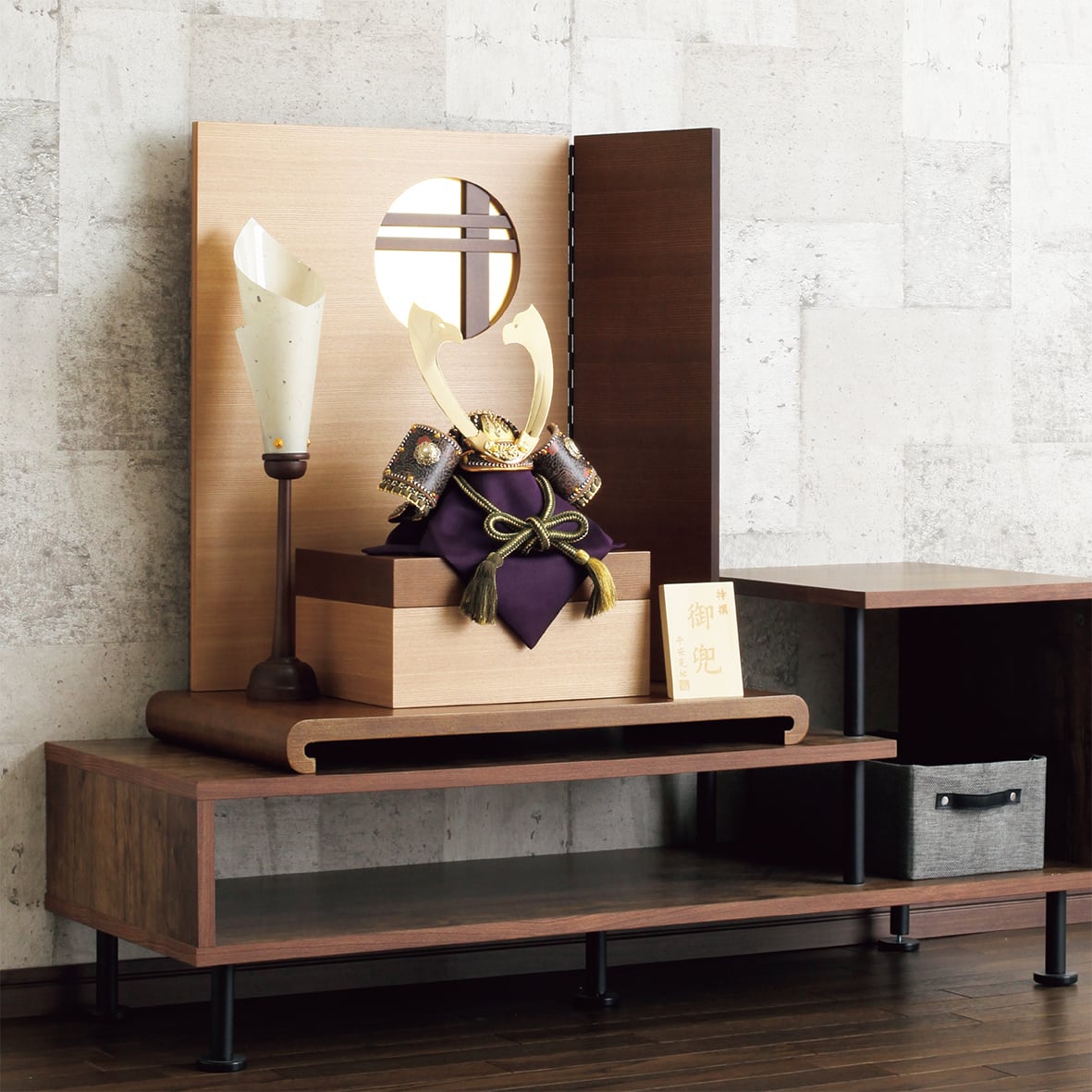 二色の木目調の飾台、屏風に落ち着いた雰囲気の兜を合せ、洋間にも合う兜飾りになっています。