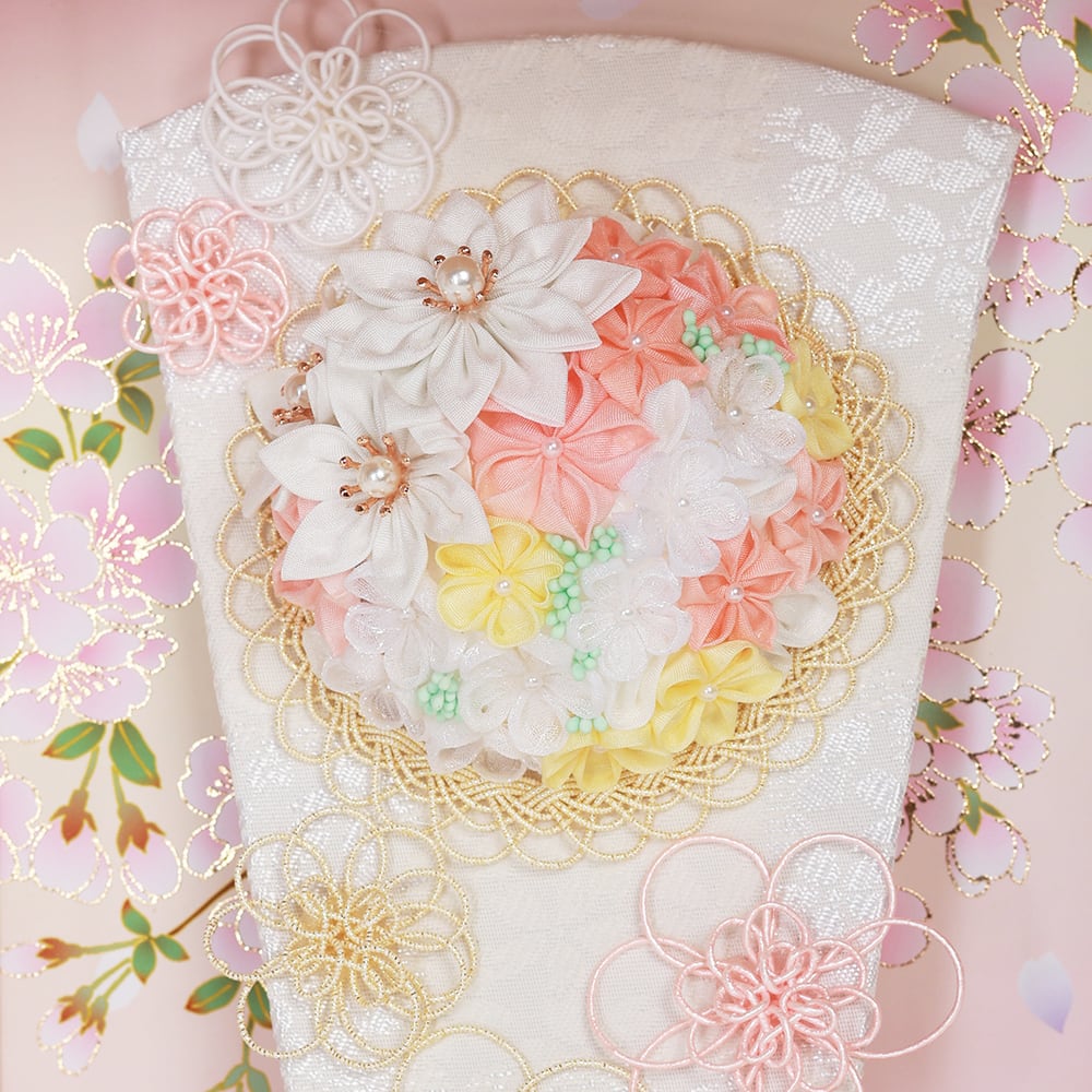 つまみ細工で作られたフラワーモチーフの羽子板